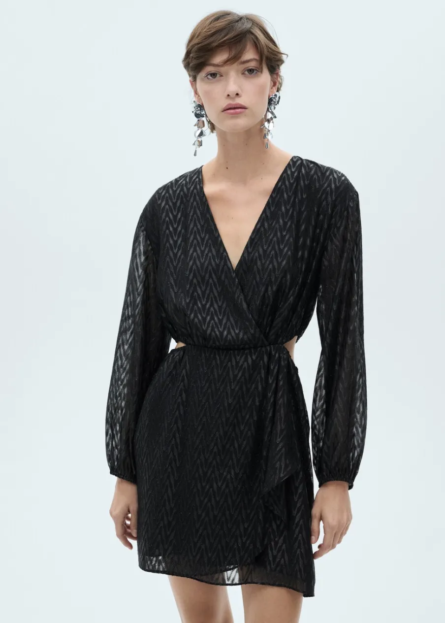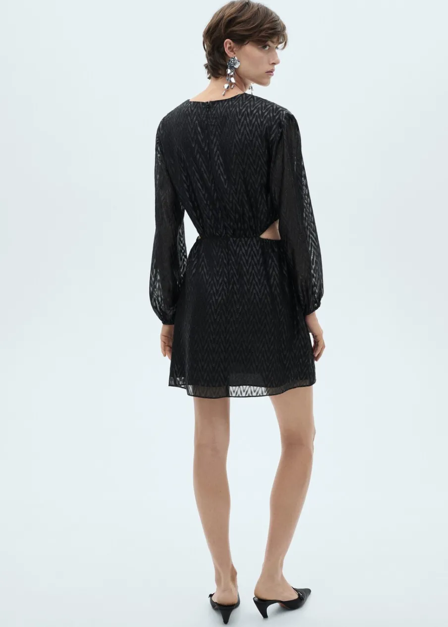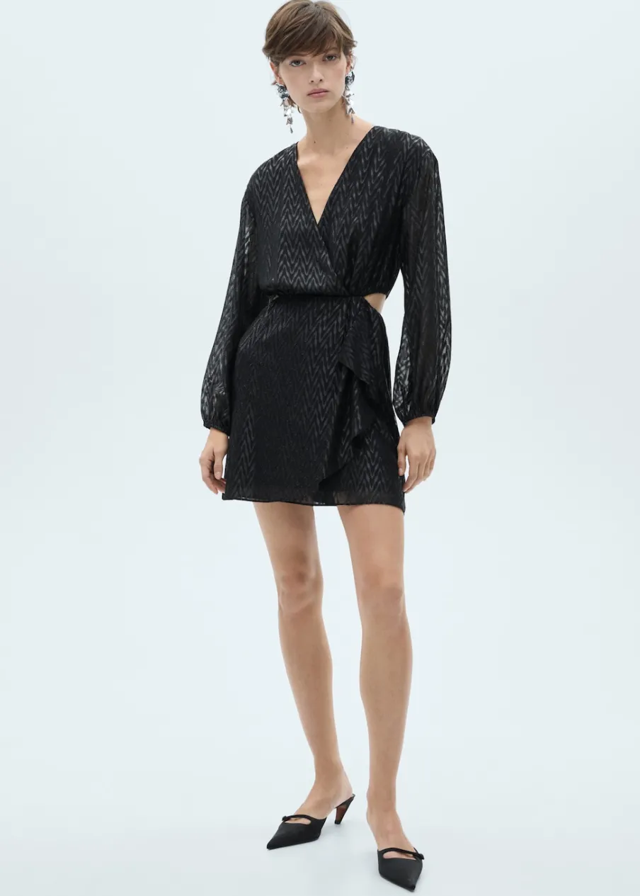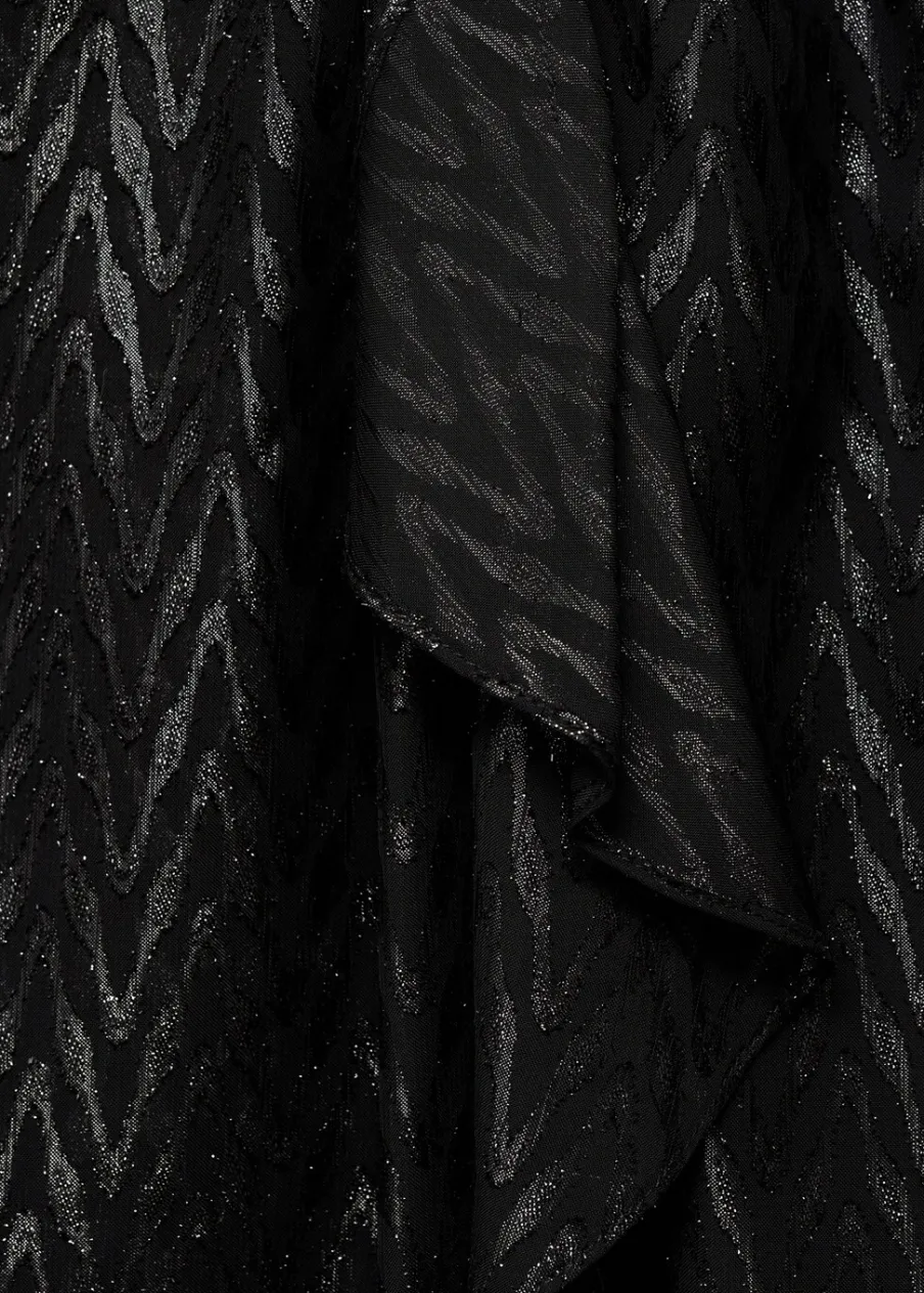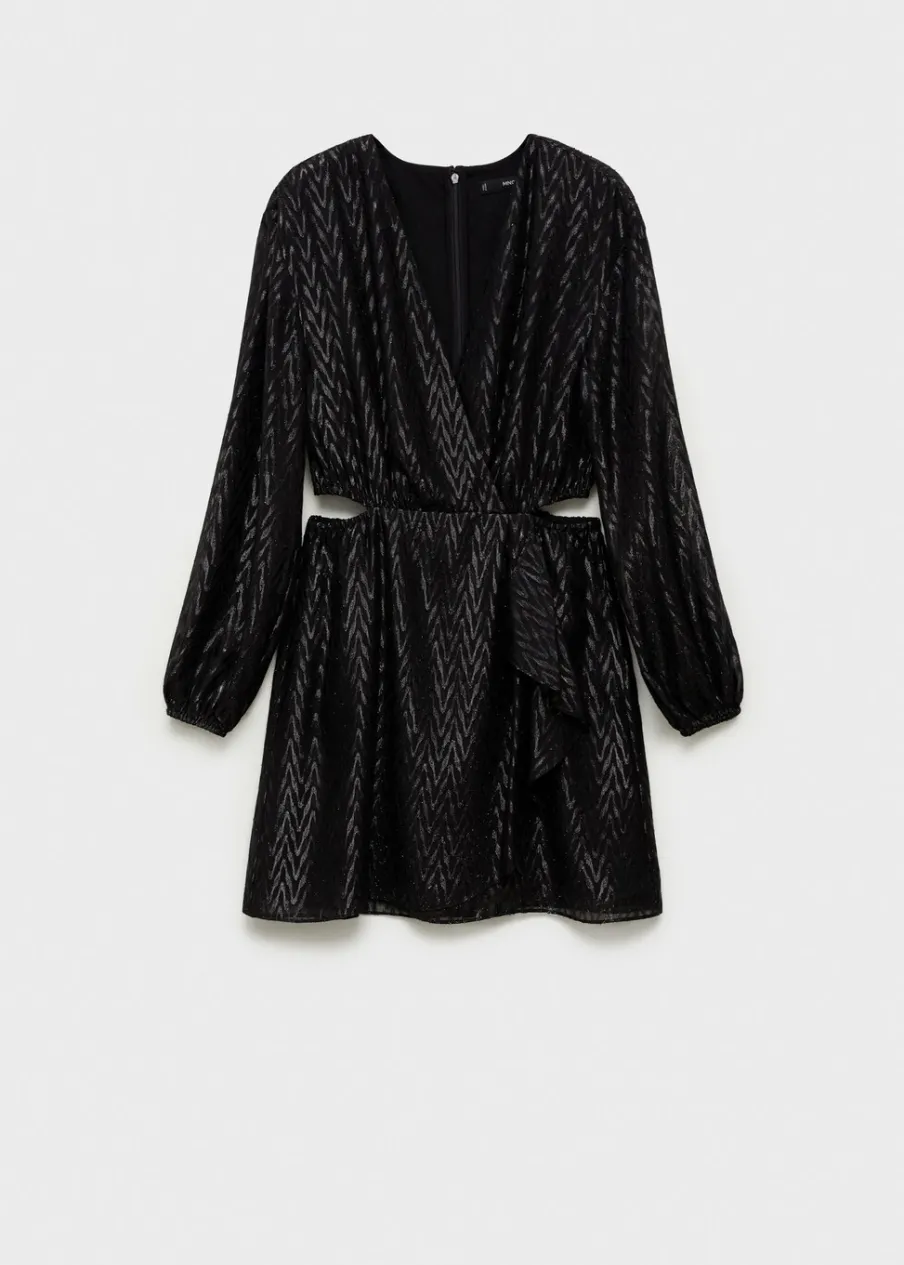 Lejąca tkanina. Model zakładany. Model evasé. Krótki krój. Zakładany kołnierz. Długi bufiasty rękaw. Zapięcie z tyłu na suwak. Błyszczące zdobienie. Wycięcie. Rozcięcia po bokach. Dostępne w Plus Size. Kolekcja wizytowa.