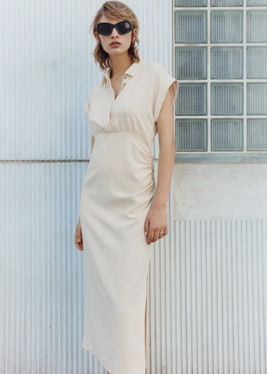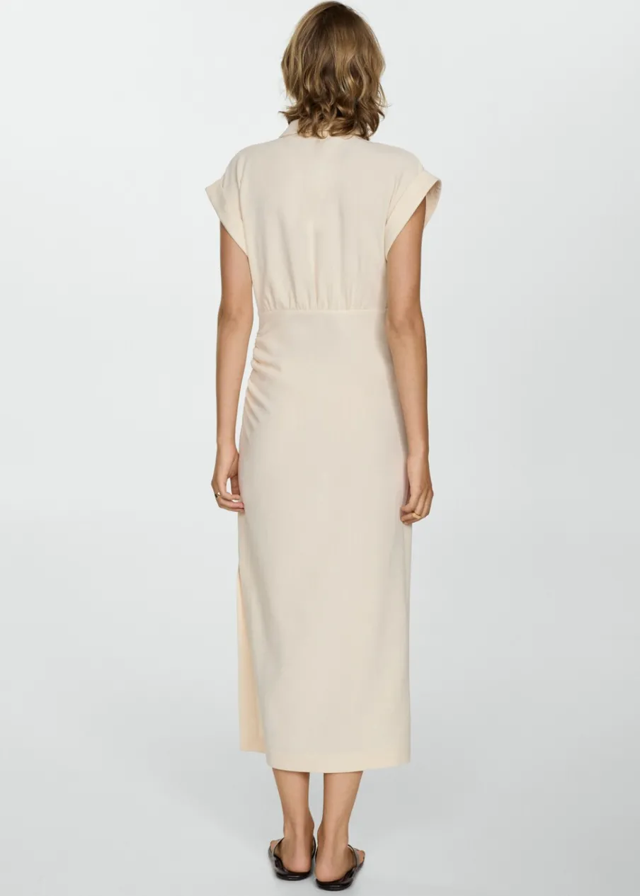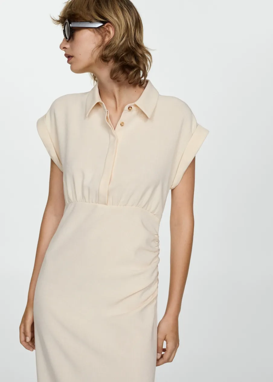 Lejąca tkanina. Krój do kolan. Koszulowy kołnierz. Krótki, wywinięty rękaw. Drapowane detale. Model wcięty. Kryte zapięcie na guziki z przodu.