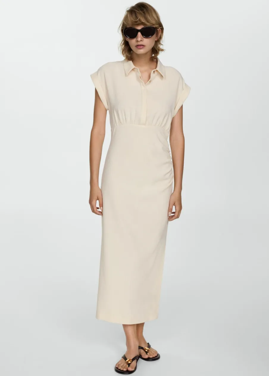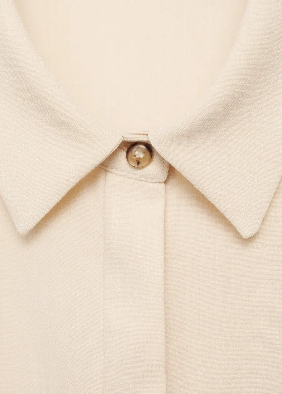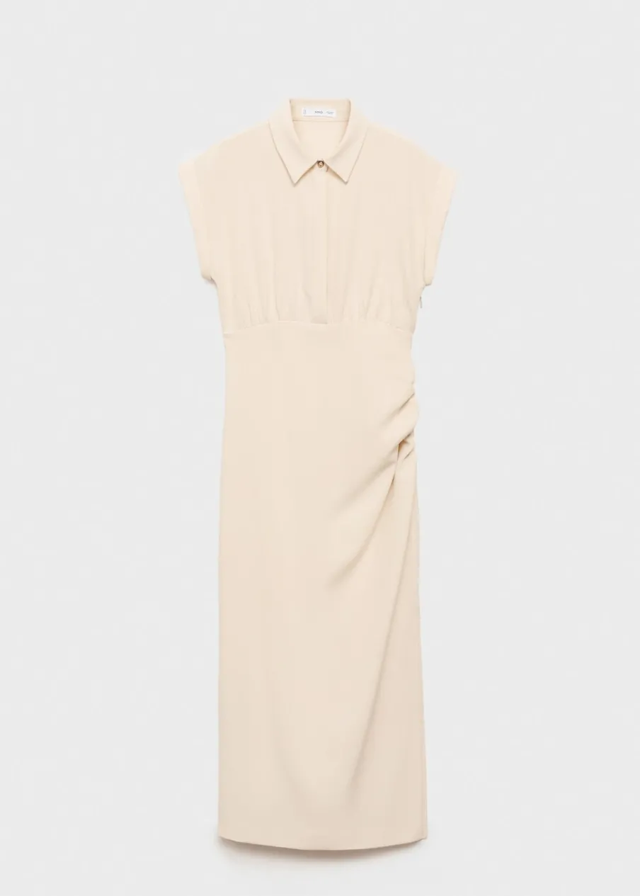 Lejąca tkanina. Krój do kolan. Koszulowy kołnierz. Krótki, wywinięty rękaw. Drapowane detale. Model wcięty. Kryte zapięcie na guziki z przodu.