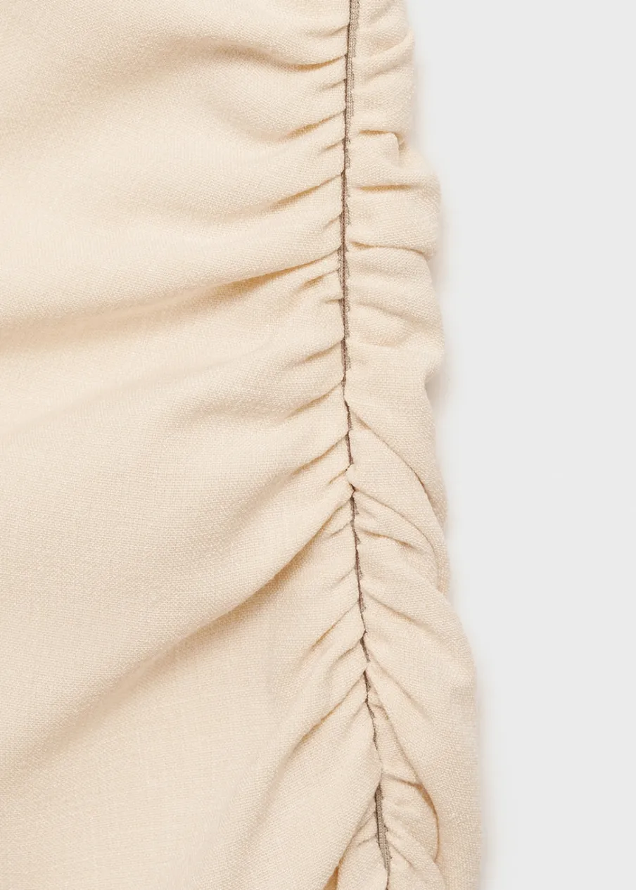 OpisLejąca tkanina. Krój do kolan. Koszulowy kołnierz. Krótki, wywinięty rękaw. Drapowane detale. Model wcięty. K…