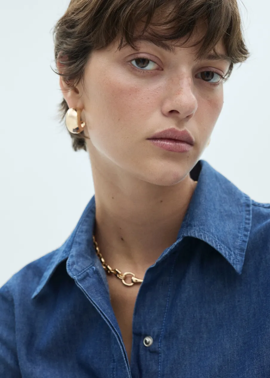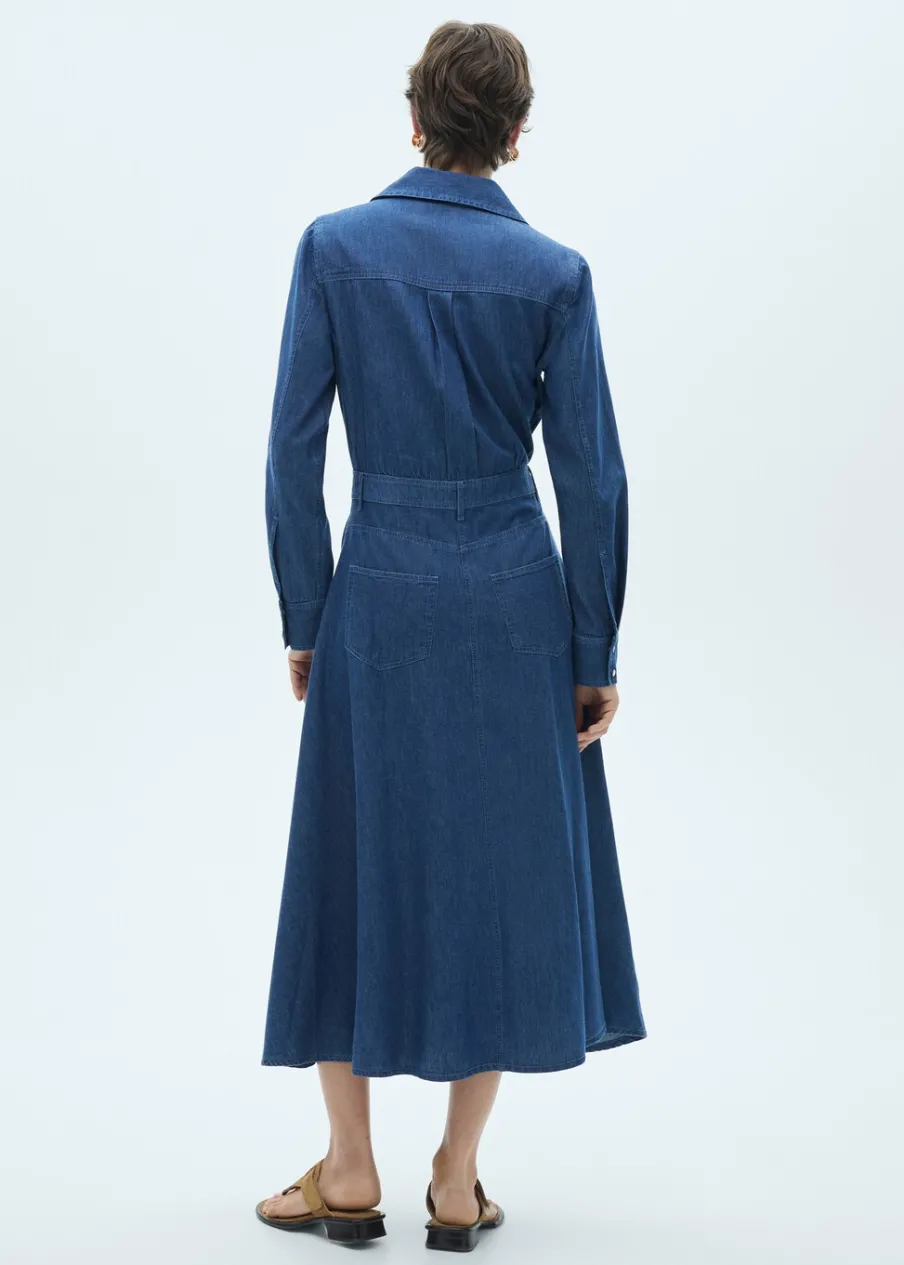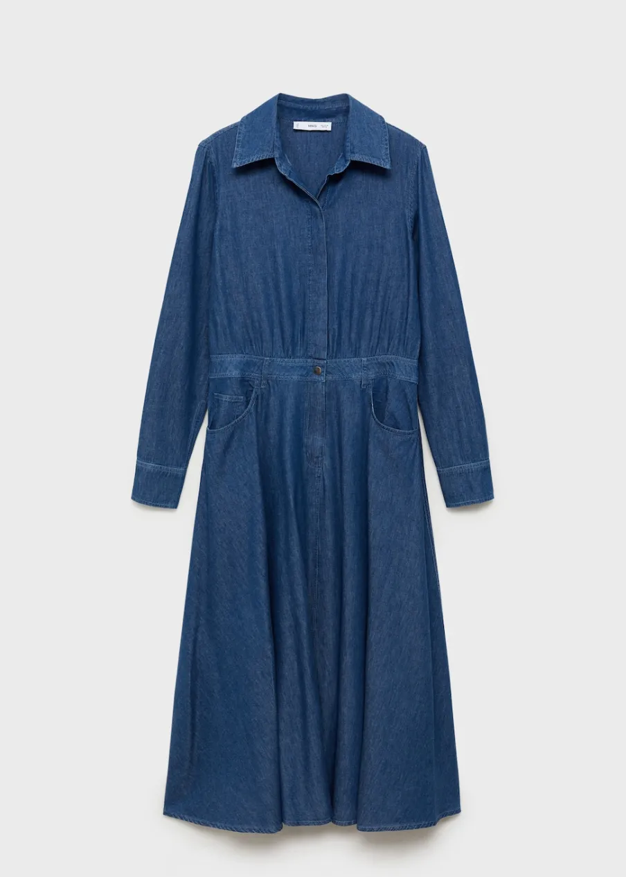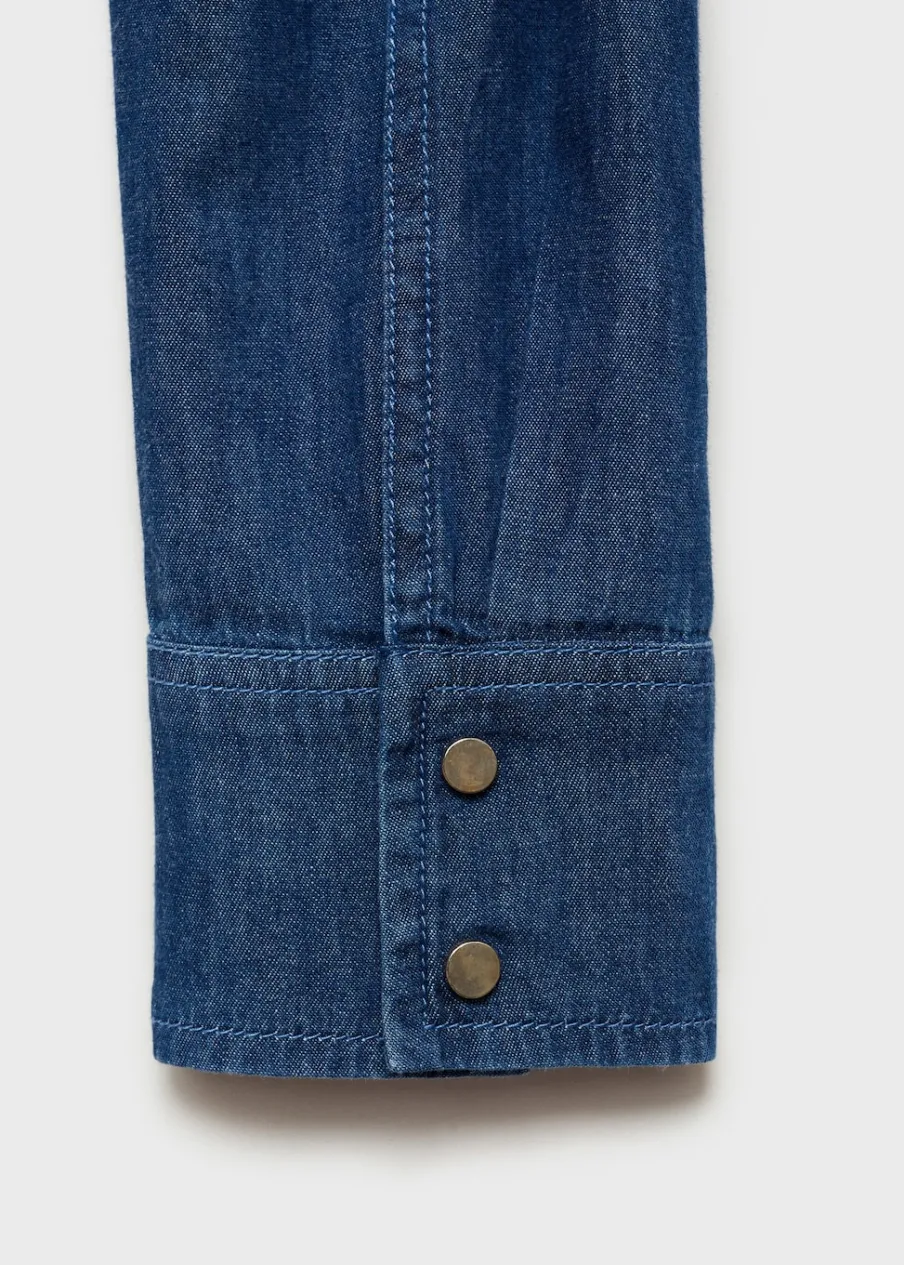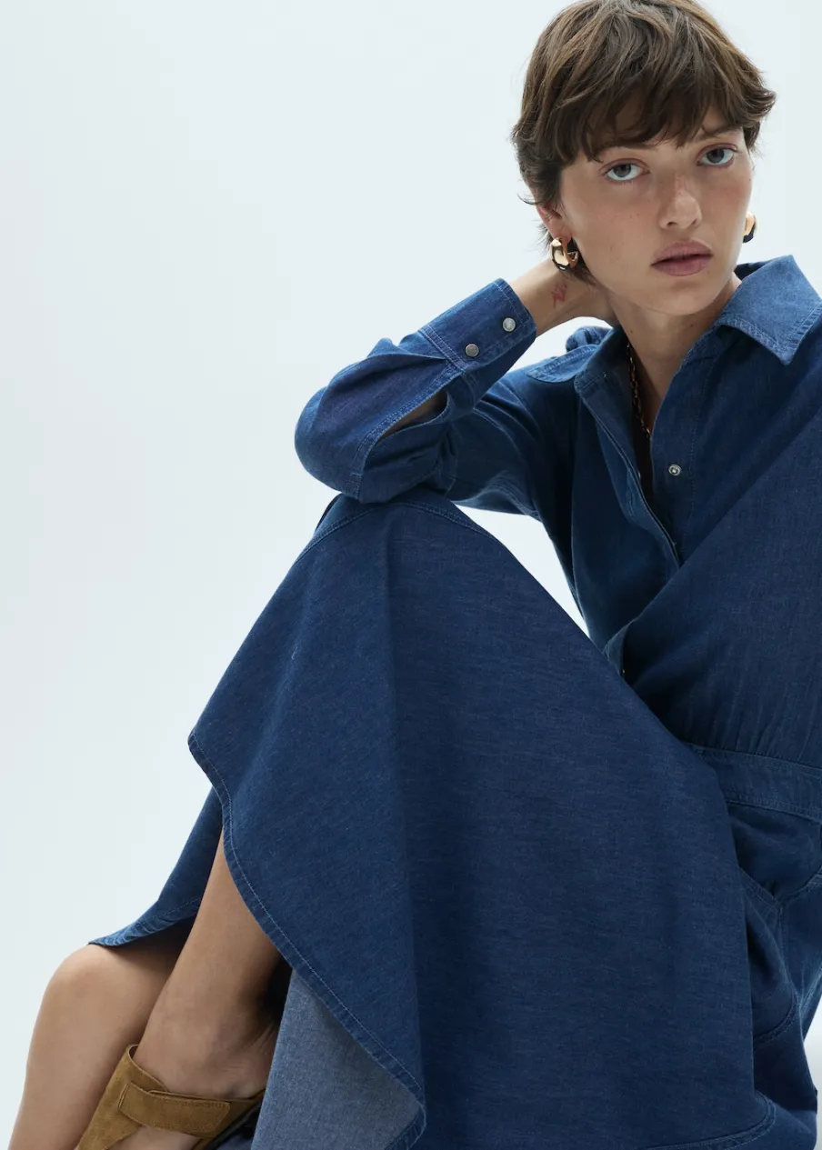 Tkanina bawełniana w dżinsowym stylu. Model evasé. Styl koszulowy. Koszulowy kołnierz. Modelka ma 174 cm wzrostu i nosi rozmiar S/36. Krój do kolan. Długi rękaw z guzikami na mankietach. Zapięcie na zatrzaski z przodu.