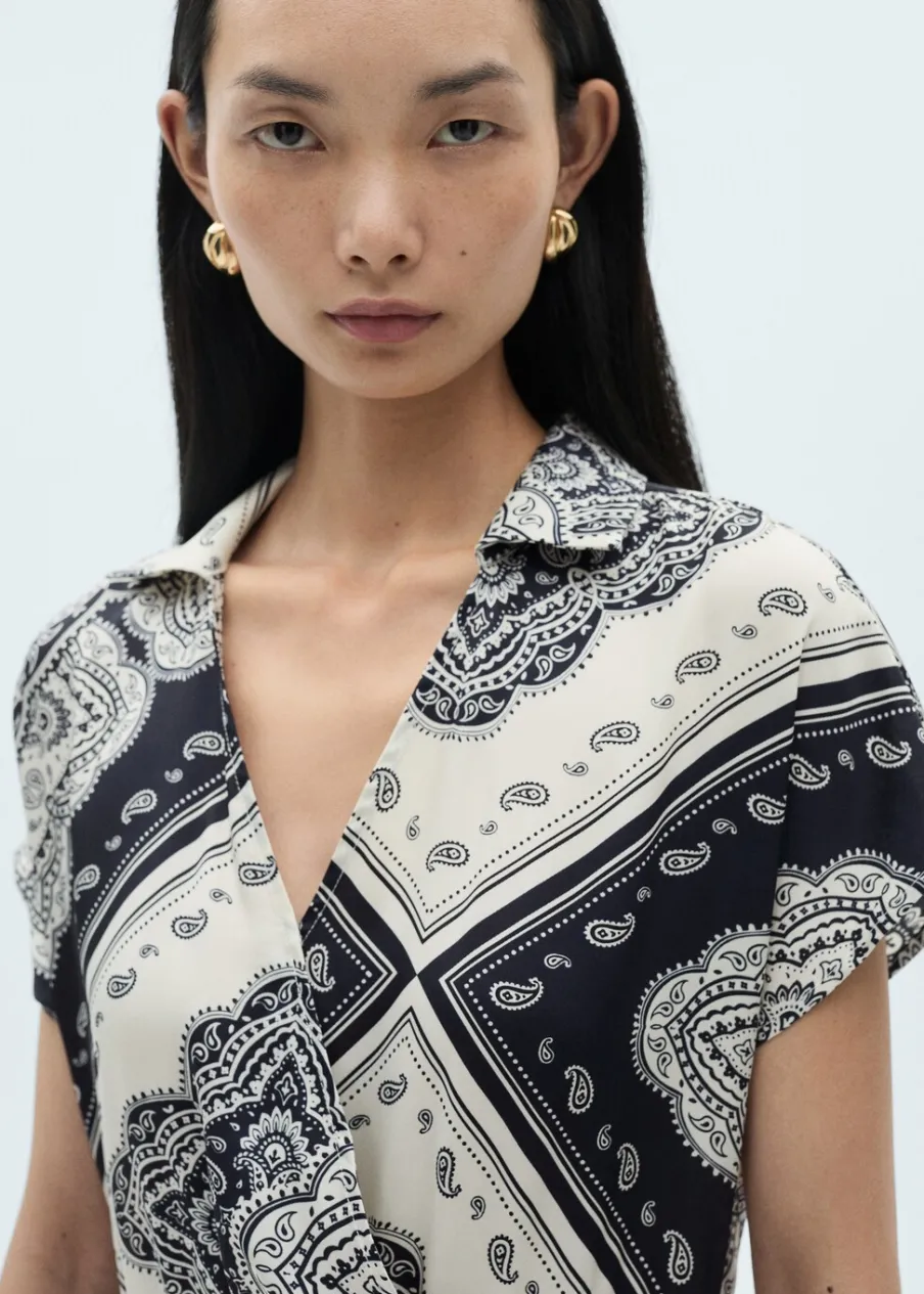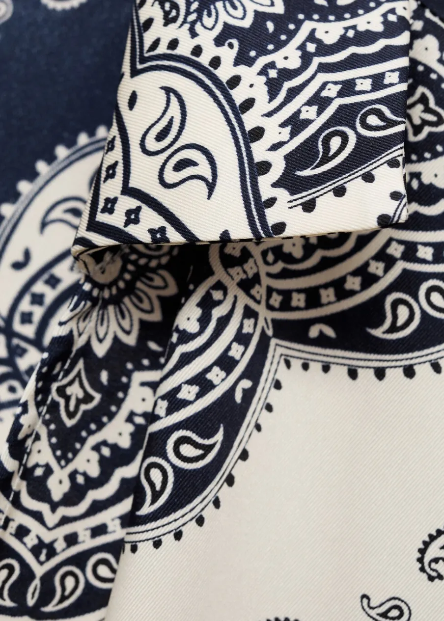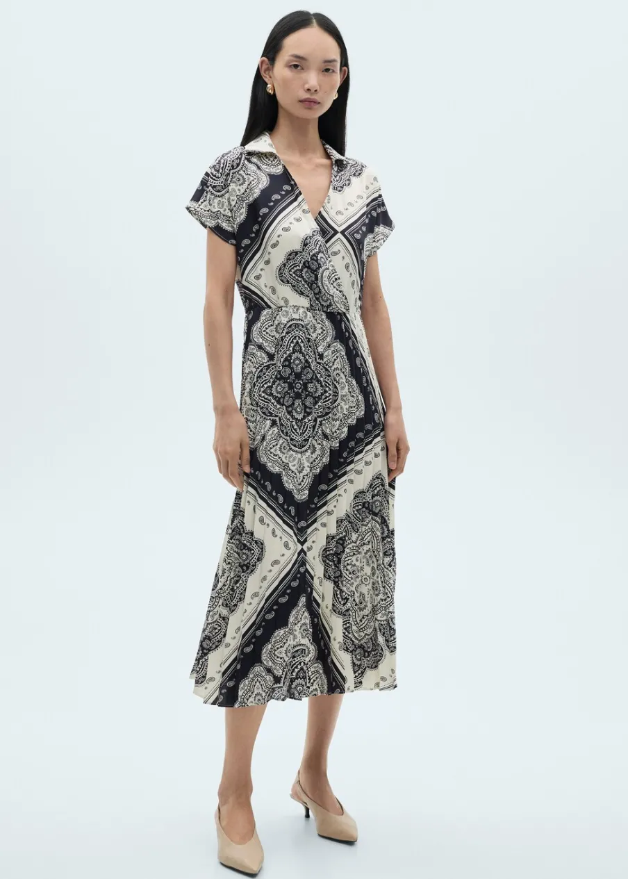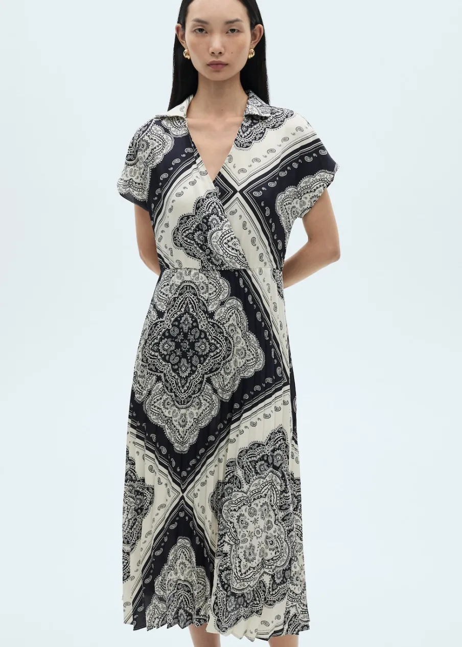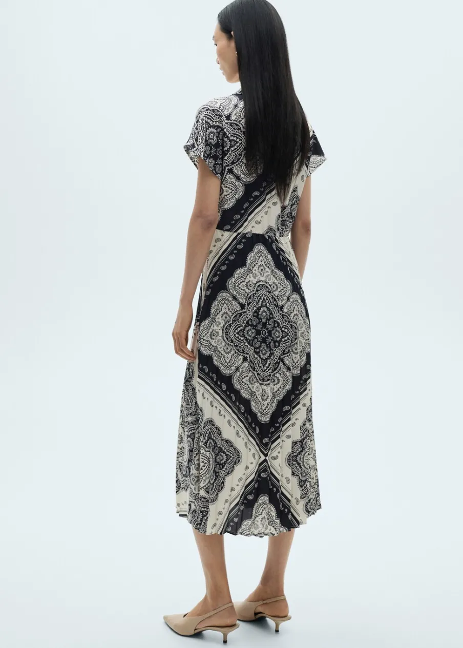 Lejąca tkanina. Wzór paisley. Krój do kolan. Zakładany dekolt V. Model evasé. Styl koszulowy. Plisowana spódnica. Koszulowy kołnierz. Krótki rękaw.