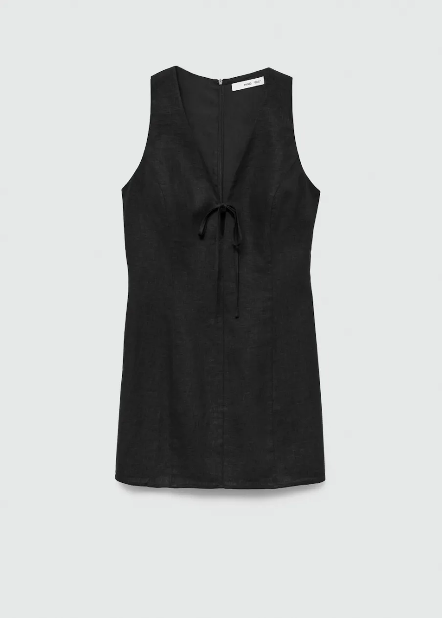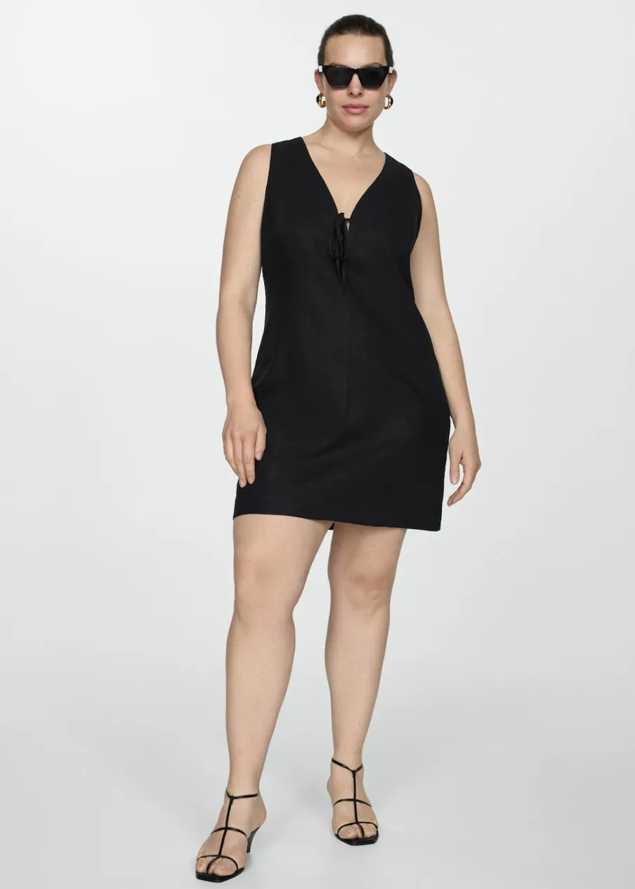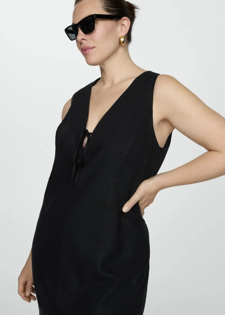 Tkanina z mieszanki lnu. Krótki krój. Model prosty. Dekolt V. Bez rękawów. Szerokie ramiączka. Zapięcie z tyłu na kryty suwak. Ozdobna kokardka. Wewnętrzna podszewka. Dostępne w Plus Size.
