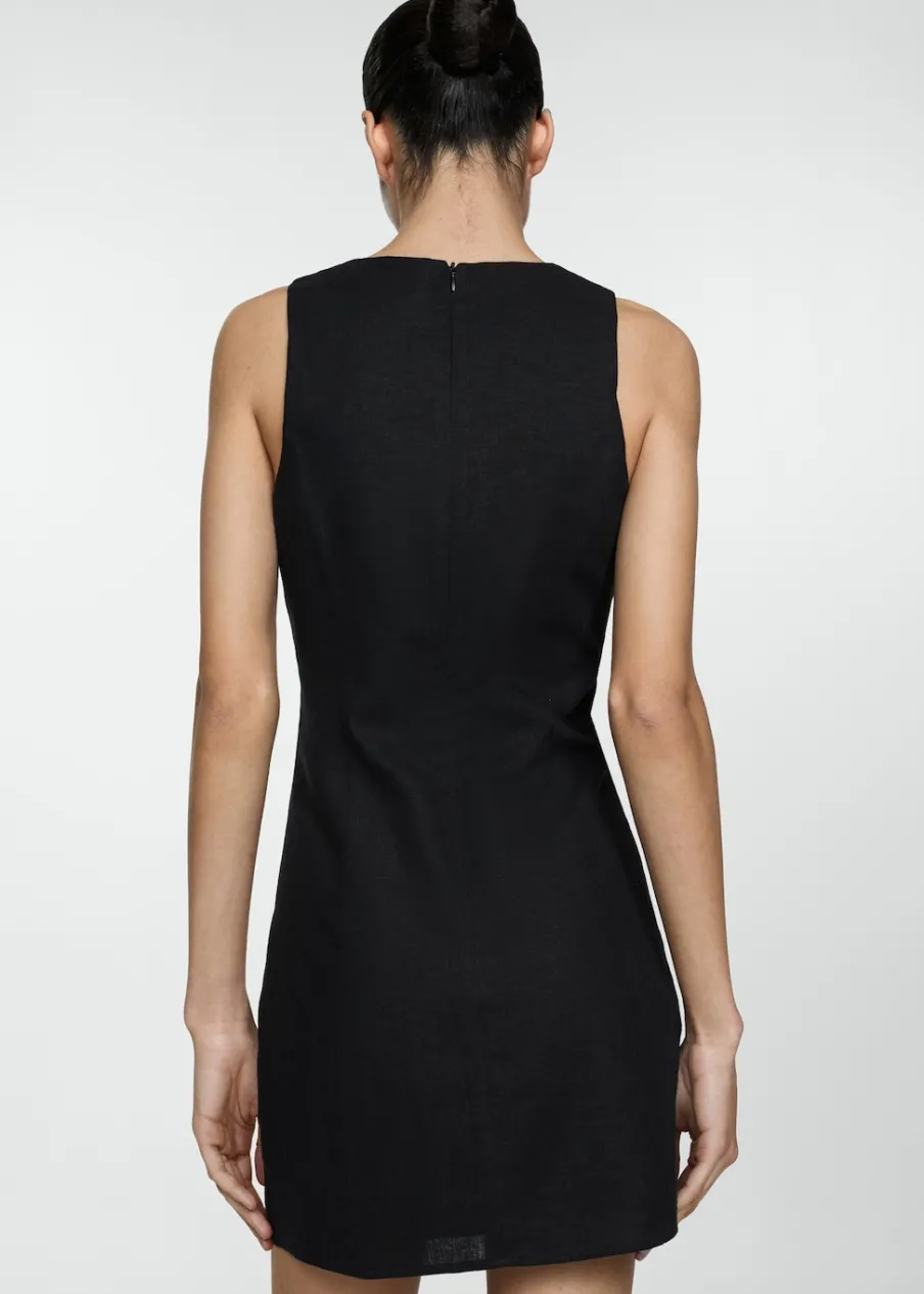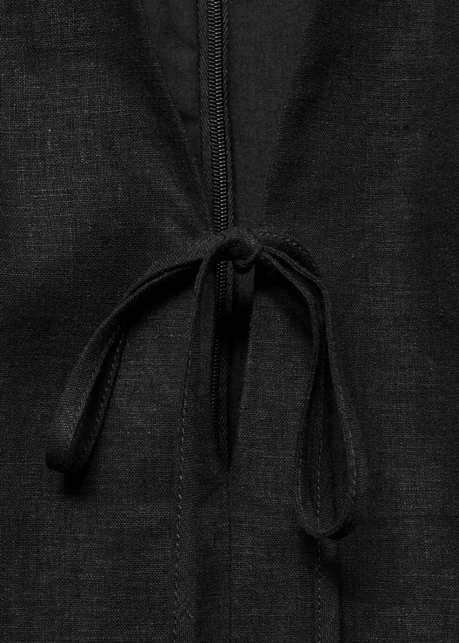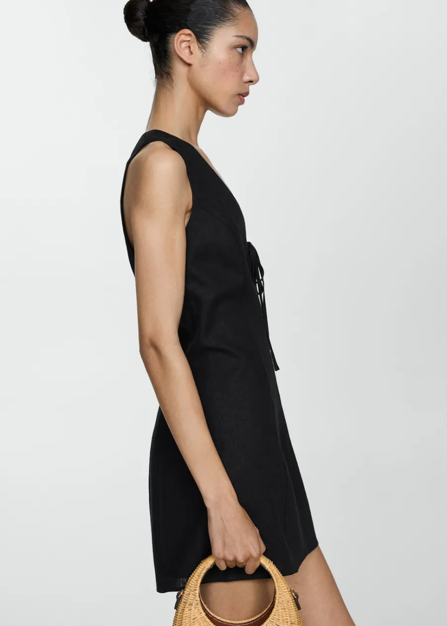 Tkanina z mieszanki lnu. Krótki krój. Model prosty. Dekolt V. Bez rękawów. Szerokie ramiączka. Zapięcie z tyłu na kryty suwak. Ozdobna kokardka. Wewnętrzna podszewka. Dostępne w Plus Size.
