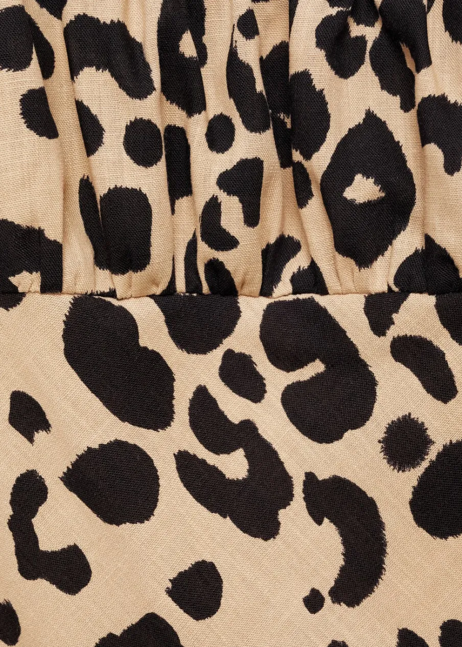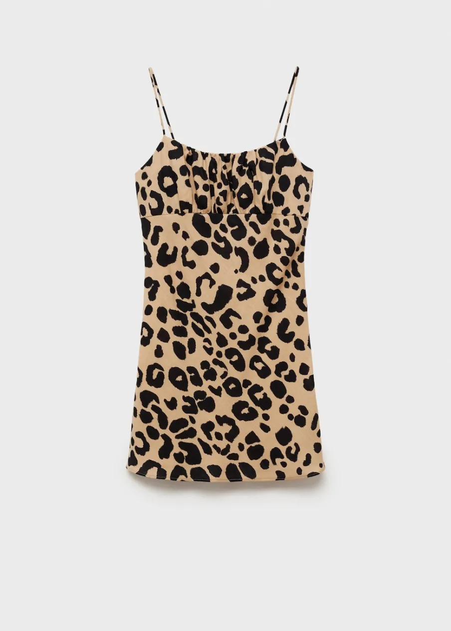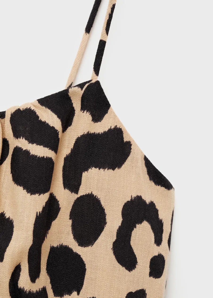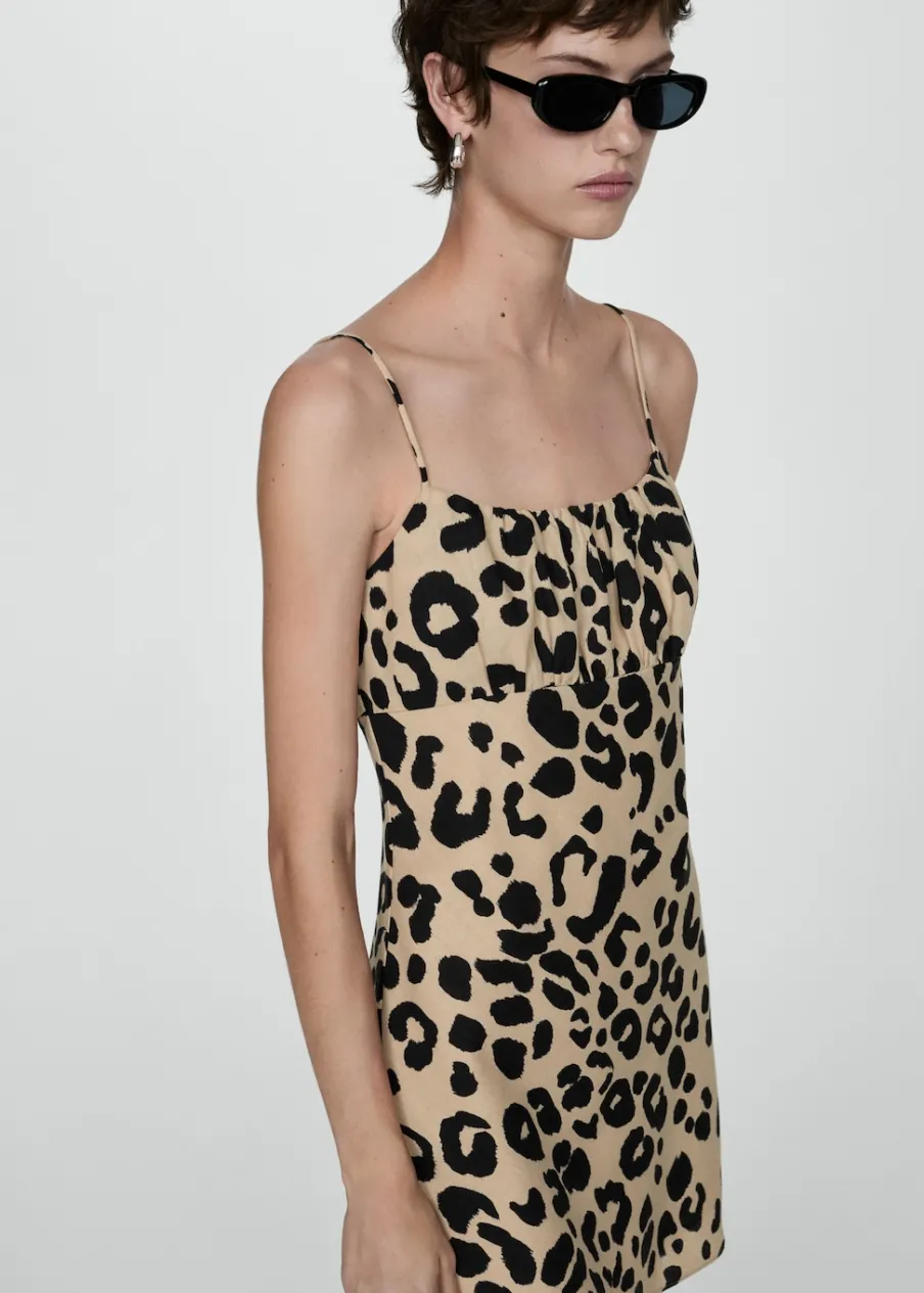 Lejąca tkanina. Model prosty. Krótki krój. Wzór w lamparcie cętki. Zwierzęcy wzór. Kwadratowy dekolt. Bez rękawów. Cienkie ramiączka. Kryte zapięcie na zamek z boku. Wewnętrzna podszewka.