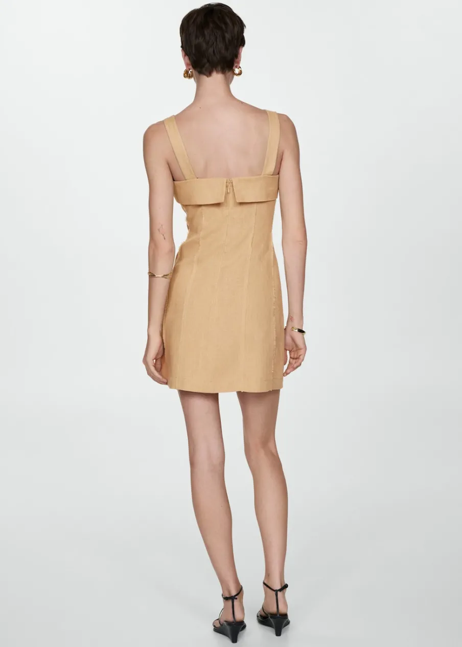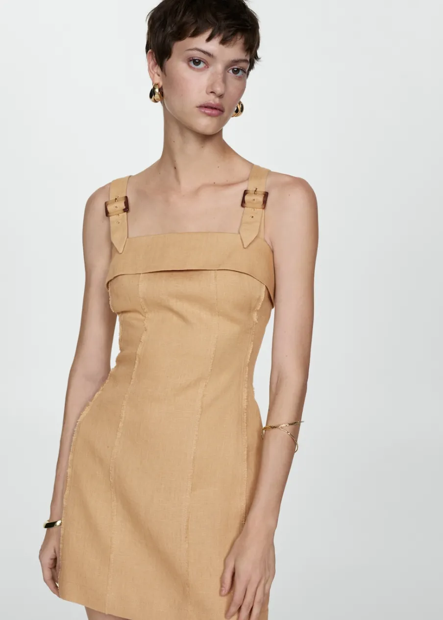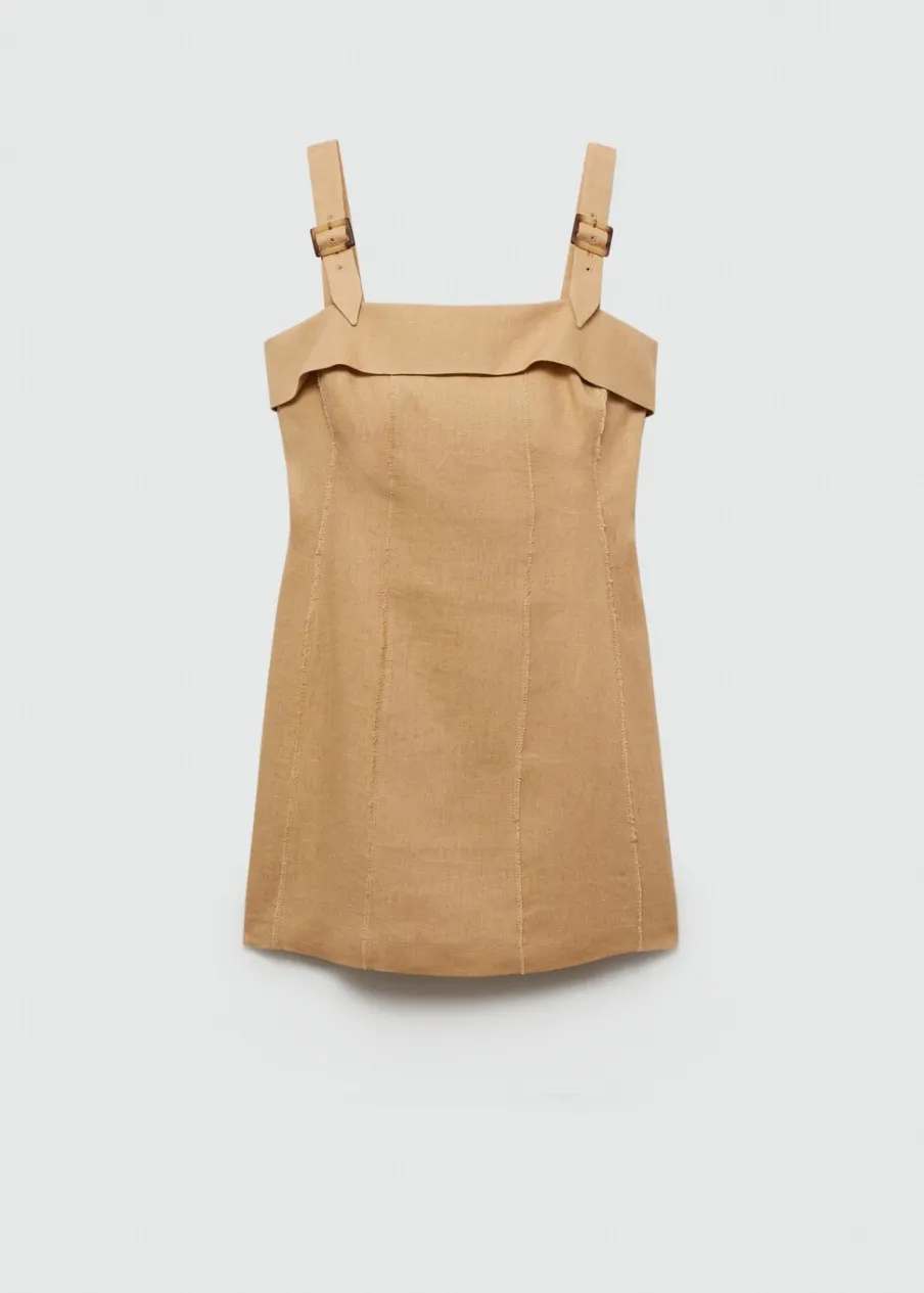 Tkanina z 100% lnu. Krótki krój. Kwadratowy dekolt. Bez rękawów. Szerokie ramiączka. Zapięcie z tyłu na kryty suwak. Ozdobne klamry. Sezon festiwalowy. Wywijany dekolt. Model wcięty.
