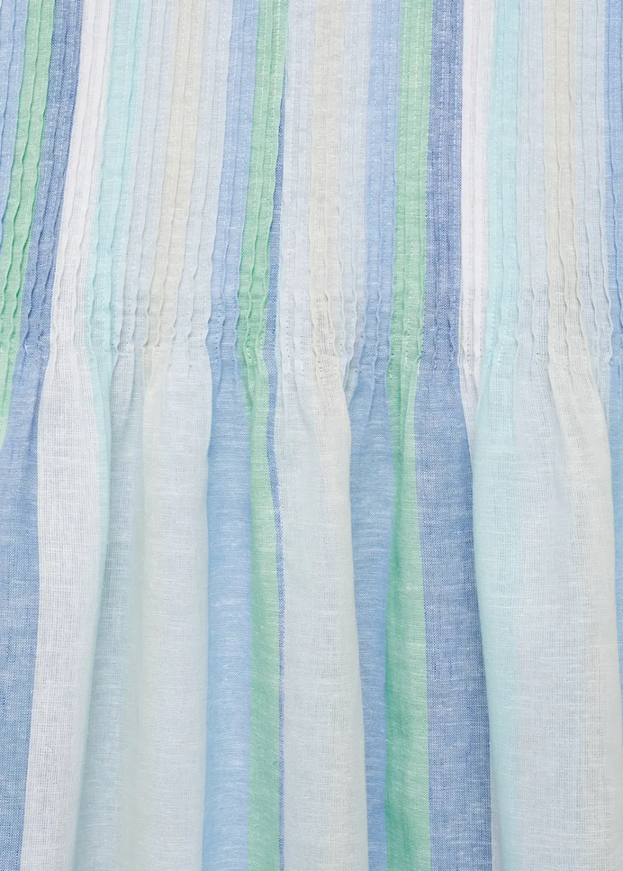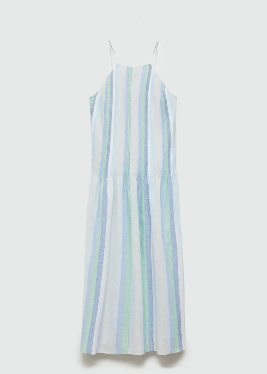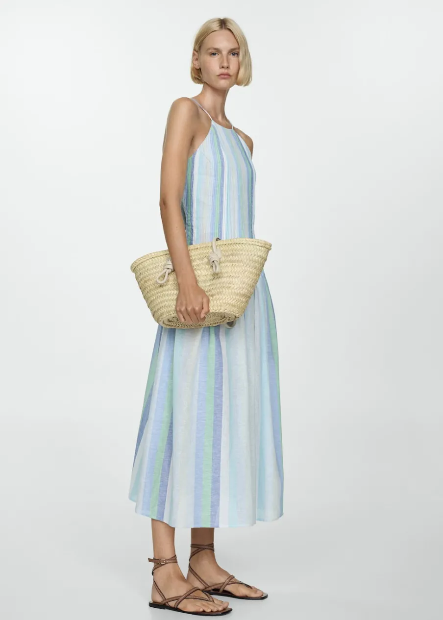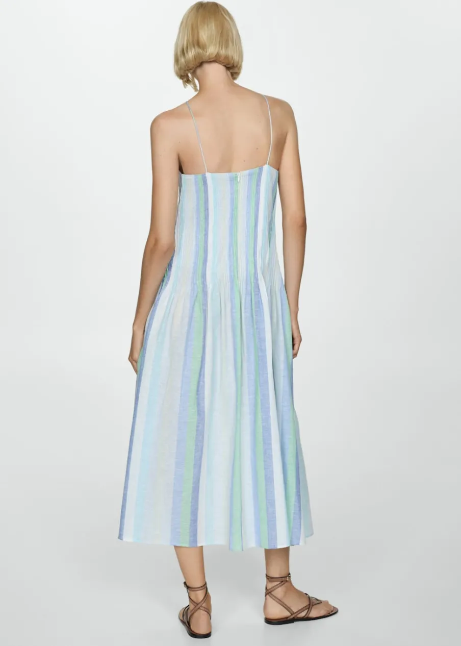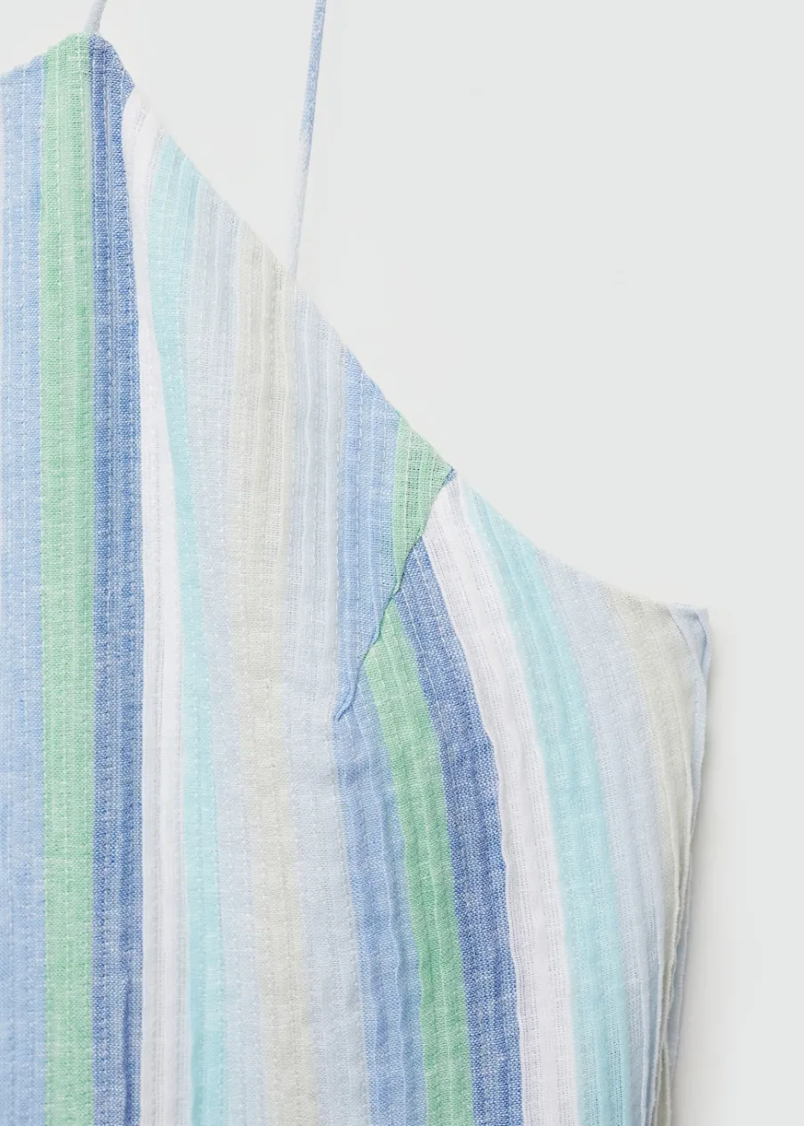 Tkanina z mieszanki lnu i bawełny. Model evasé. Model w dużym rozmiarze. Model długi. Okrągły dekolt. Bez rękawów. Cienkie ramiączka. Bez zapięcia. Wzór w paski.