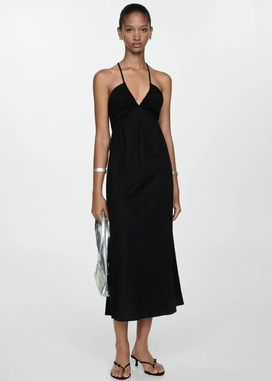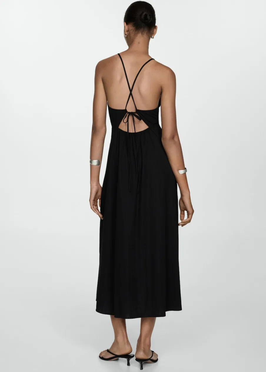 OpisSzabad esésű anyag, evasé modell, midi design, v-nyakkivágás, vékony pánt, dekoltált hátrész, masnis rögz…