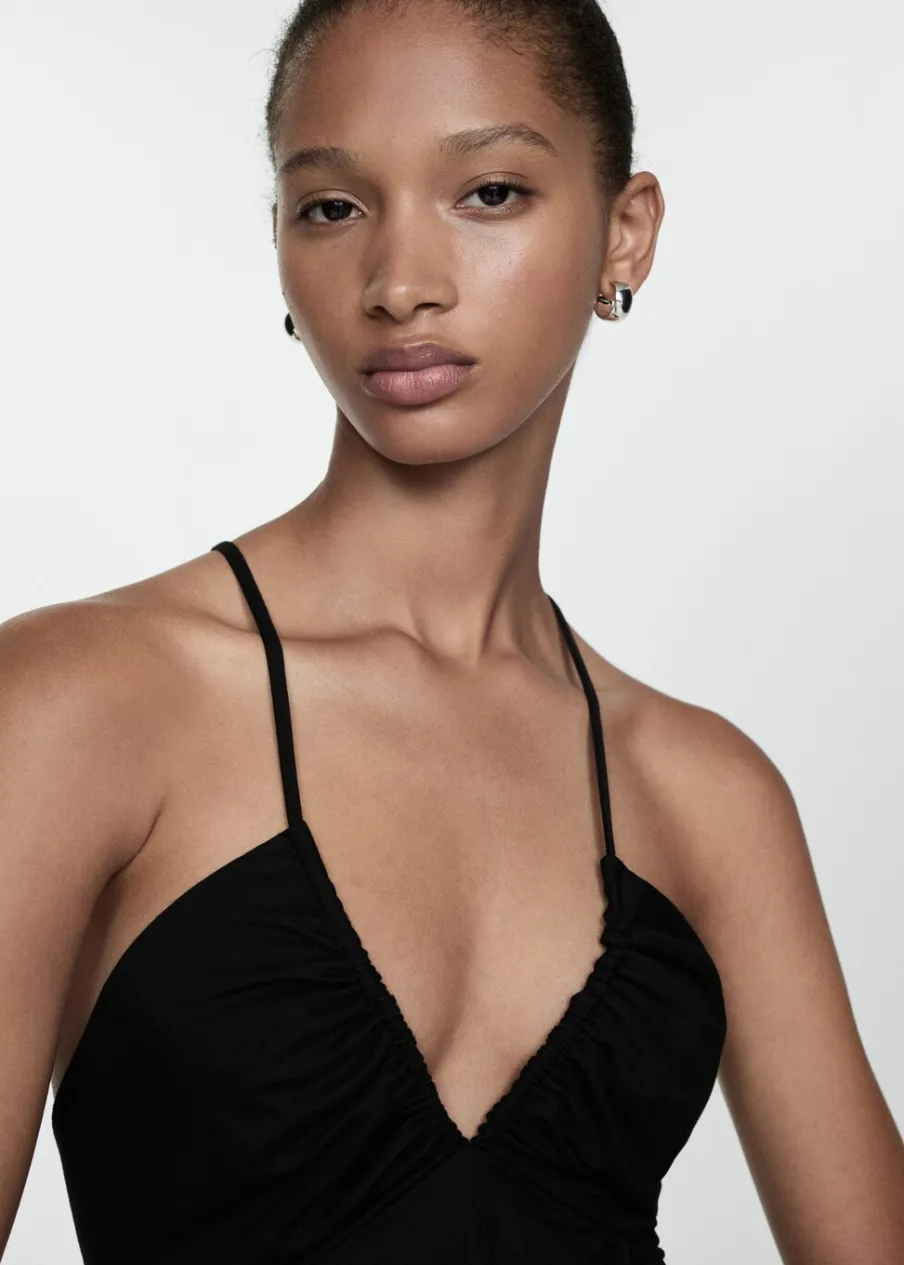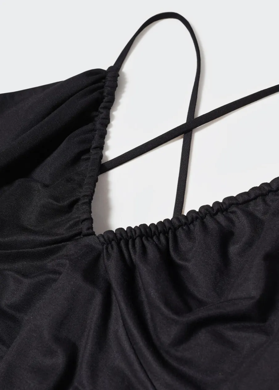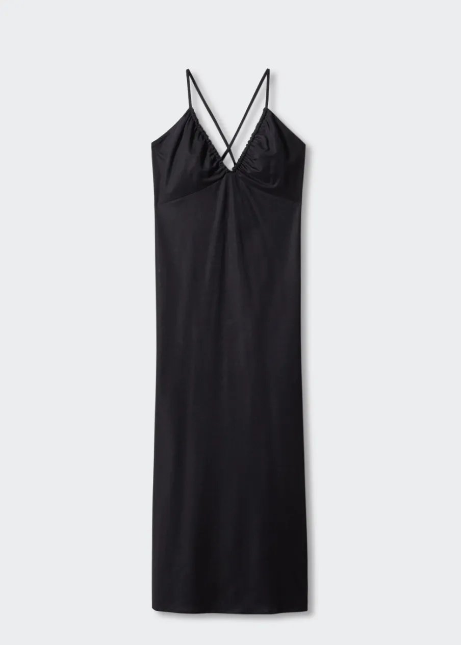 Szabad esésű anyag, evasé modell, midi design, v-nyakkivágás, vékony pánt, dekoltált hátrész, masnis rögzítéssel hátul, ráncolt részletek.