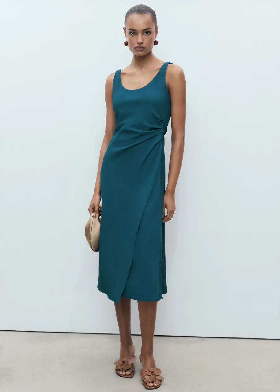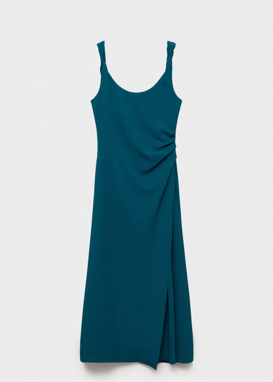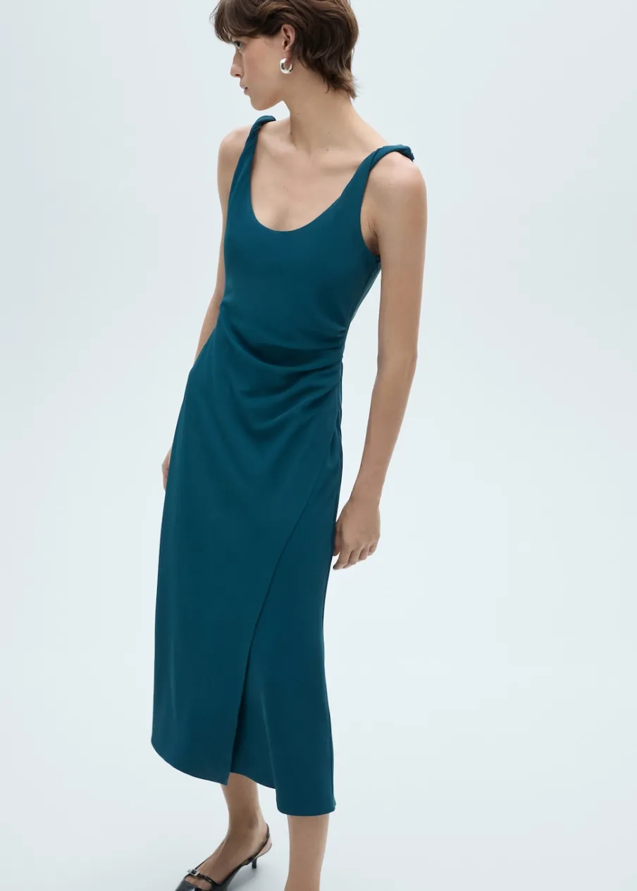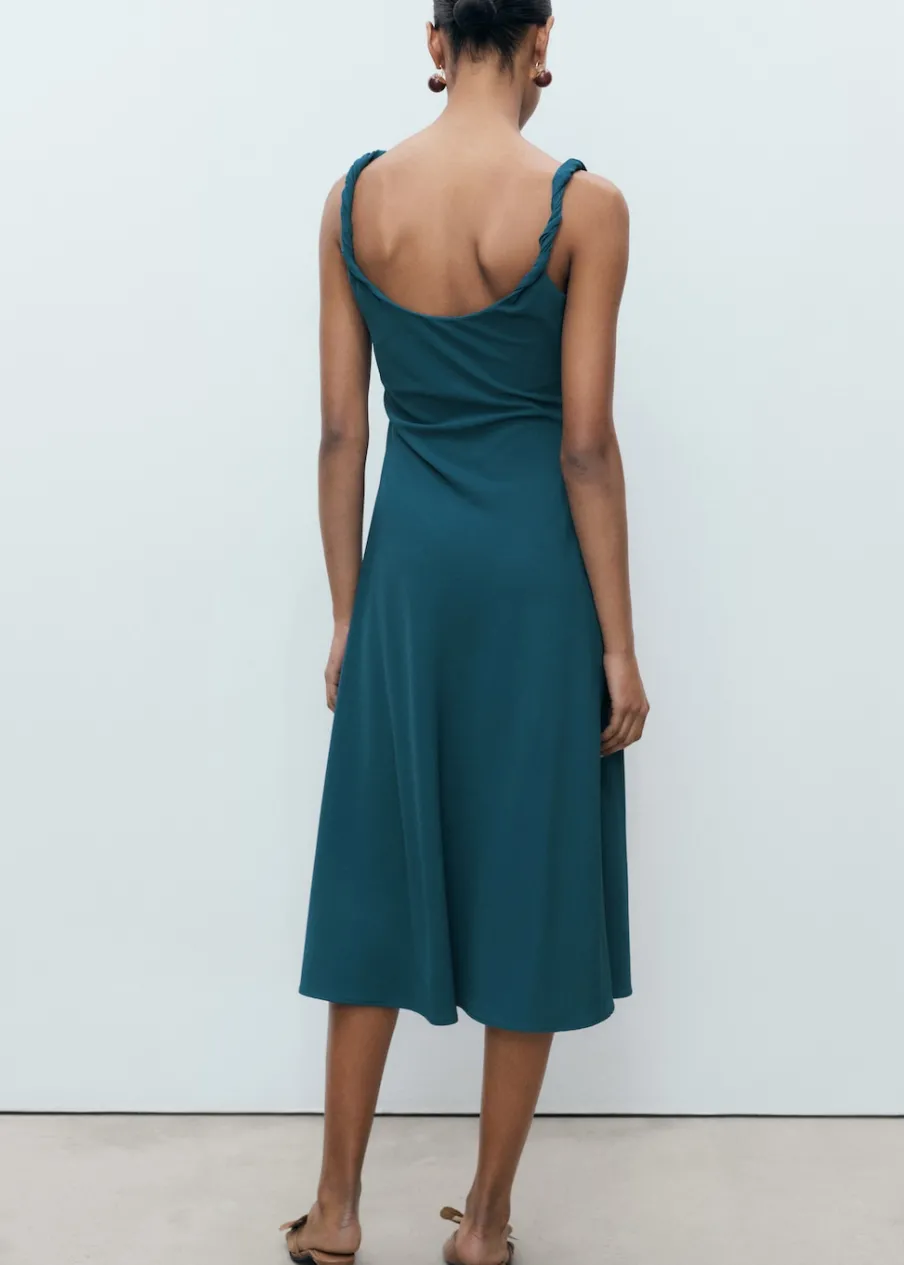 Lejąca tkanina. Cienka tkanina. Krój do kolan. Model evasé. Dekolt. Cienkie ramiączka. Zapięcie na zamek z boku. Marszczenie w talii. Bez podszewki.