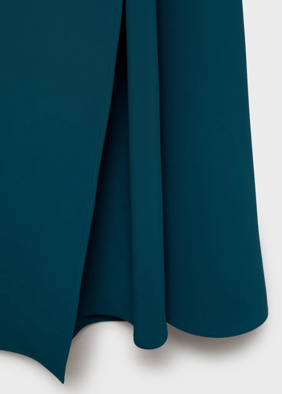 OpisLejąca tkanina. Cienka tkanina. Krój do kolan. Model evasé. Dekolt. Cienkie ramiączka. Zapięcie na zamek z boku…