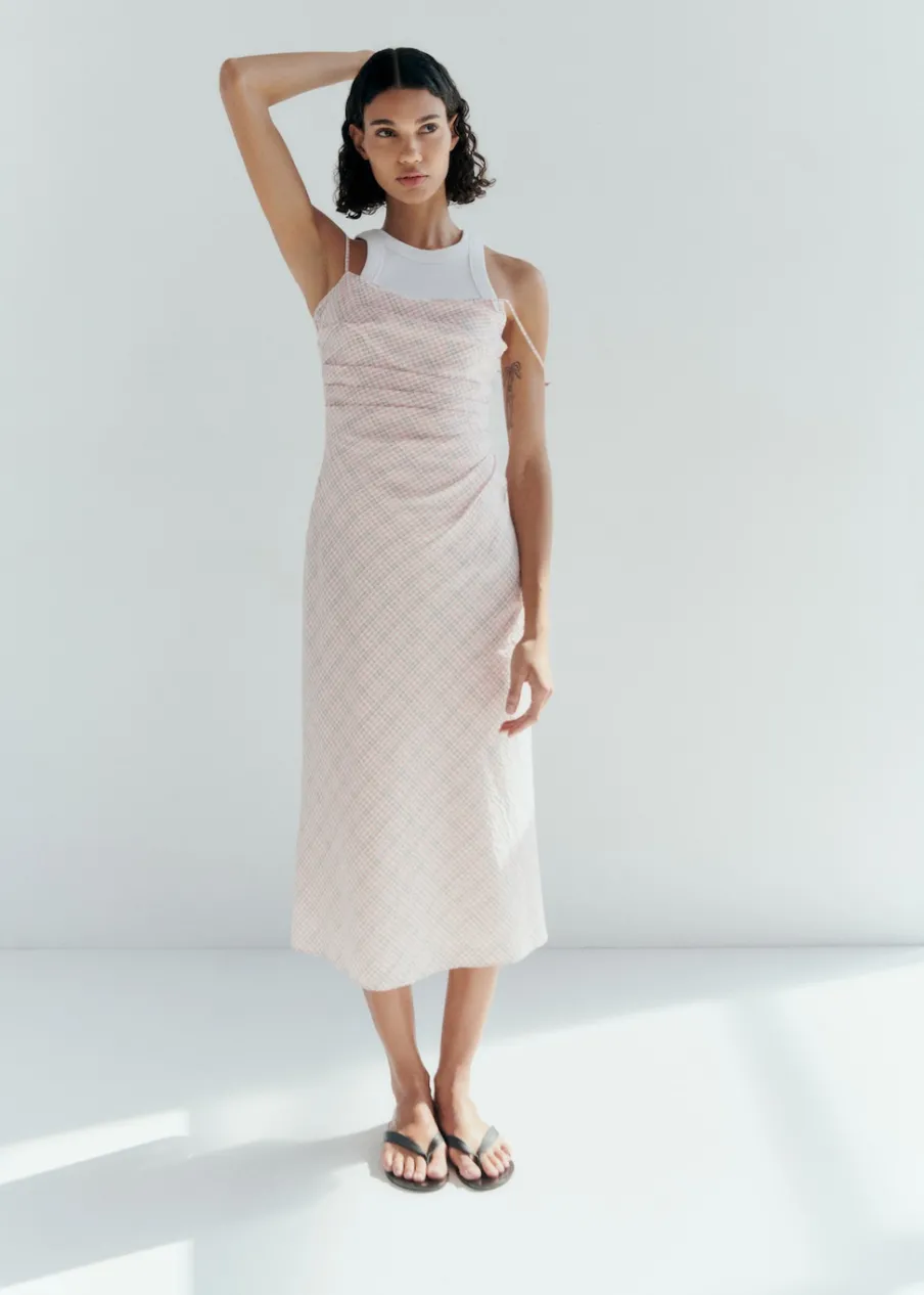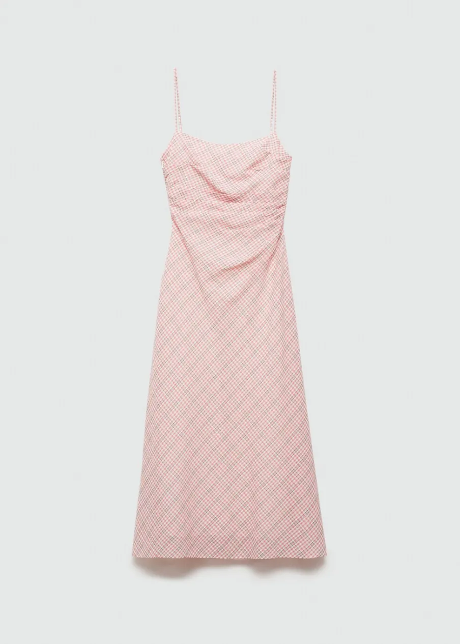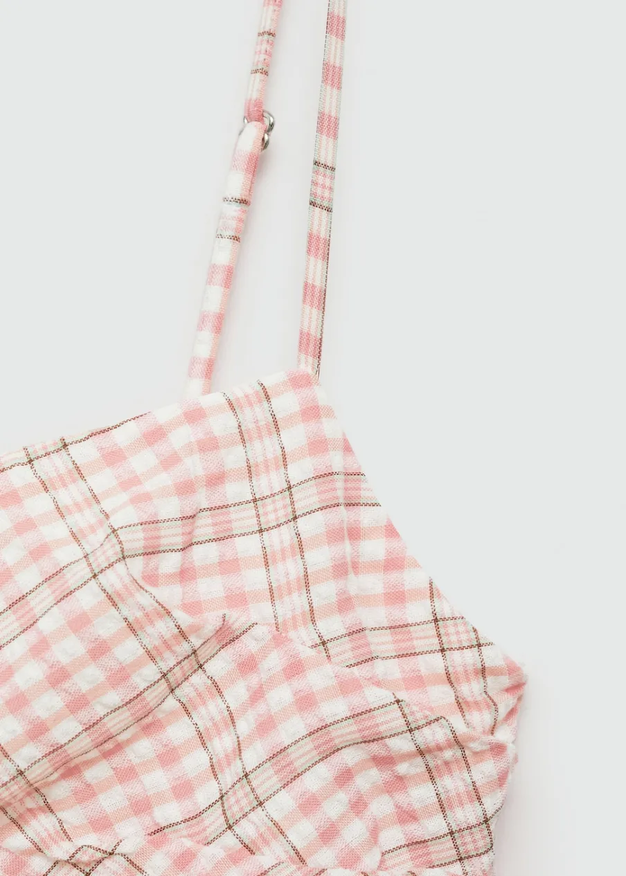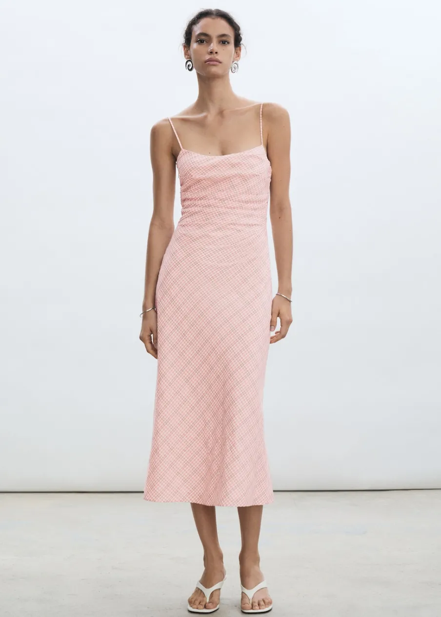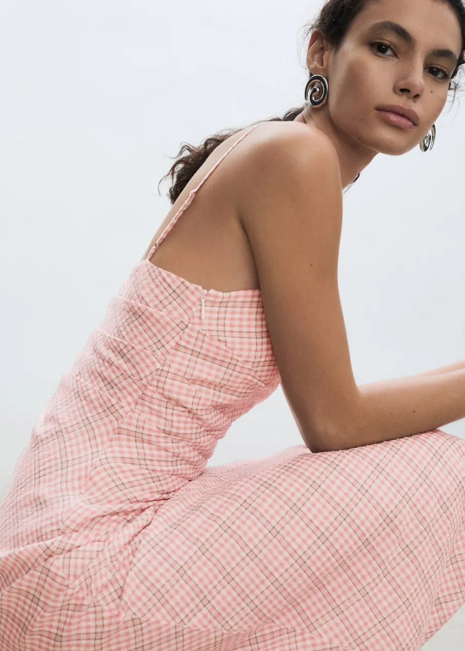 Tkanina mieszanka bawełny. Krój do kolan. Model prosty. Wzór w kratę. Kwadratowy dekolt. Bez rękawów. Cienkie ramiączka. Kryte zapięcie na zamek z boku. Model wcięty.