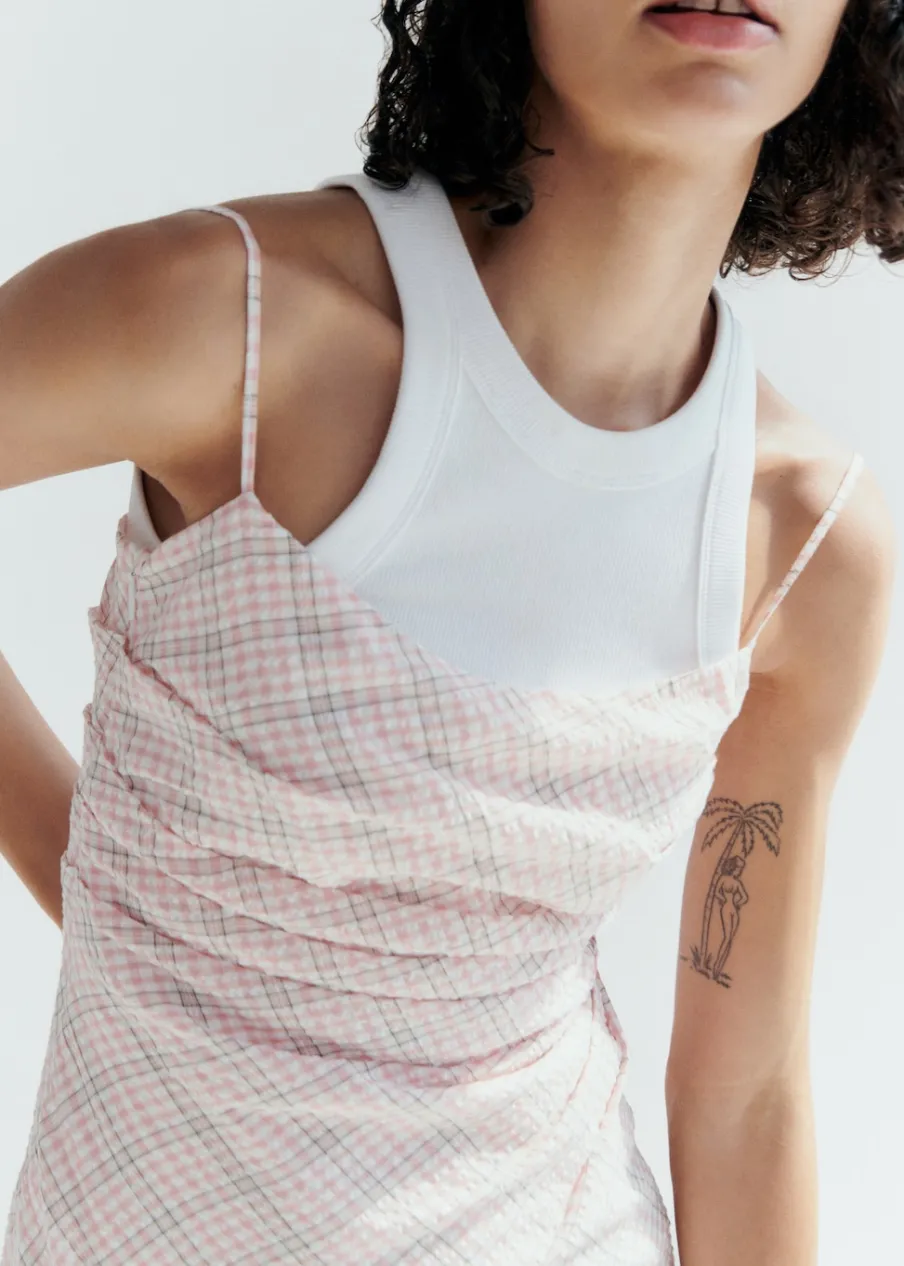 OpisTkanina mieszanka bawełny. Krój do kolan. Model prosty. Wzór w kratę. Kwadratowy dekolt. Bez rękawów. Cienkie …