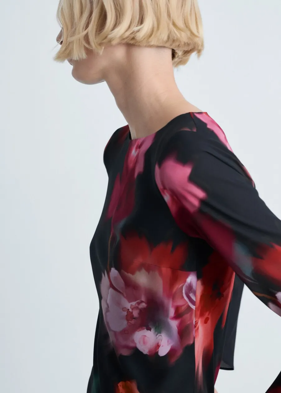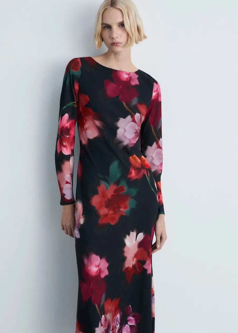 Szyfonowa tkanina. Krój do kolan. Slim-fit. Wzór w kwiaty. Dekolt w kształcie łódki. Długi rękaw. Bez zapięcia. Wewnętrzna podszewka.