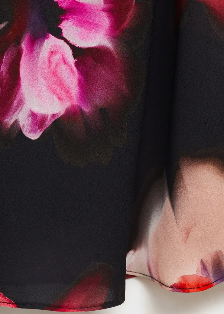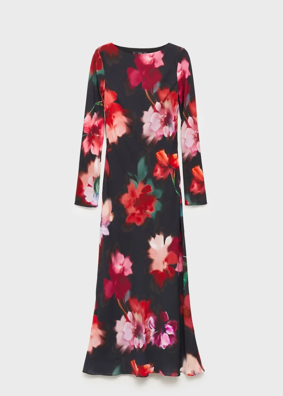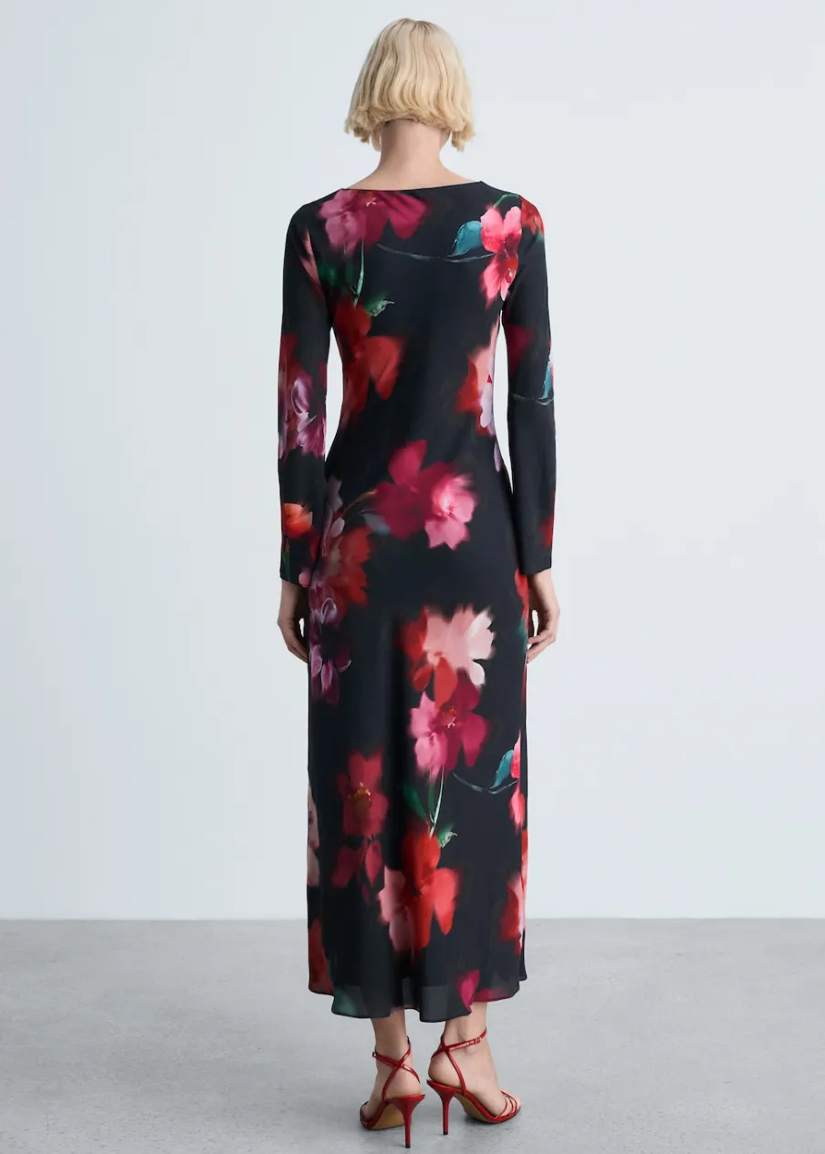 OpisSzyfonowa tkanina. Krój do kolan. Slim-fit. Wzór w kwiaty. Dekolt w kształcie łódki. Długi rękaw. Bez zapięc…