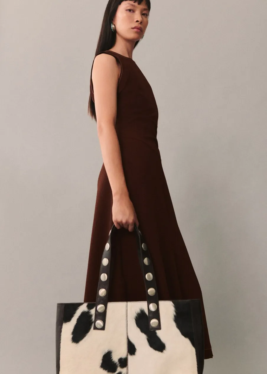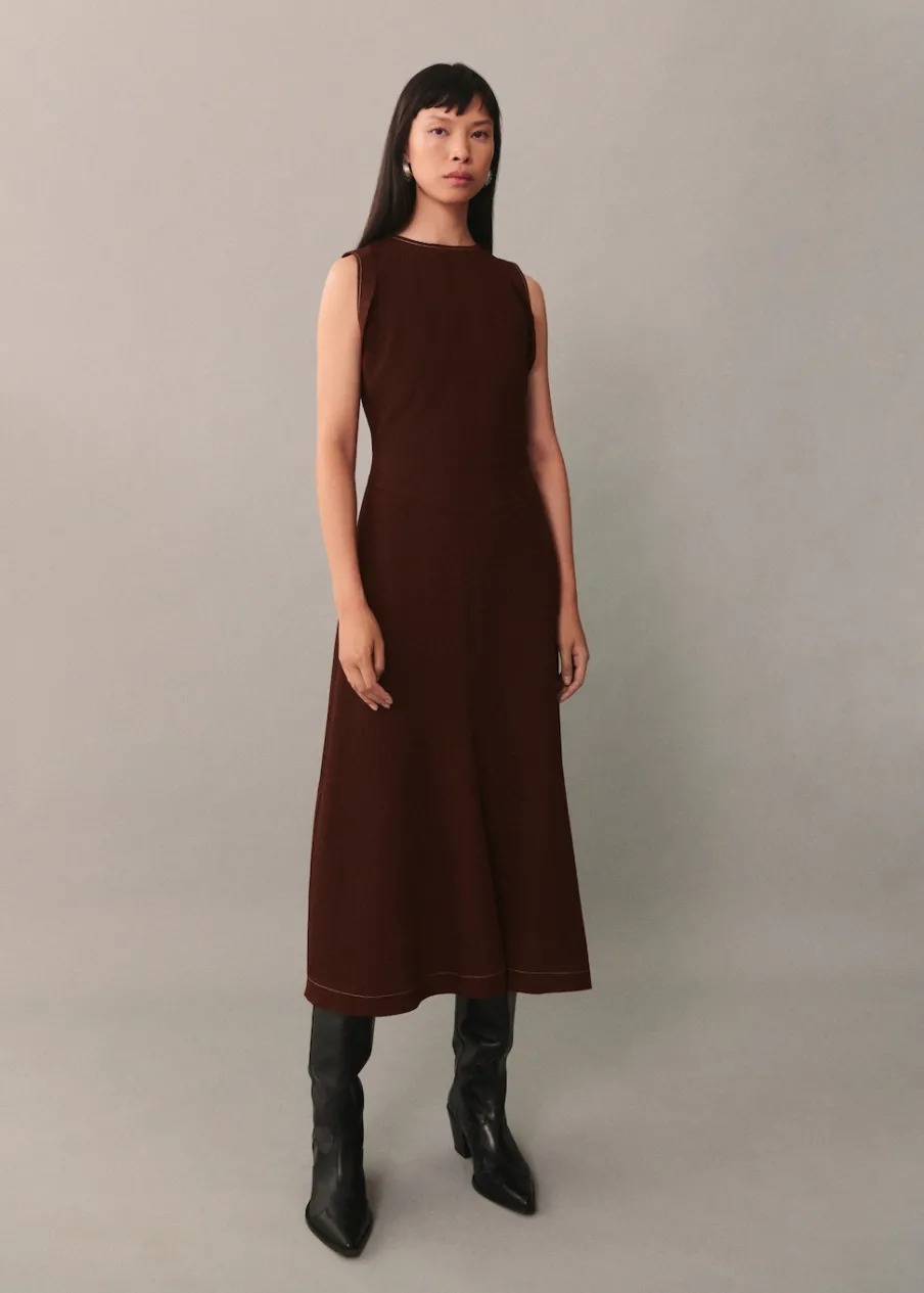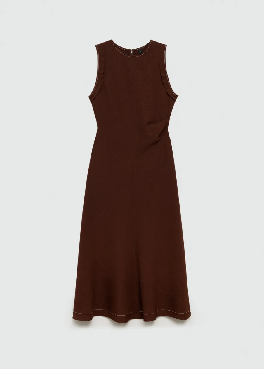 Lejąca tkanina. Model evasé. Krój do kolan. Okrągły dekolt. Bez rękawów. Bez zapięcia. Ozdobne szwy. Modelka ma 177 cm wzrostu i nosi rozmiar S/36.