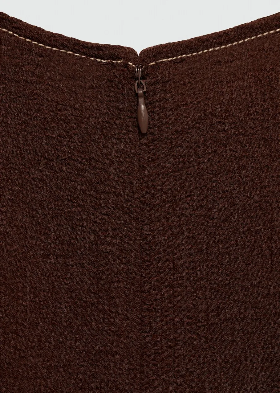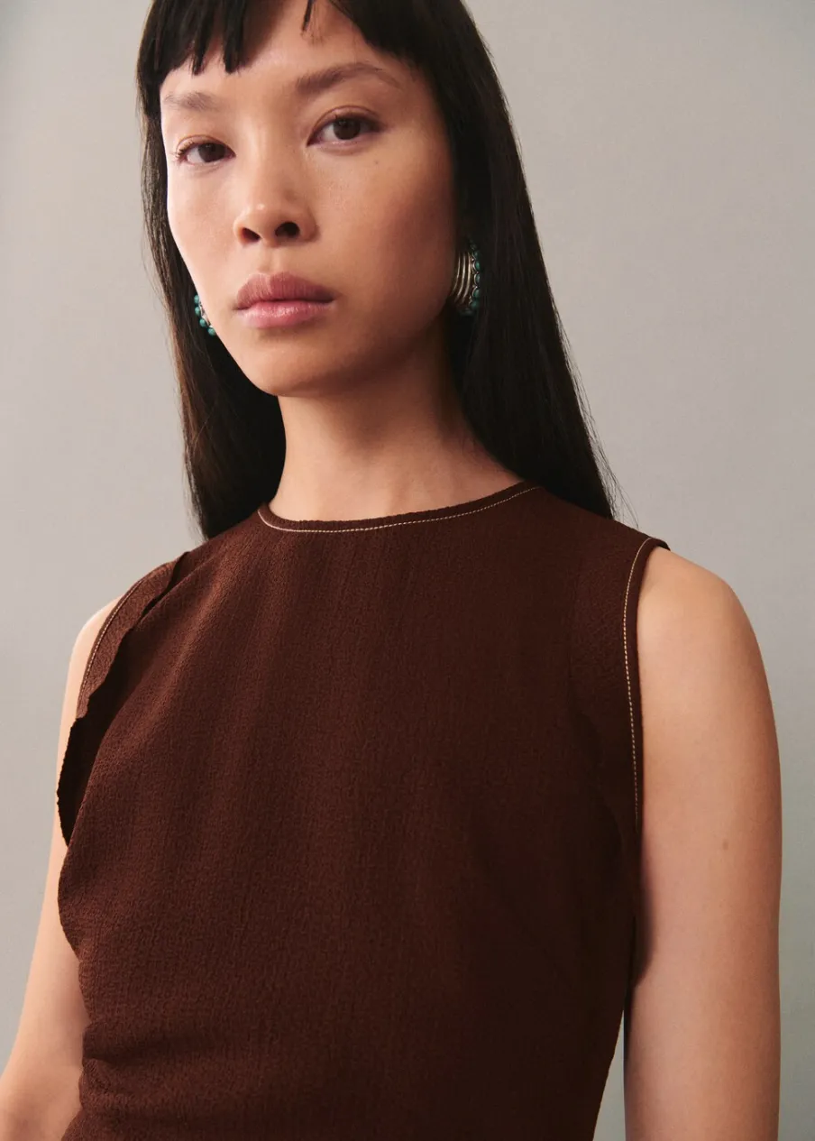 OpisLejąca tkanina. Model evasé. Krój do kolan. Okrągły dekolt. Bez rękawów. Bez zapięcia. Ozdobne szwy. Modelka…