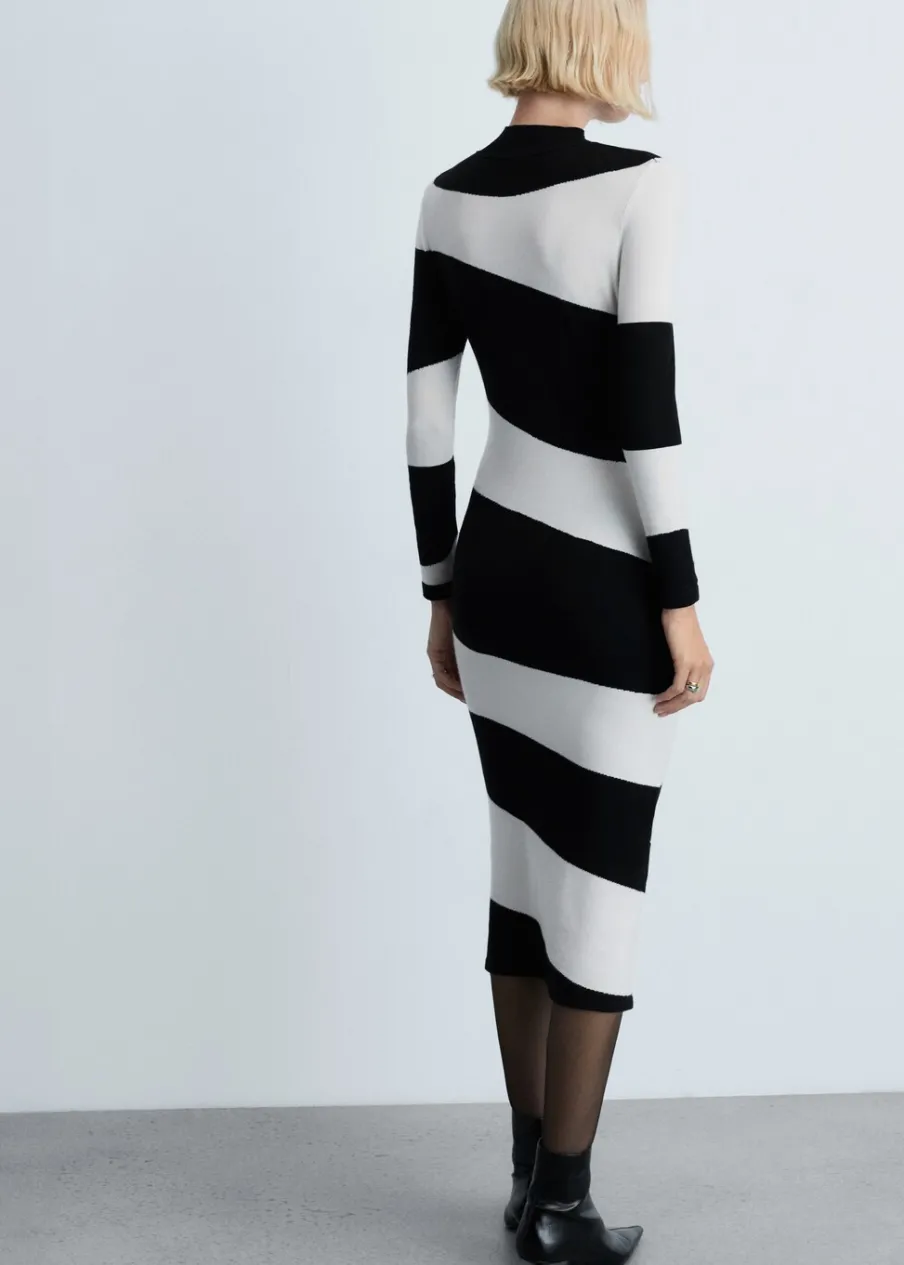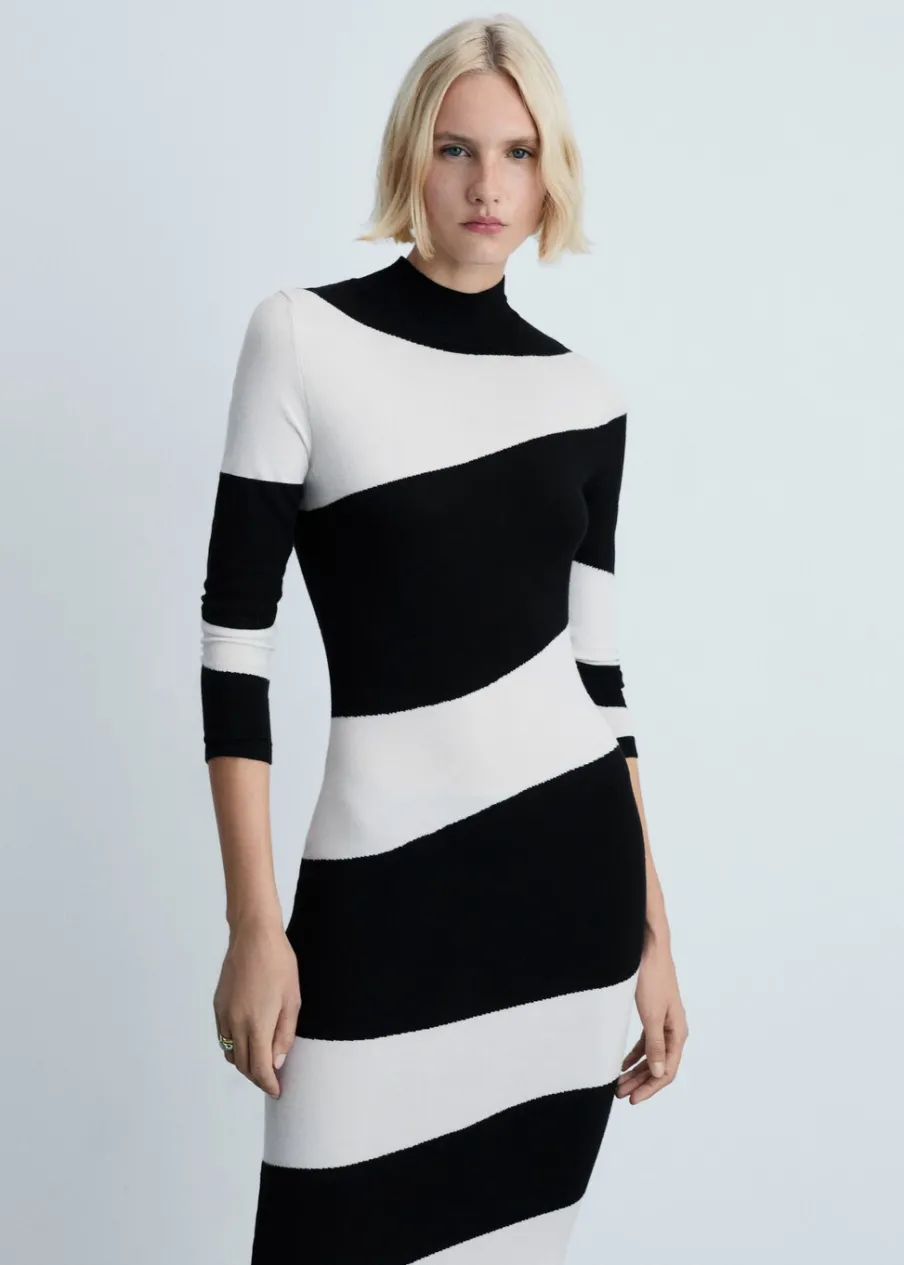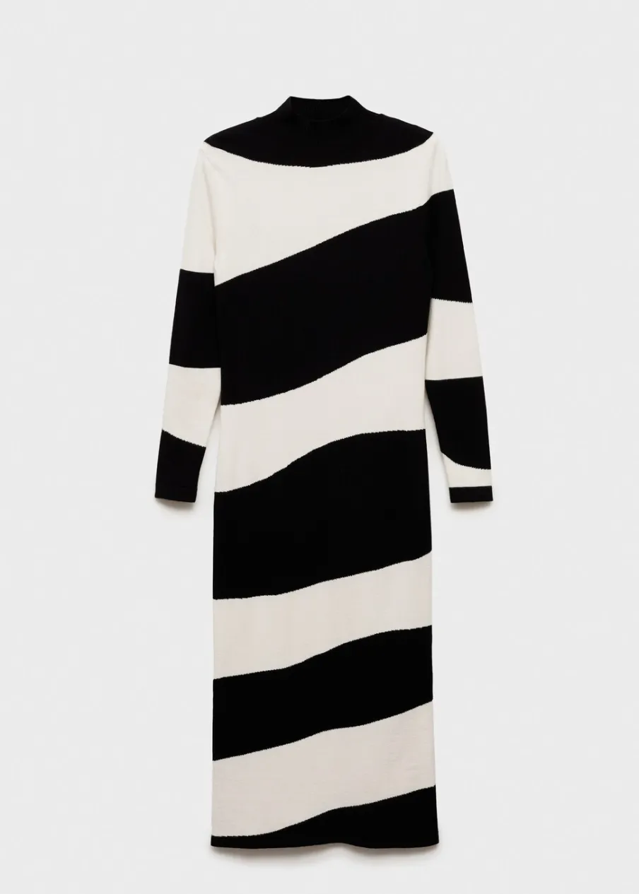 Tkanina z cienkiej dzianiny. Model wcięty. Krój do kolan. Wzór z szerokim pasem. Półgolf. Długi rękaw. Bez zapięcia.