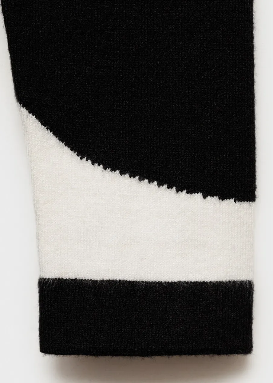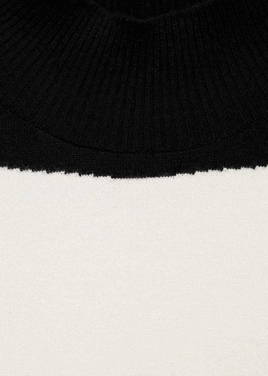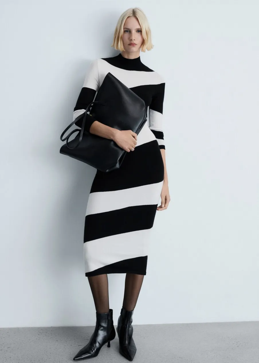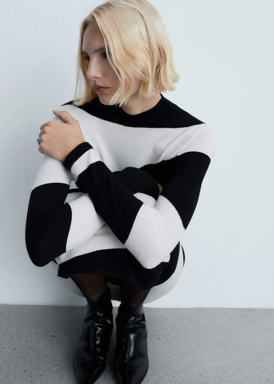 Tkanina z cienkiej dzianiny. Model wcięty. Krój do kolan. Wzór z szerokim pasem. Półgolf. Długi rękaw. Bez zapięcia.