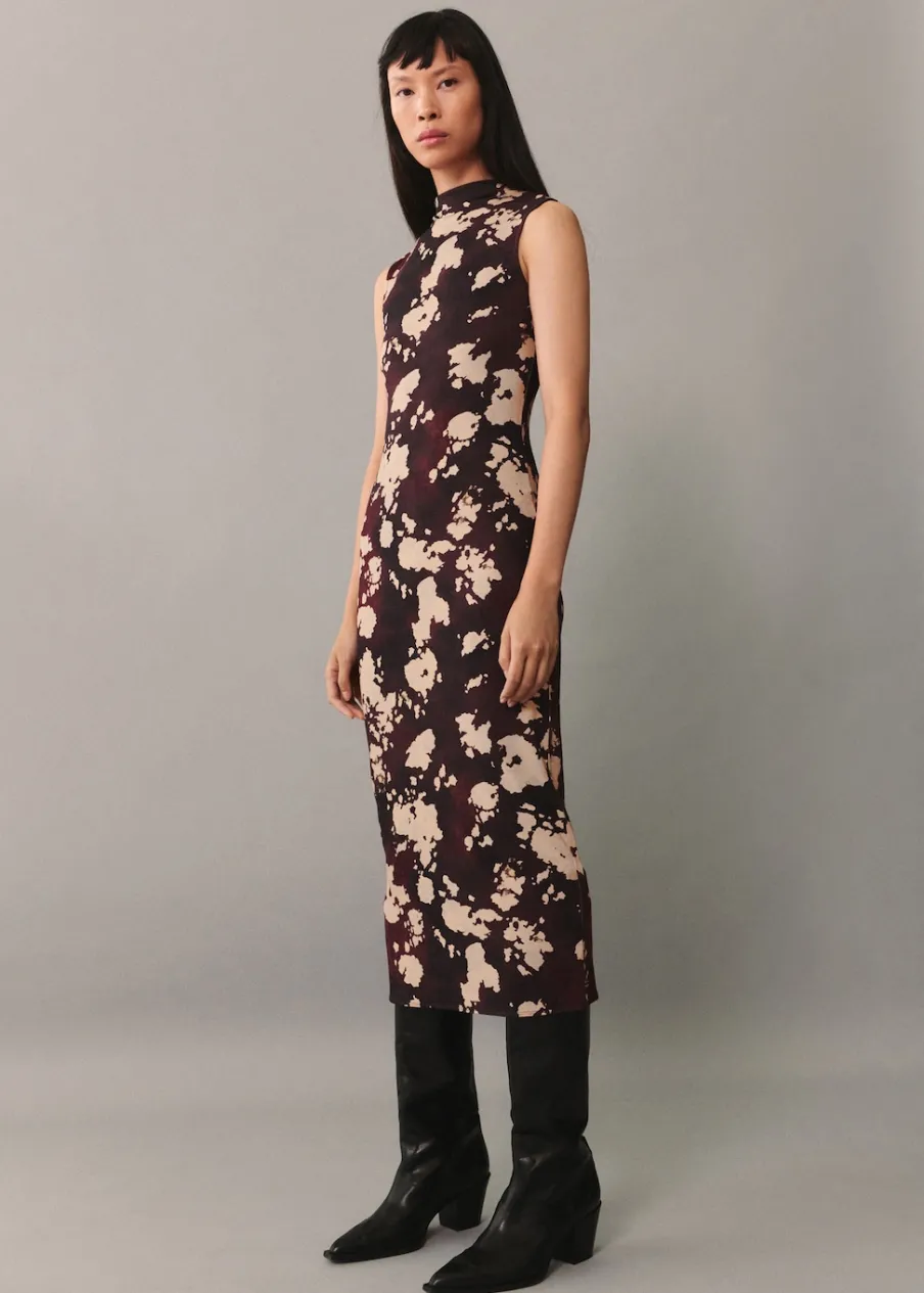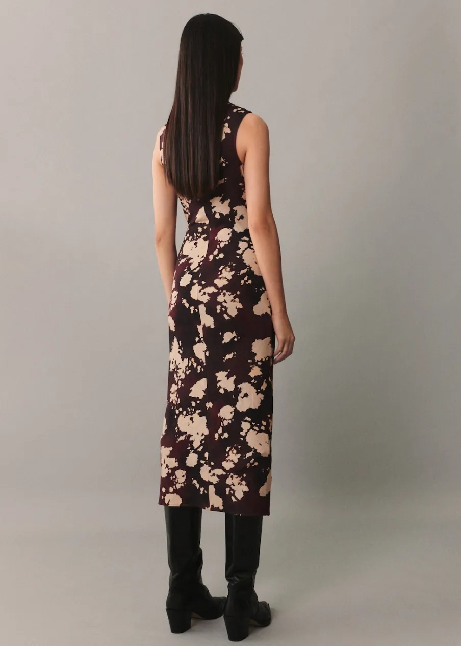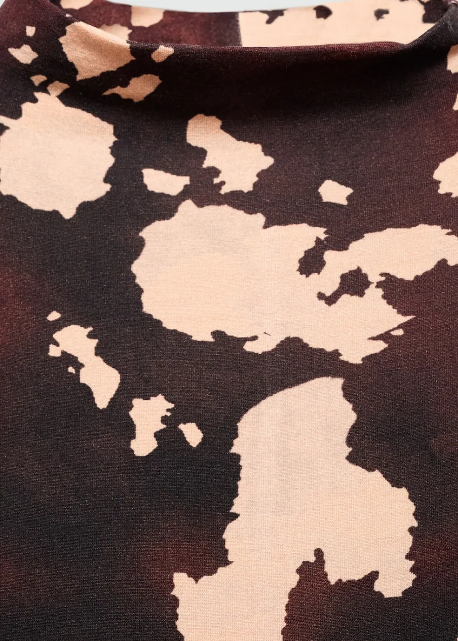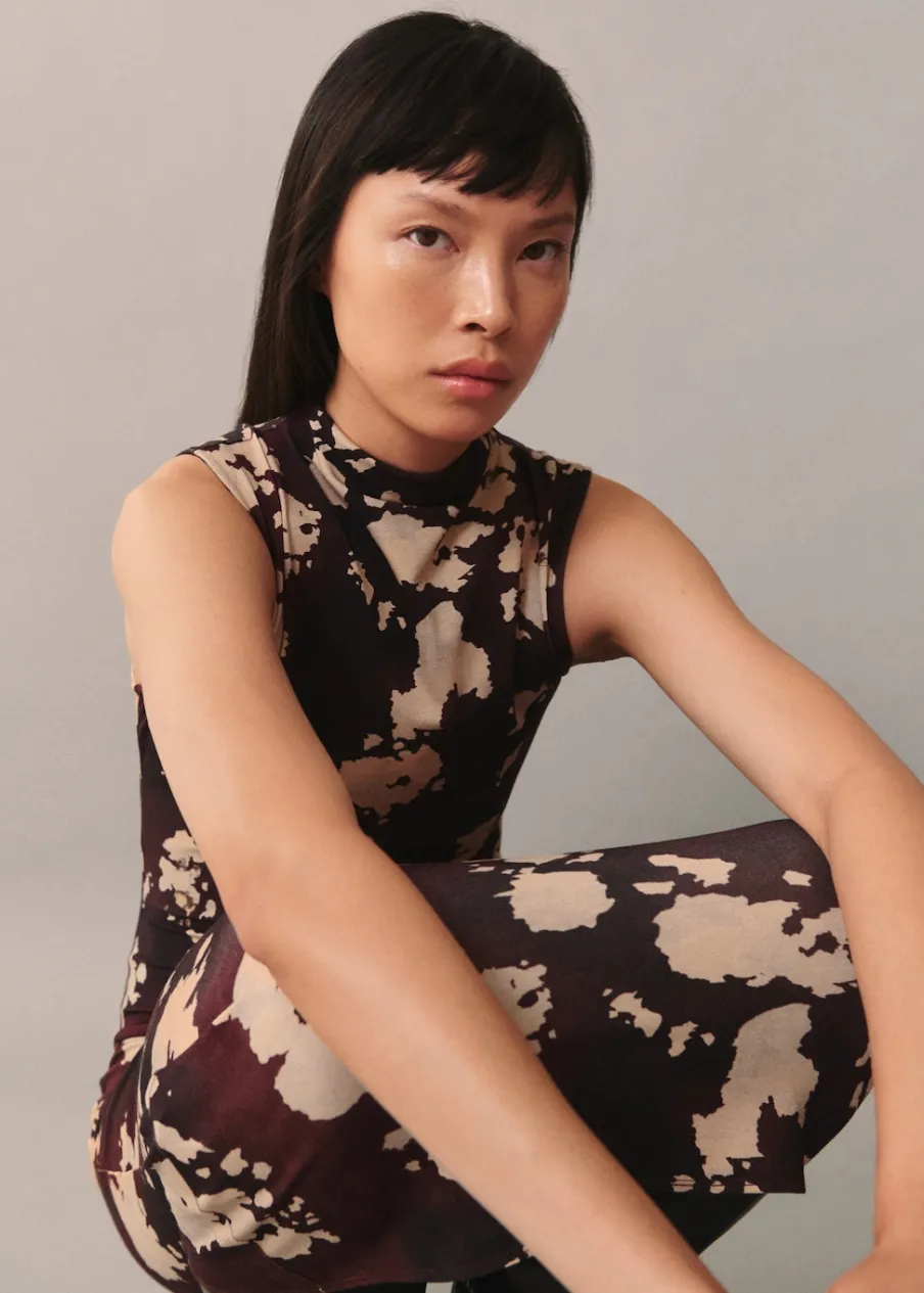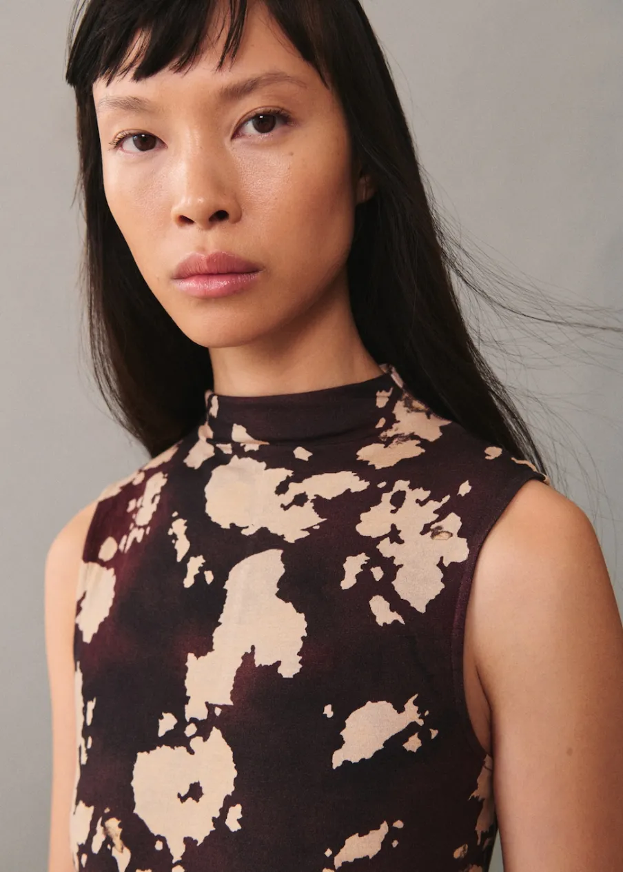 Cienka tkanina. Krój do kolan. Półgolf. Bez rękawów. Bez zapięcia. Modelka ma 177 cm wzrostu i nosi rozmiar S/36. Model wcięty. Nadruk.