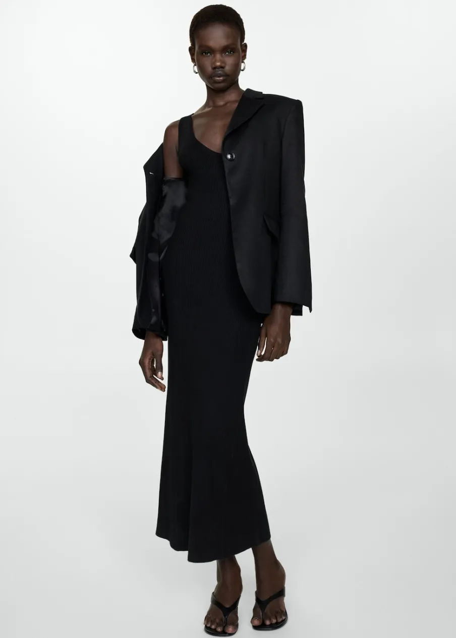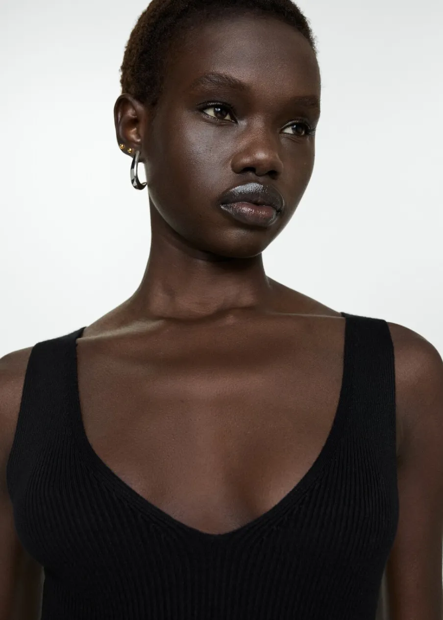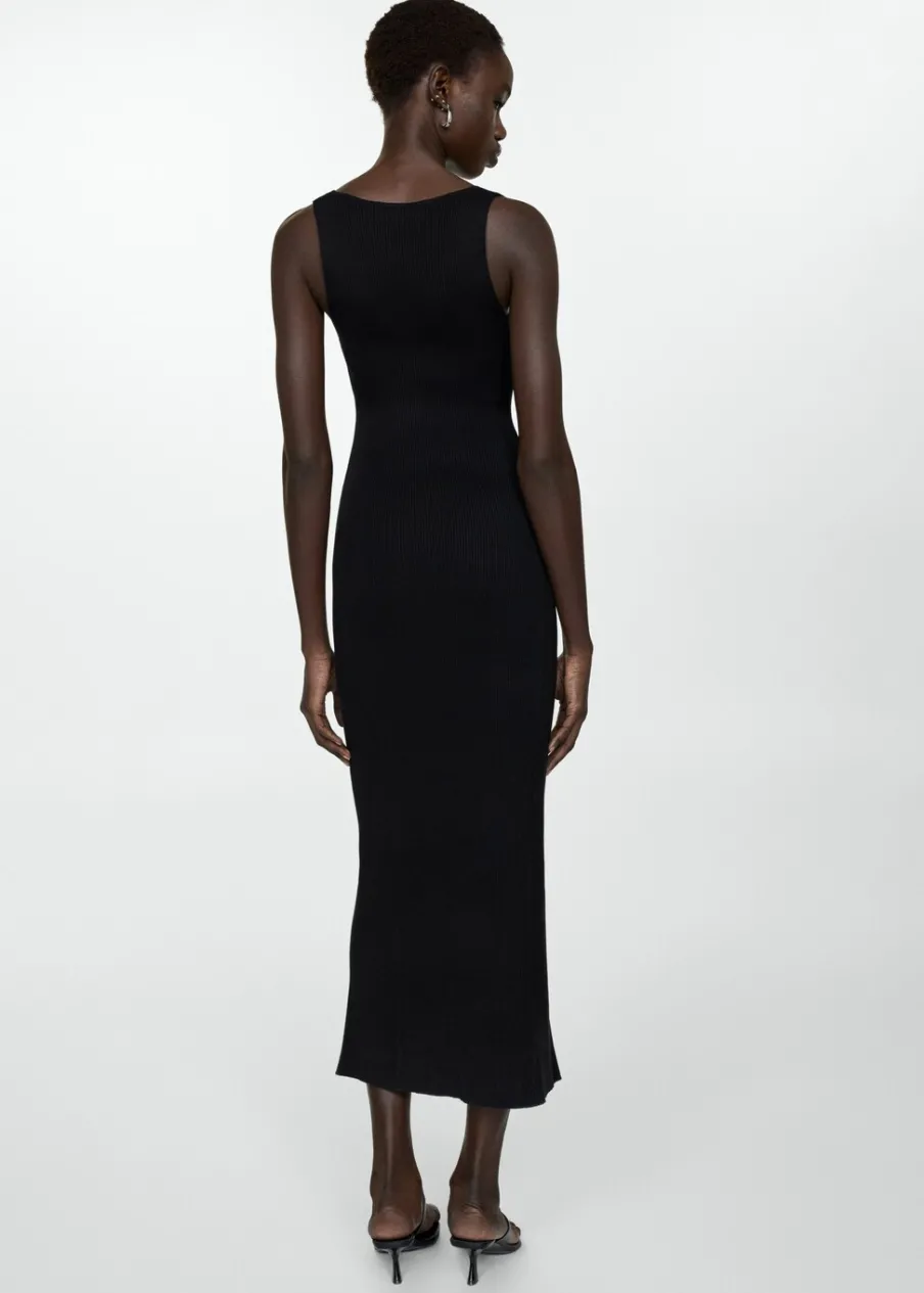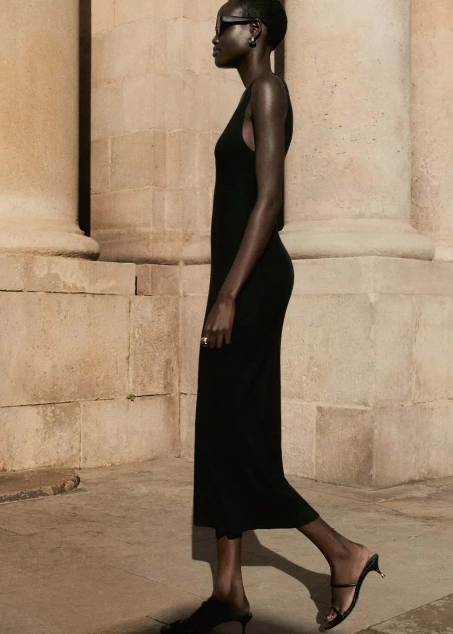 Tkanina z cienkiej dzianiny. Krój do kolan. Dekolt V. Bez rękawów. Szerokie ramiączka. Bez zapięcia. Model wcięty.