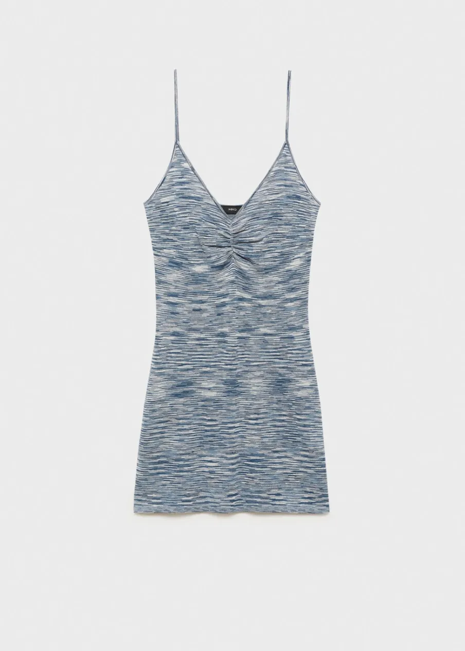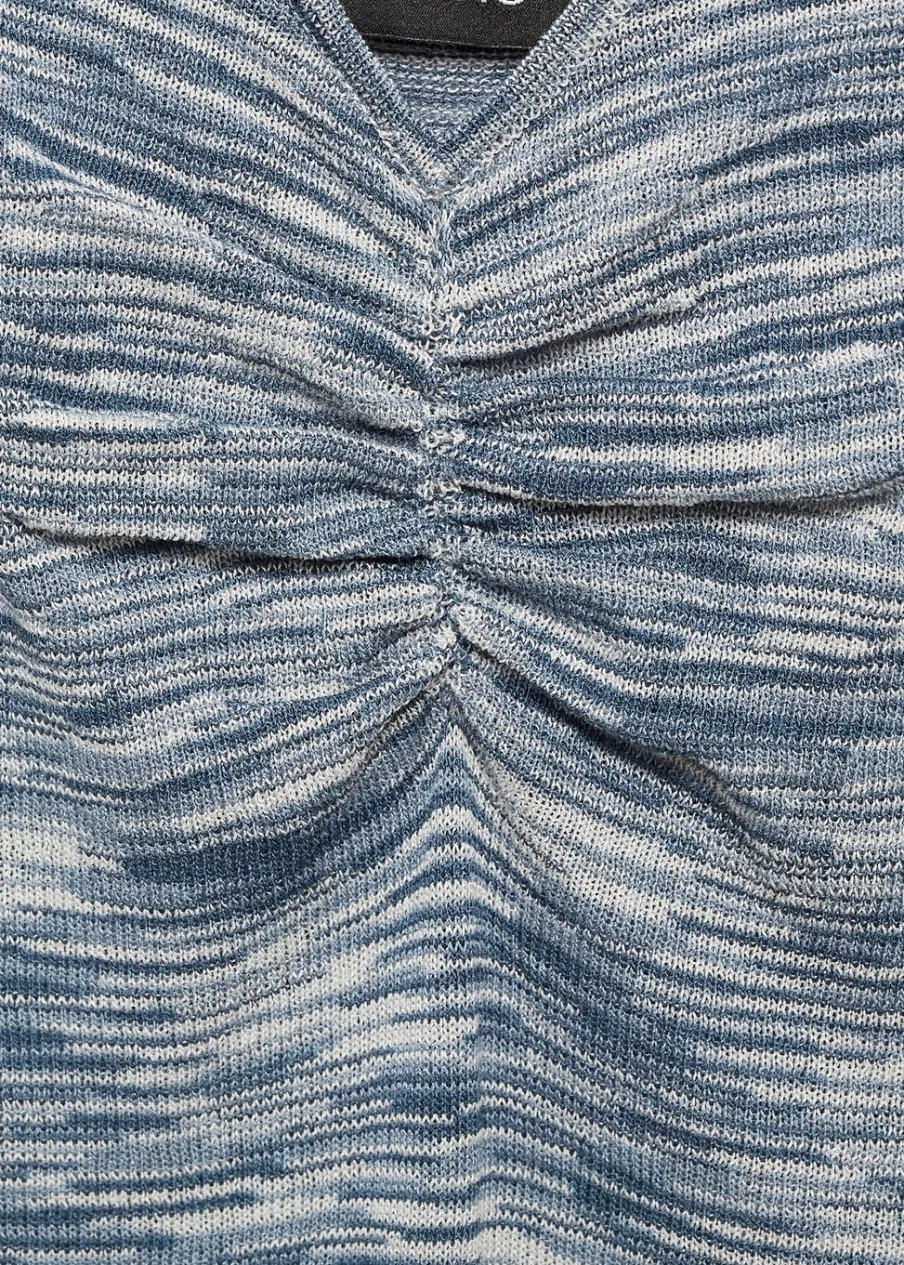 Tkanina z cienkiej dzianiny. Krótki krój. Dekolt V. Bez rękawów. Cienkie ramiączka. Bez zapięcia. Bez podszewki. Marszczony detal. Model wcięty.