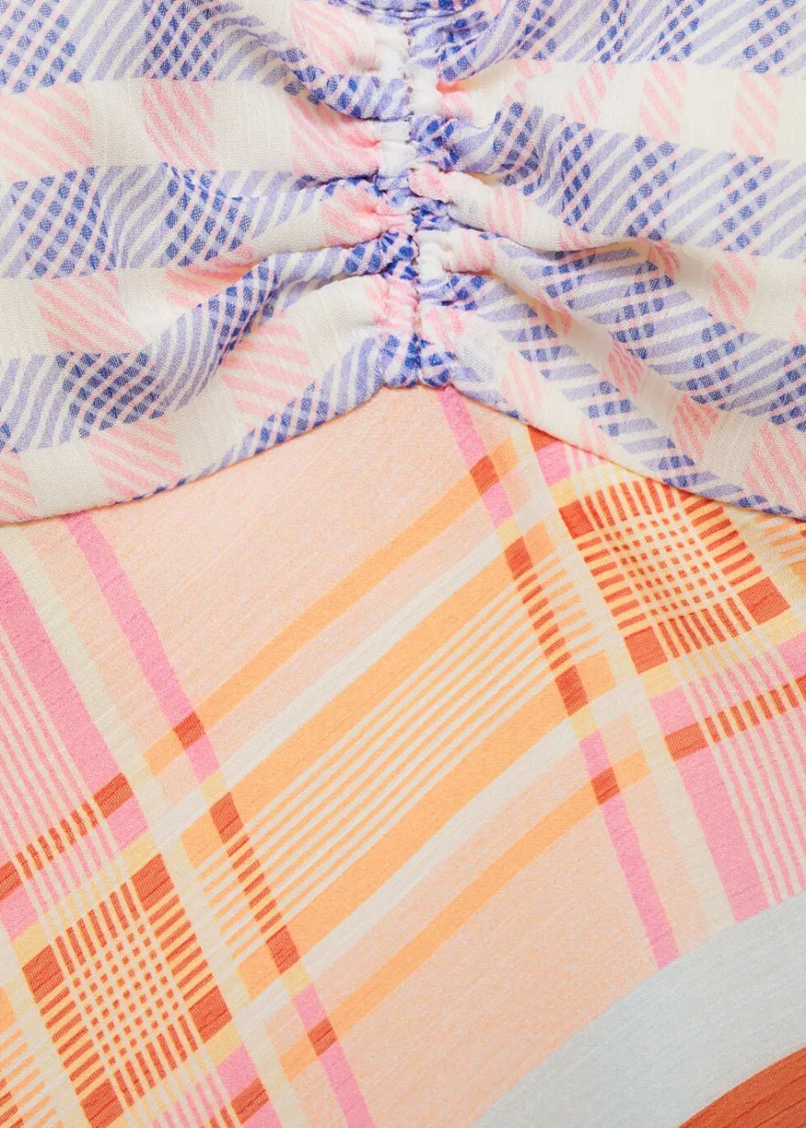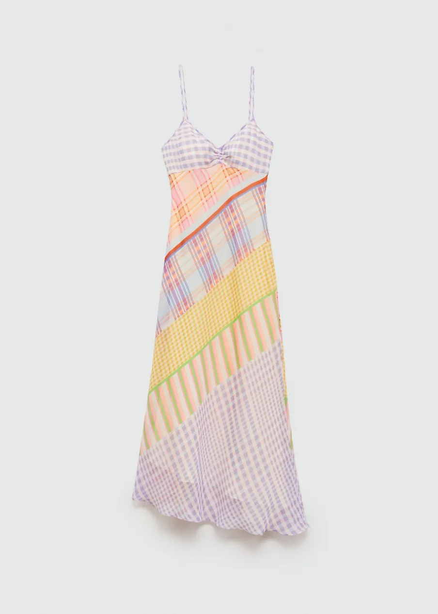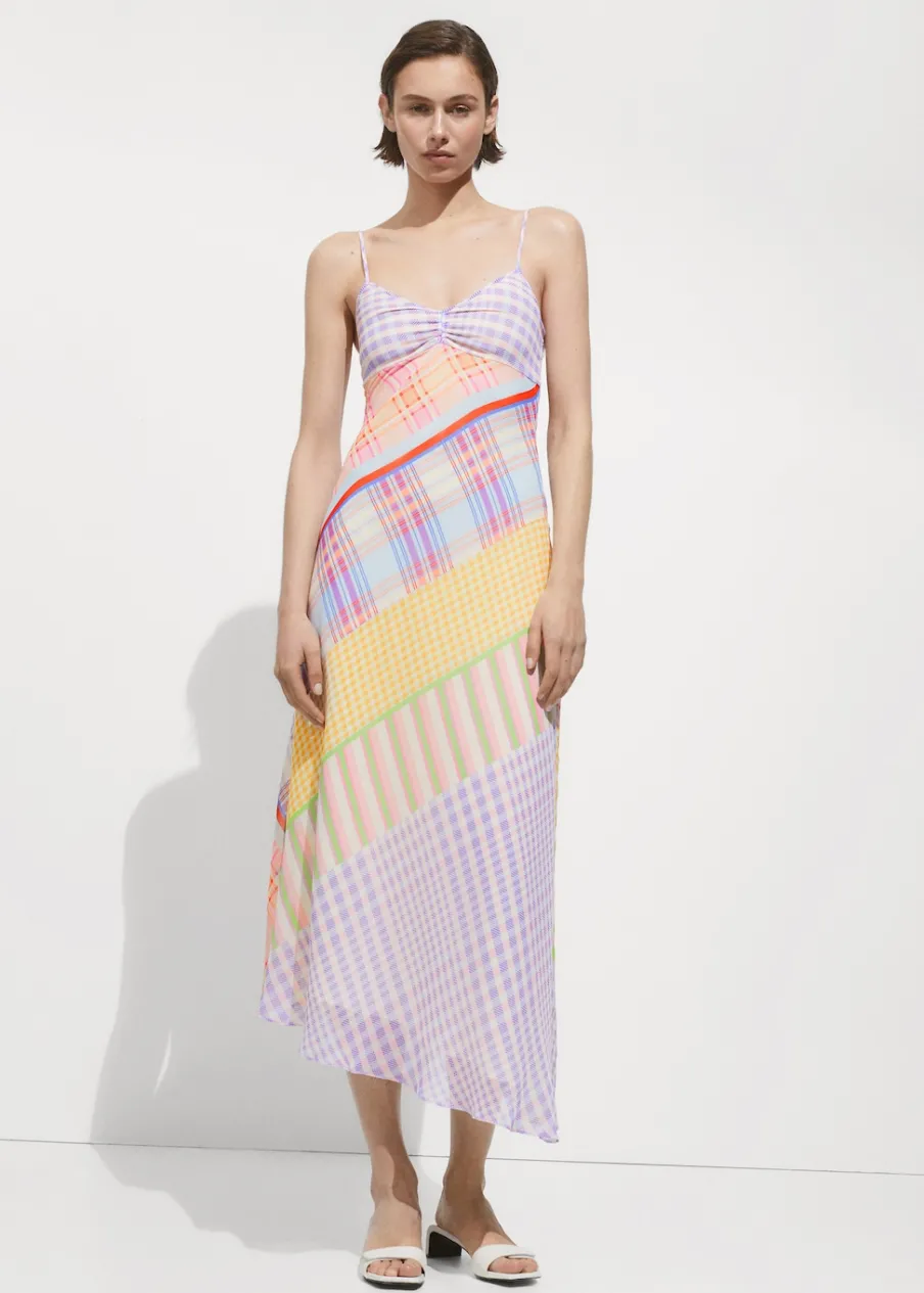 Lejąca tkanina. Model długi. Model prosty. Asymetryczny krój. Wzór w kratę. Dekolt V. Bez rękawów. Cienkie ramiączka. Boczne zapięcie na suwak. Marszczony detal. Wewnętrzna podszewka.