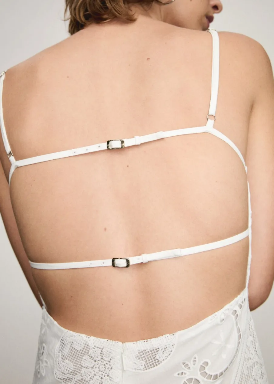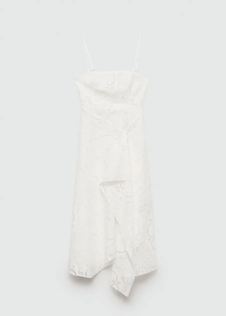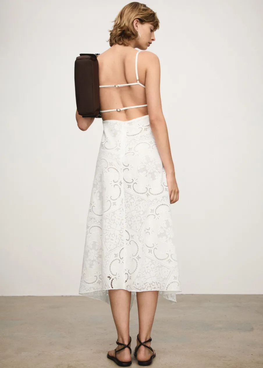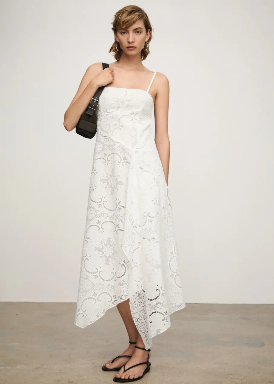 Haftowana tkanina. Model prosty. Krój do kolan. Kwadratowy dekolt. Bez rękawów. Cienkie ramiączka. Zapięcie z tyłu na suwak. Wewnętrzna podszewka. Asymetryczny dół. Tkanina z 100% bawełny.