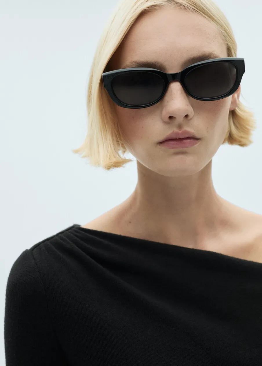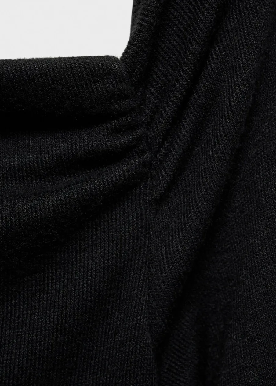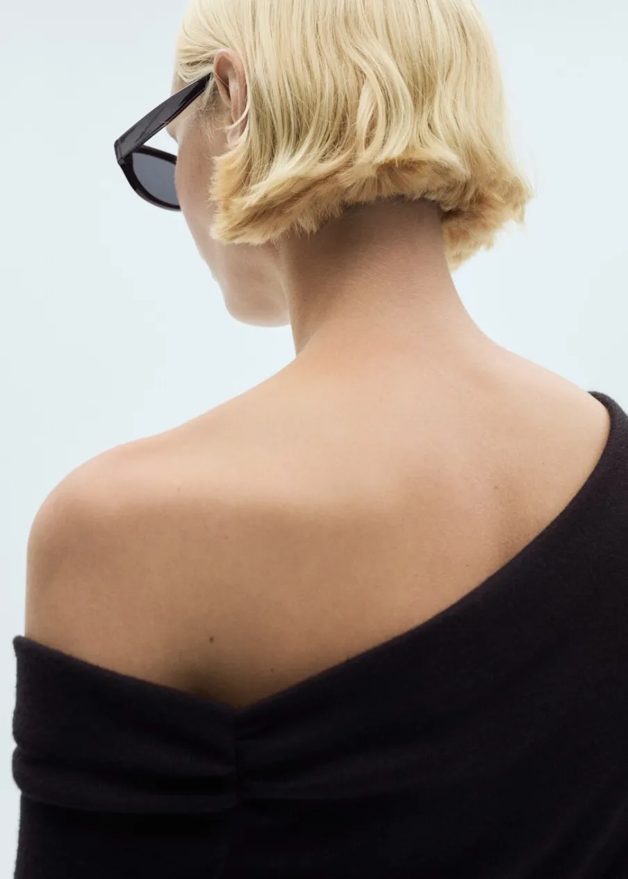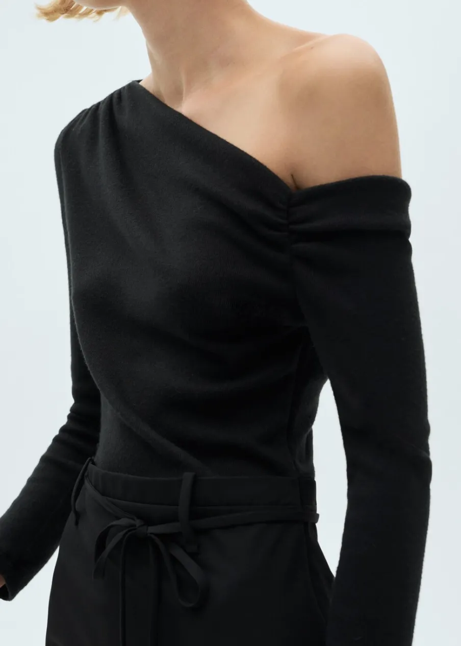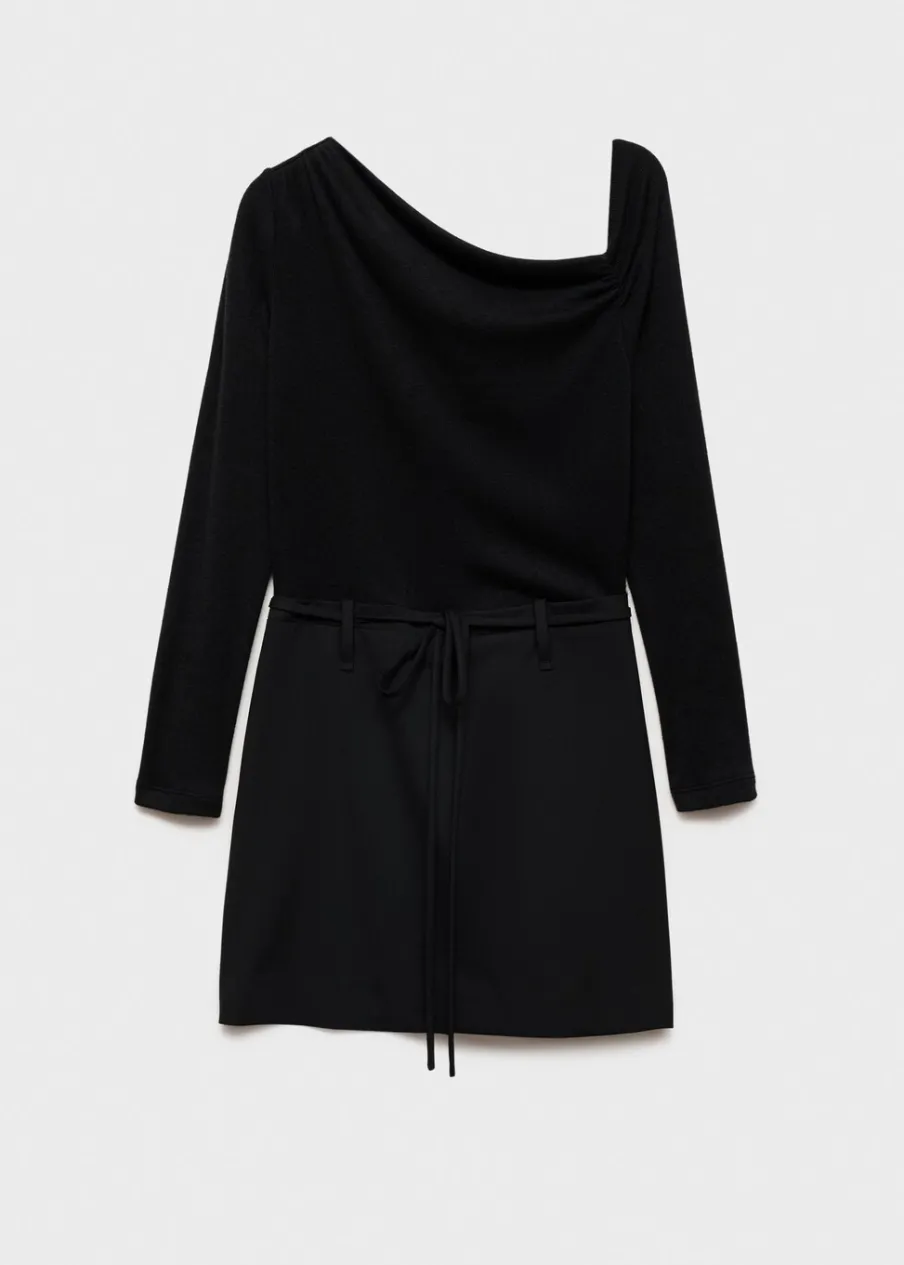 Asymetryczny krój. Krótki krój. Model łączony. Model prosty. Asymetryczny dekolt. Długi rękaw. Wiązanie w pasie. Zapięcie na zamek z boku. Modelka ma 179 cm wzrostu i nosi rozmiar S/36. Model wcięty.