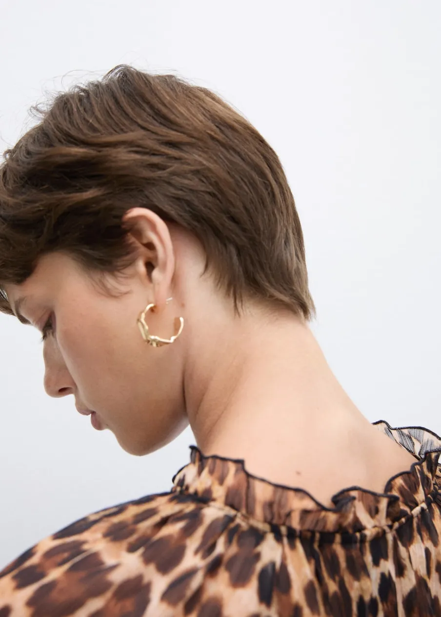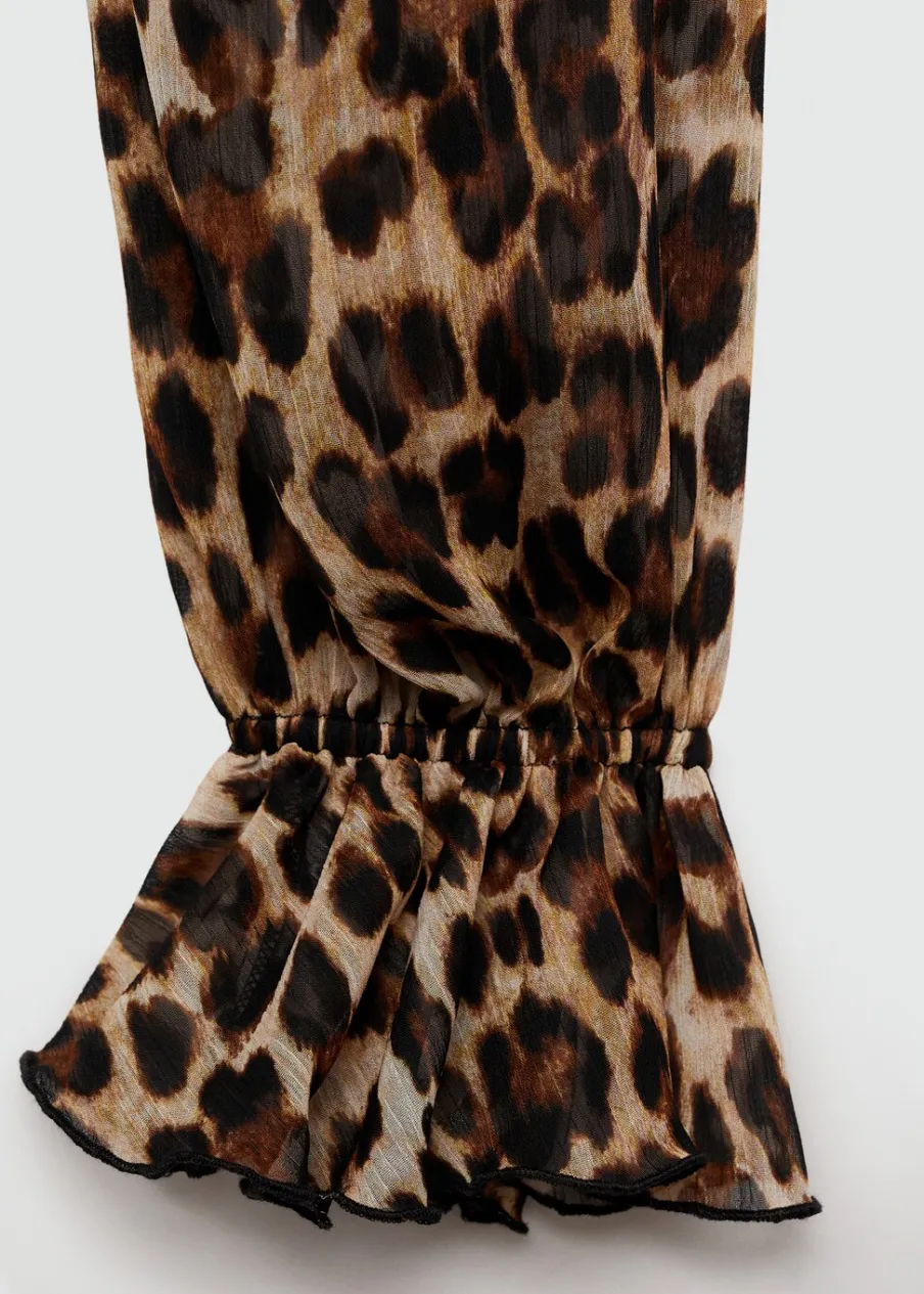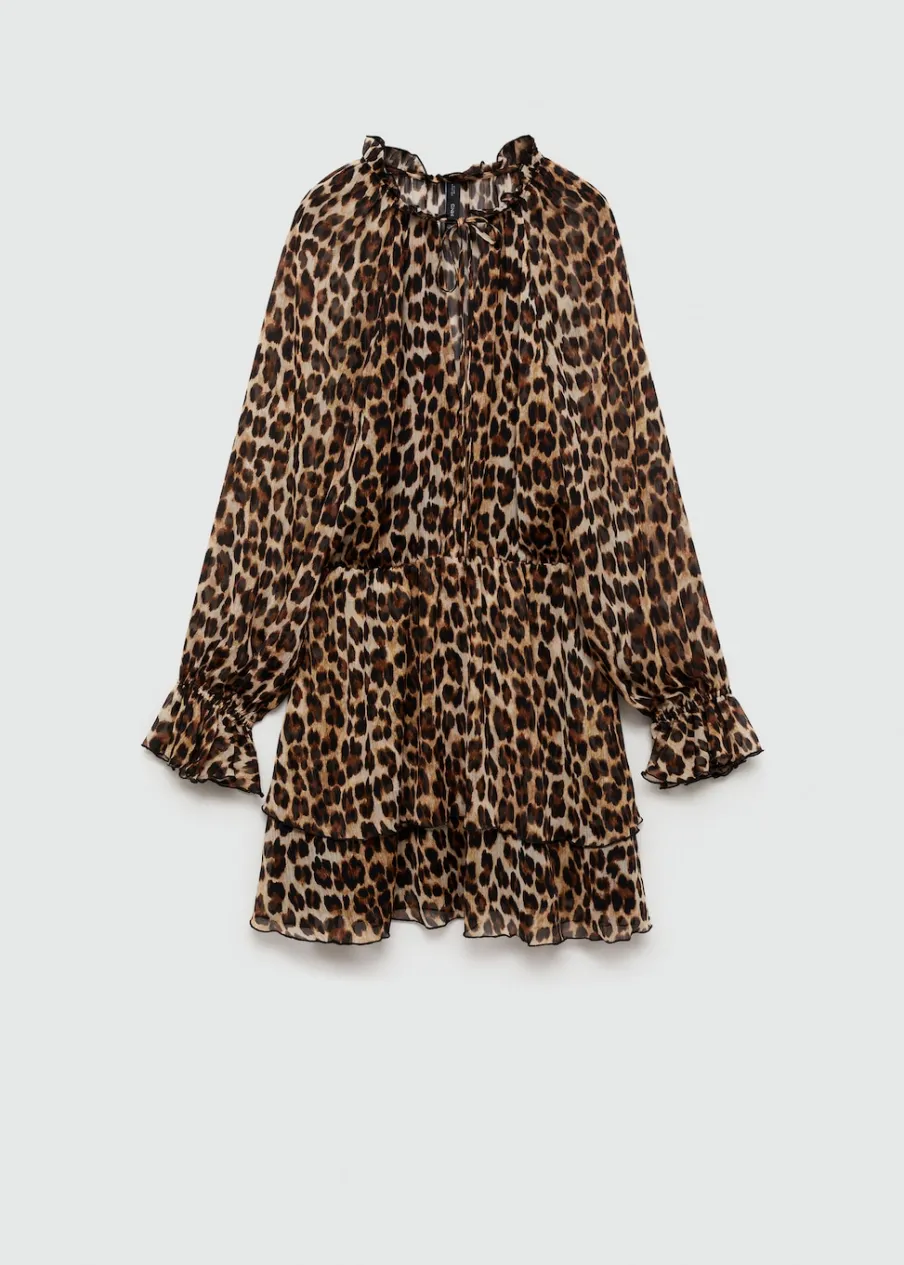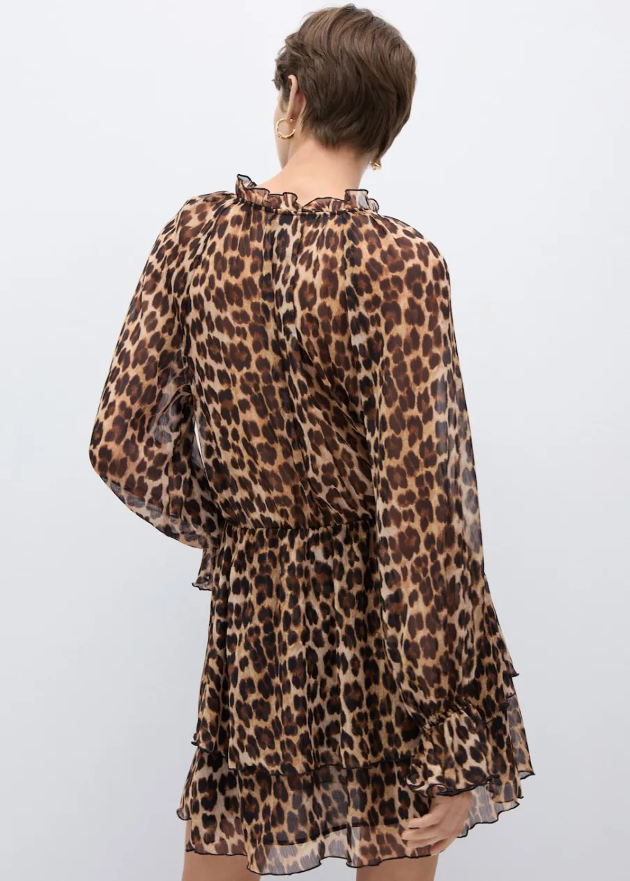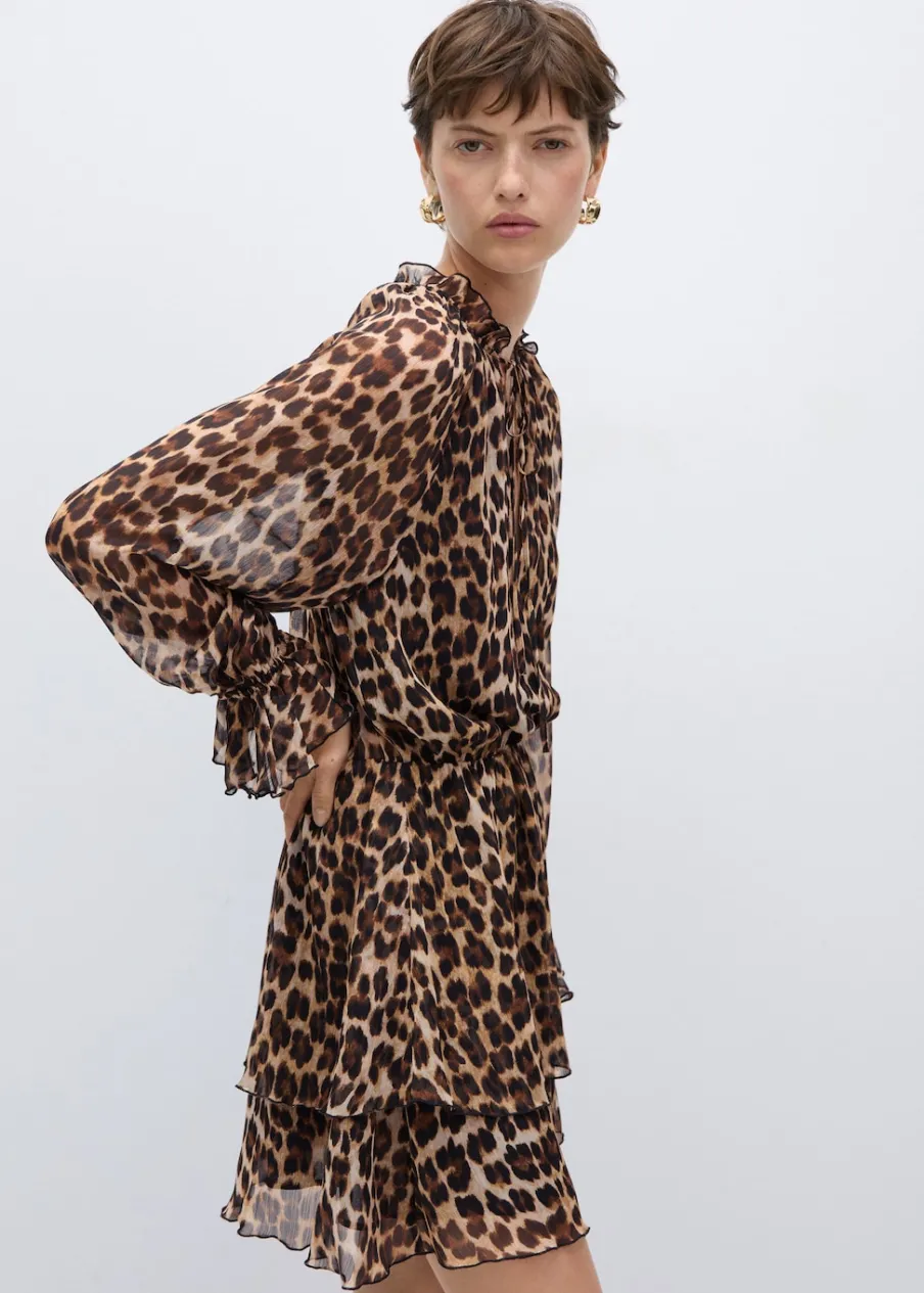 Lejąca tkanina. Krótki krój. Model evasé. Zwierzęcy wzór. Wzór w lamparcie cętki. Okrągły dekolt. Długi rękaw. Długi rękaw z elastycznymi mankietami. Wiązanie na szyi. Wewnętrzna podszewka.