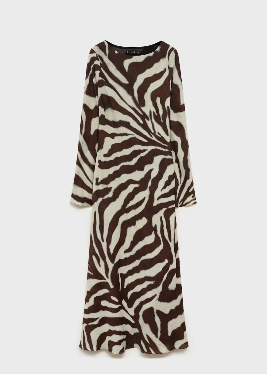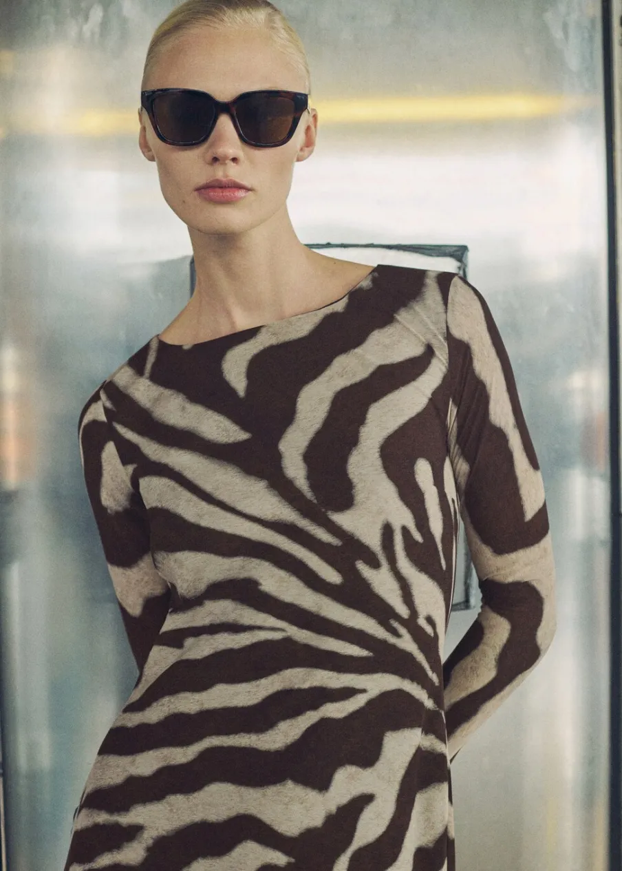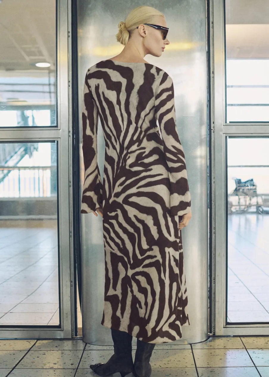 Cienka tkanina. Lejąca tkanina. Model evasé. Model długi. Wzór w zebrę. Zwierzęcy wzór. Dekolt w kształcie łódki. Długi rękaw. Rozszerzane rękawy. Bez zapięcia. Tylko podszewka.