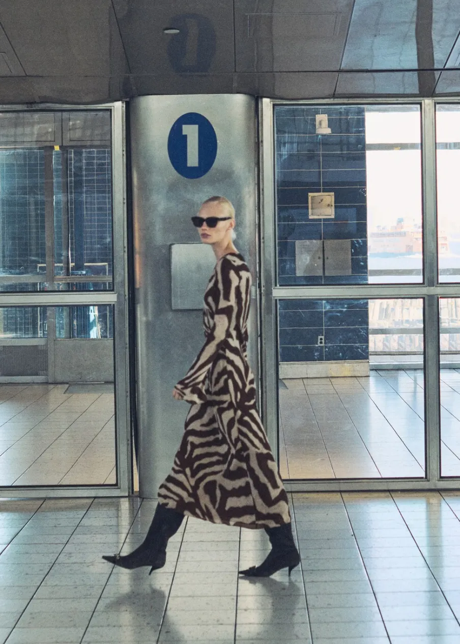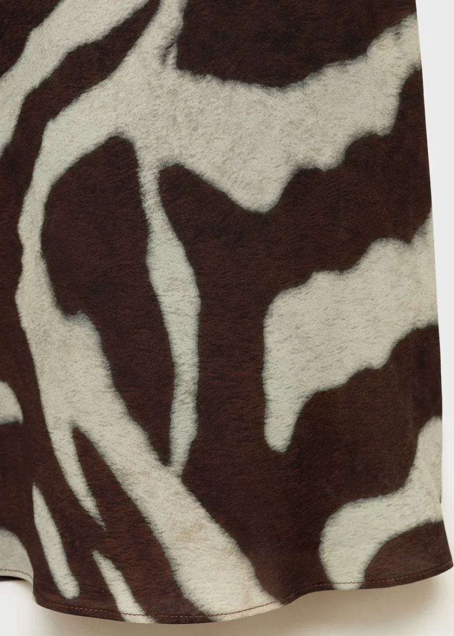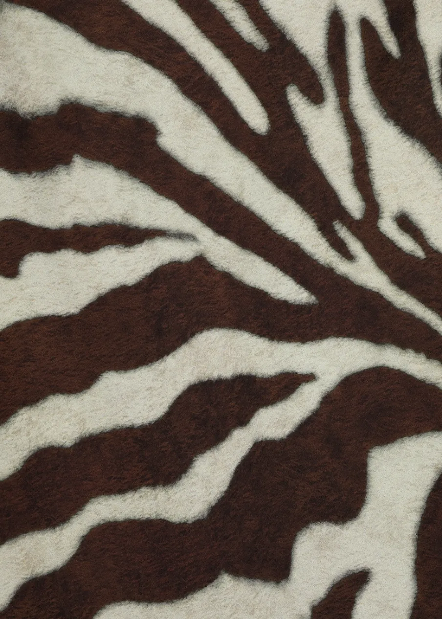 Cienka tkanina. Lejąca tkanina. Model evasé. Model długi. Wzór w zebrę. Zwierzęcy wzór. Dekolt w kształcie łódki. Długi rękaw. Rozszerzane rękawy. Bez zapięcia. Tylko podszewka.