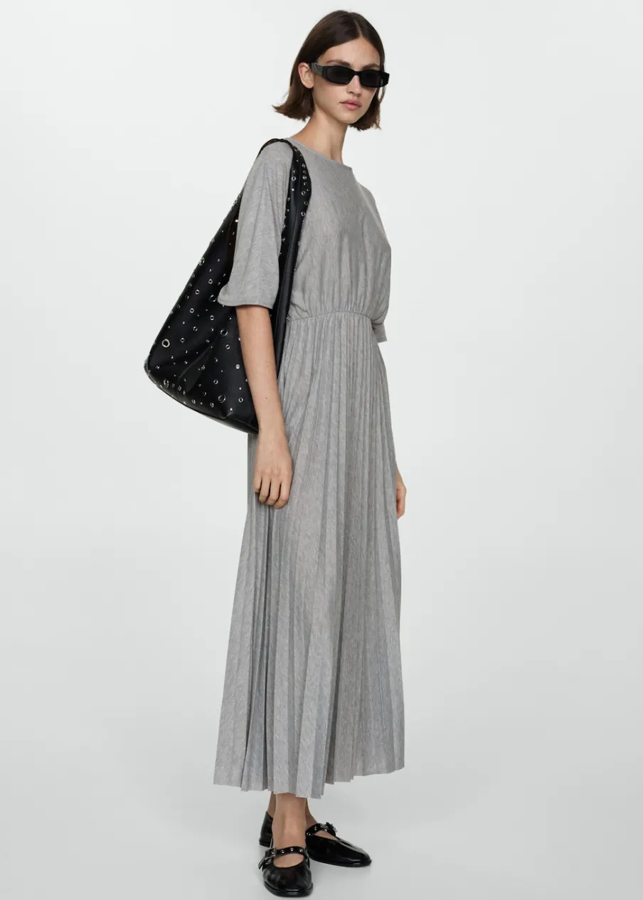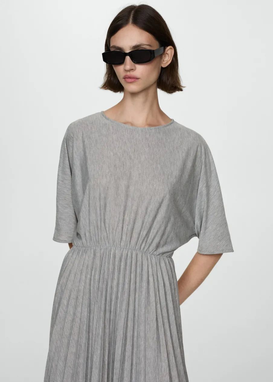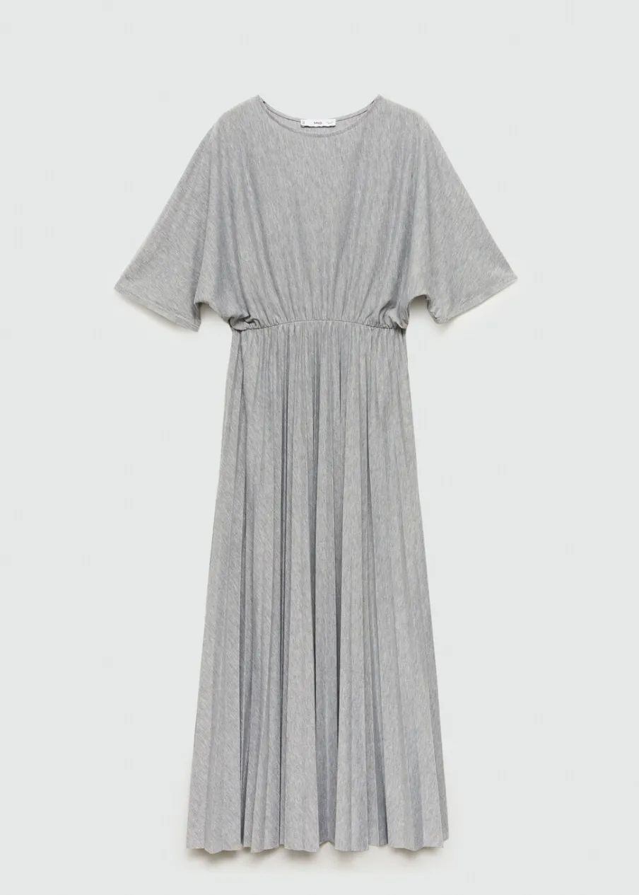 Lejąca tkanina. Model evasé. Model długi. Plisowanie. Okrągły dekolt. Krótki rękaw. Elastyczny pas.