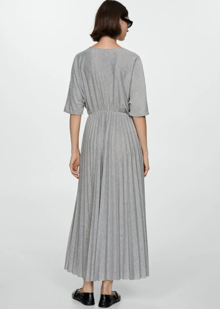 OpisLejąca tkanina. Model evasé. Model długi. Plisowanie. Okrągły dekolt. Krótki rękaw. Elastyczny pas.