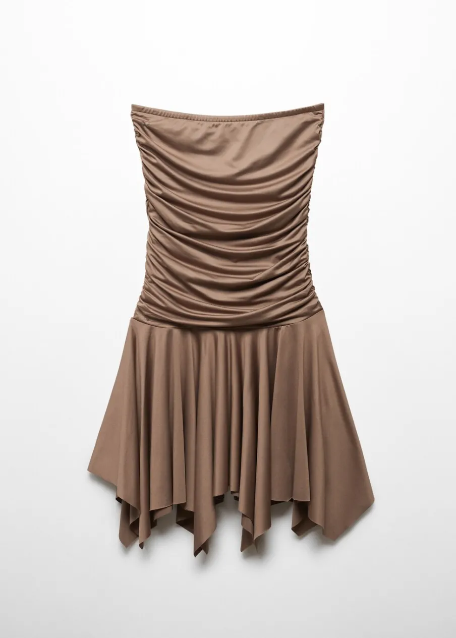 Lejąca tkanina. Krótki krój. Model evasé. Dekolt bez ramiączek. Bez rękawów. Bez zapięcia. Falbanki u dołu. Marszczona tekstura. Asymetryczny dół. Model wcięty.