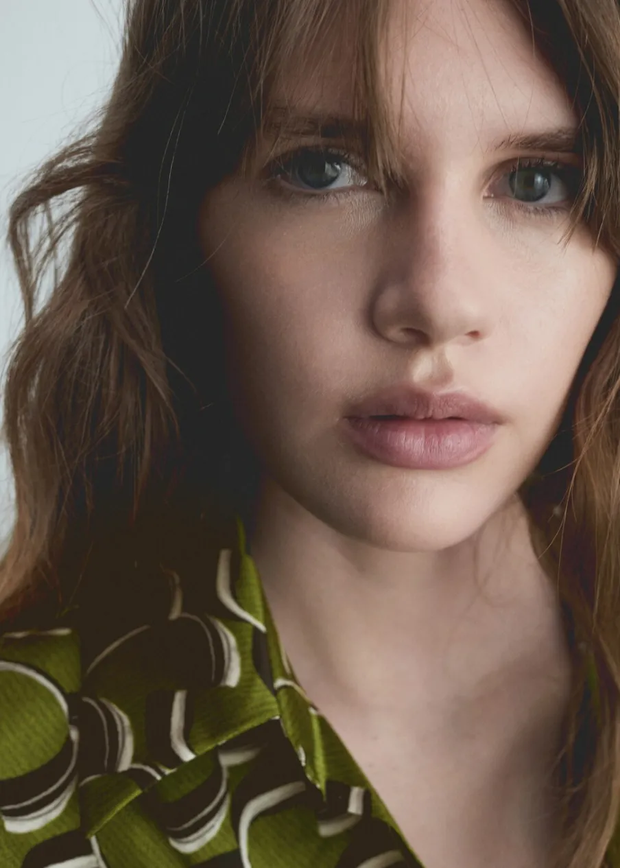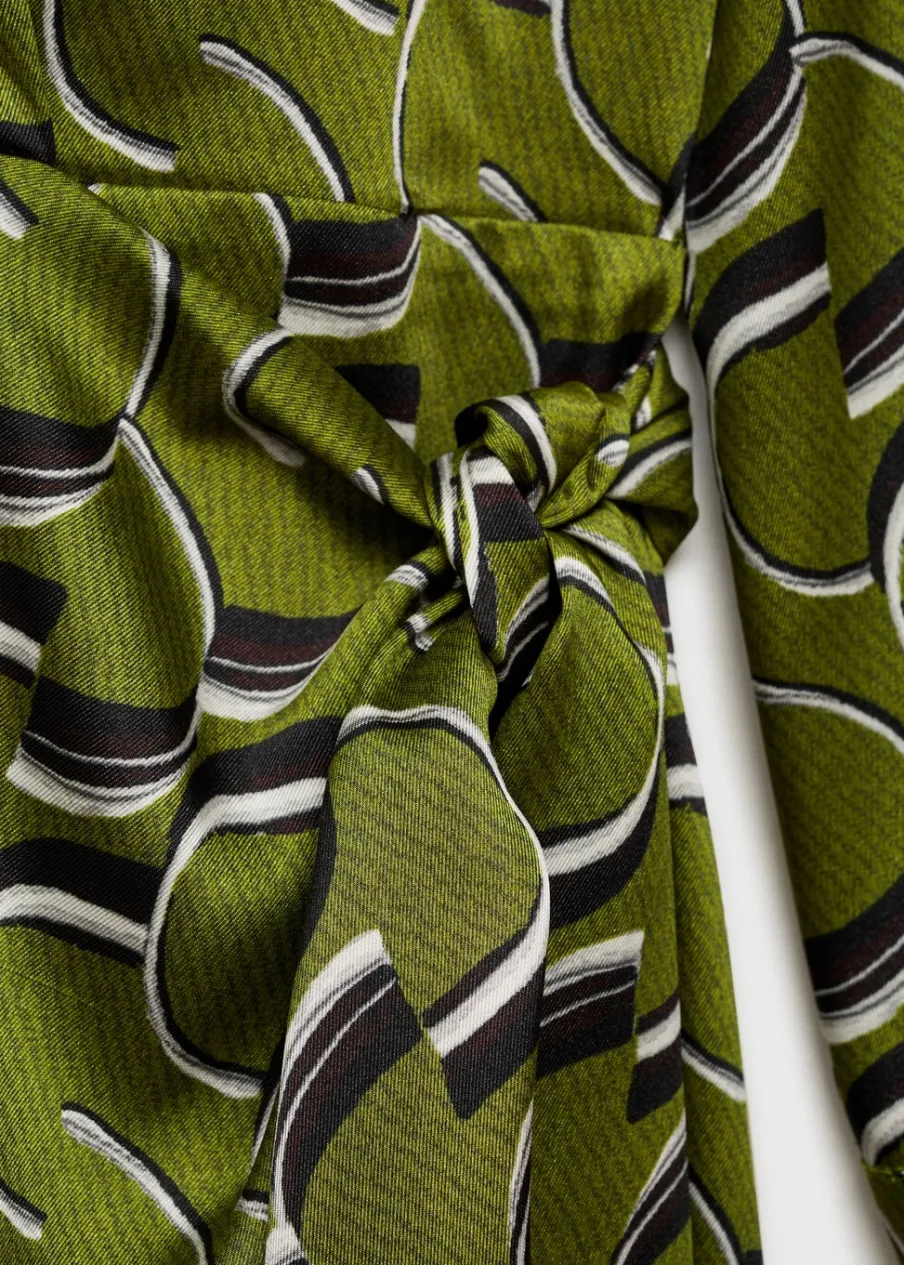 Lejąca tkanina. Satynowa tkanina. Krótki krój. Model prosty. Nadruk. Koszulowy kołnierz. Długi rękaw. Wiązanie z boku. Modelka ma 178 cm wzrostu i nosi rozmiar S/36.