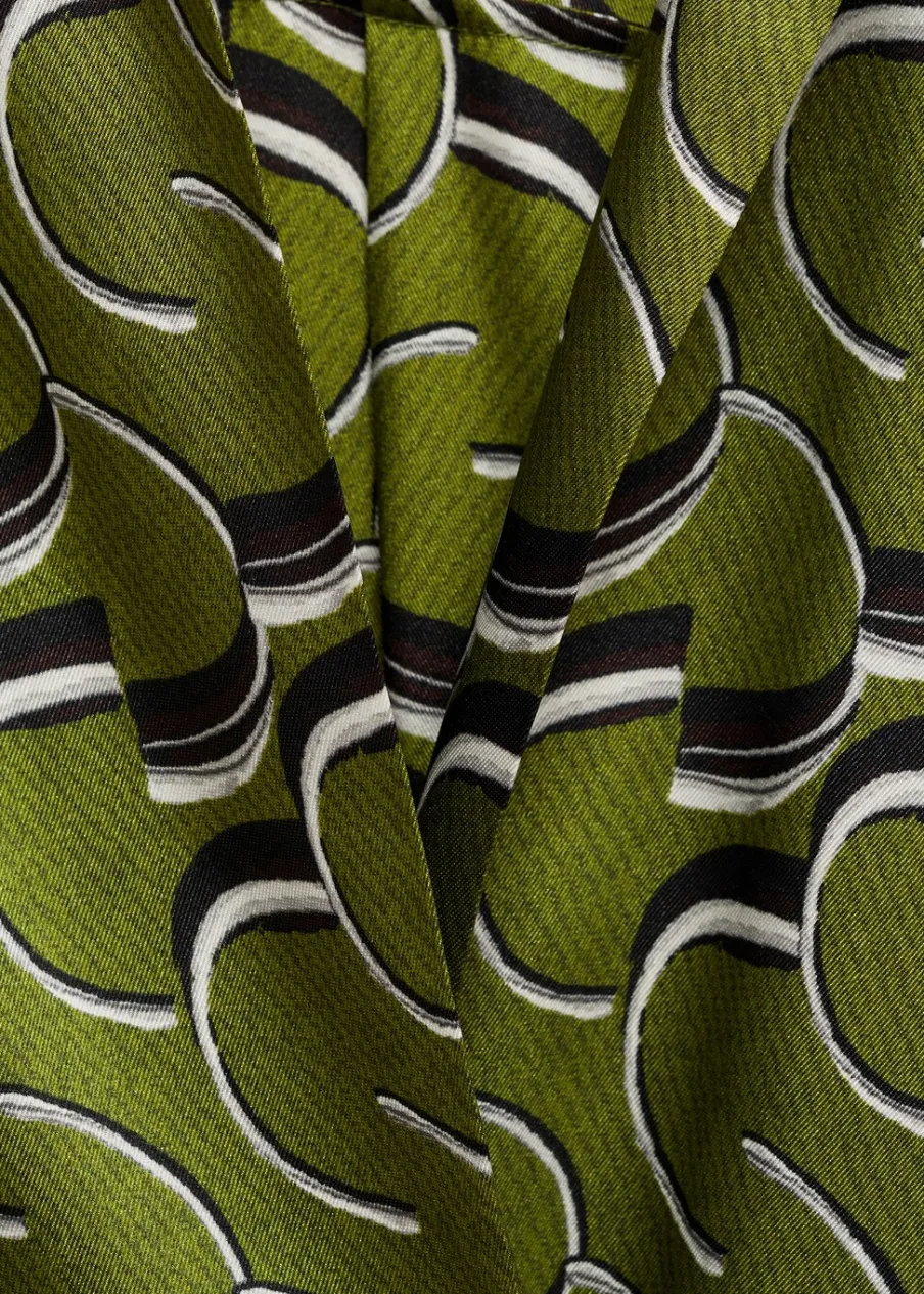 OpisLejąca tkanina. Satynowa tkanina. Krótki krój. Model prosty. Nadruk. Koszulowy kołnierz. Długi rękaw. Wiązani…