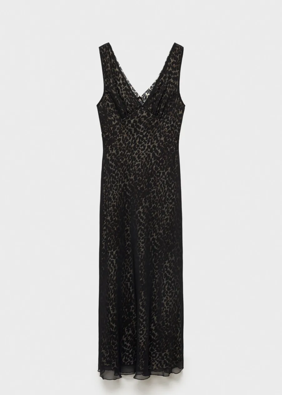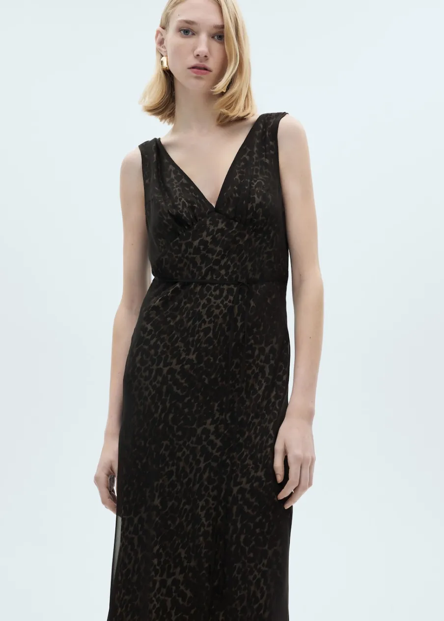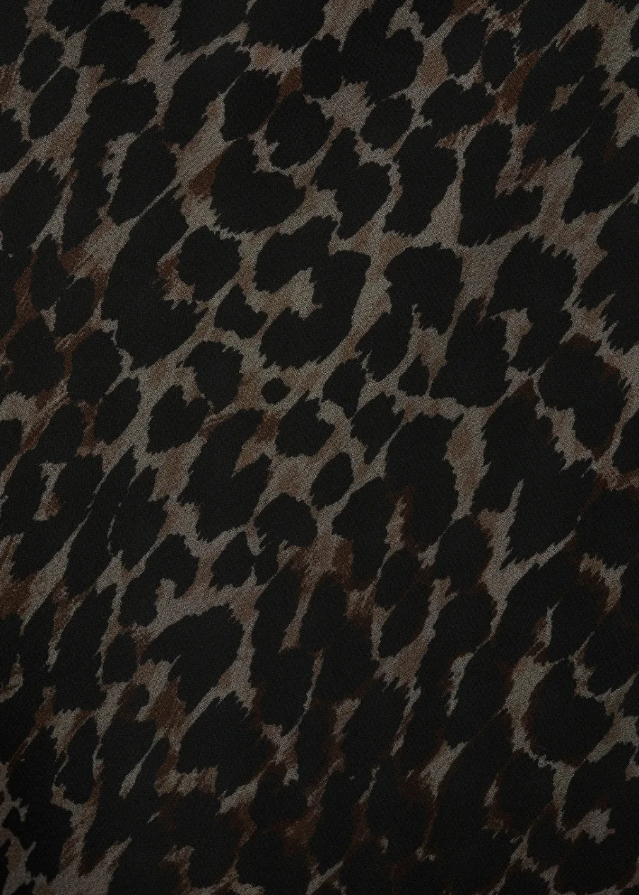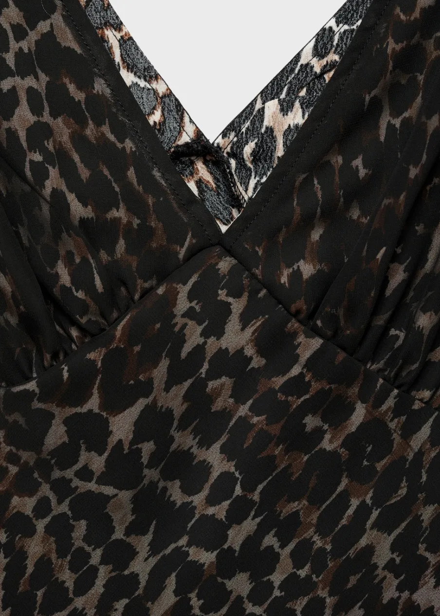 Cienka tkanina. Szyfonowa tkanina. Model evasé. Slim-fit. Dekolt V. Model długi. Zwierzęcy wzór. Wzór w lamparcie cętki. Bez rękawów. Bez zapięcia. Półprzezroczysty szyfon. Tylko podszewka.