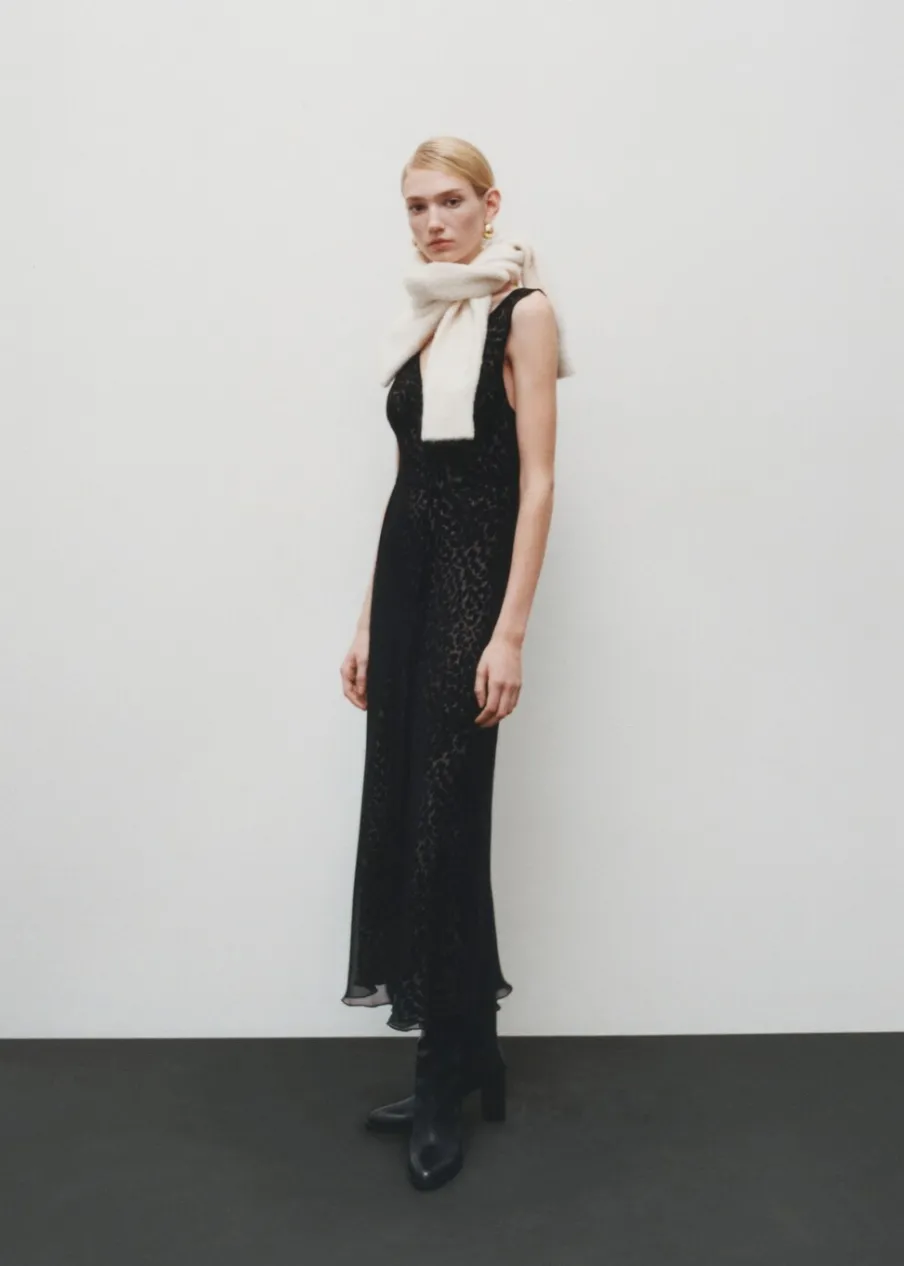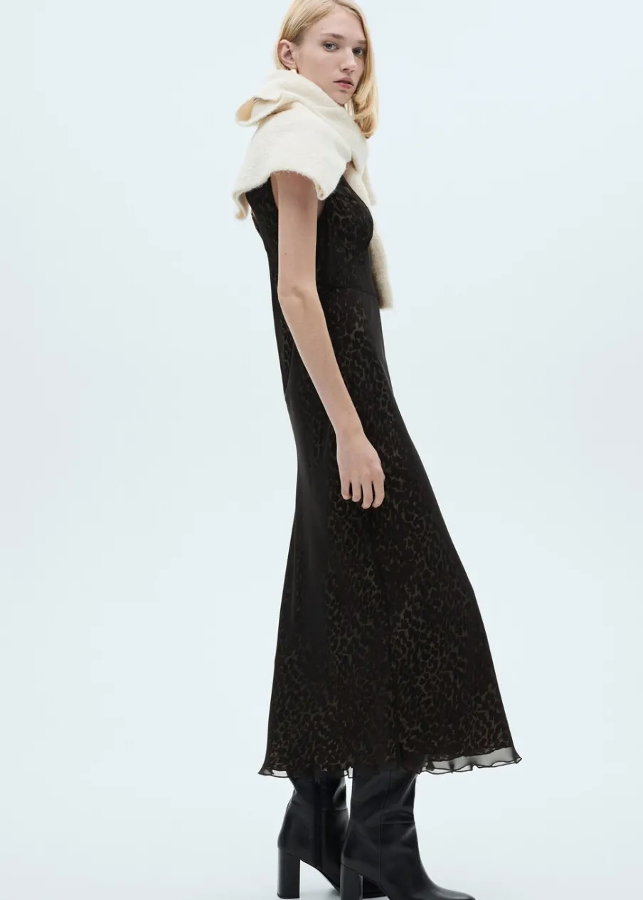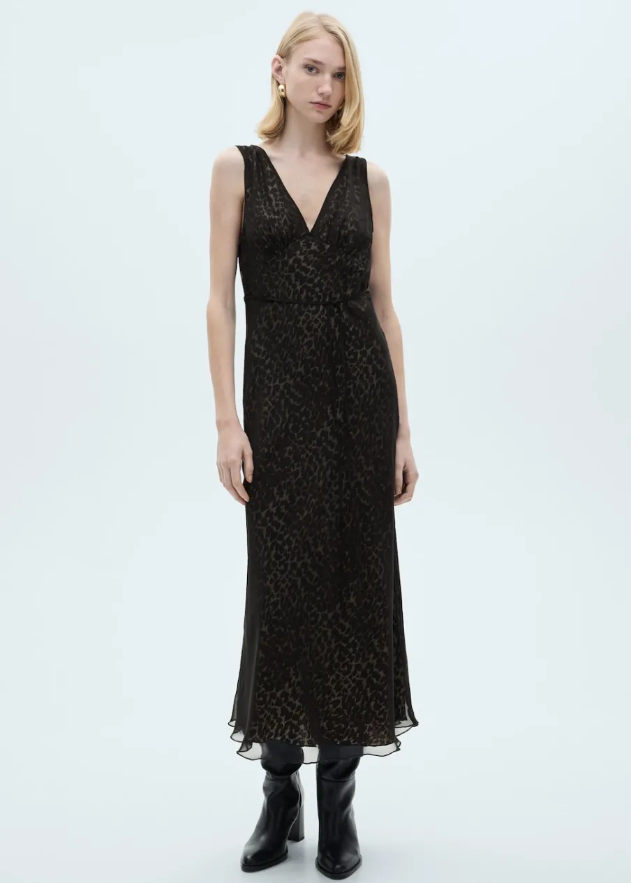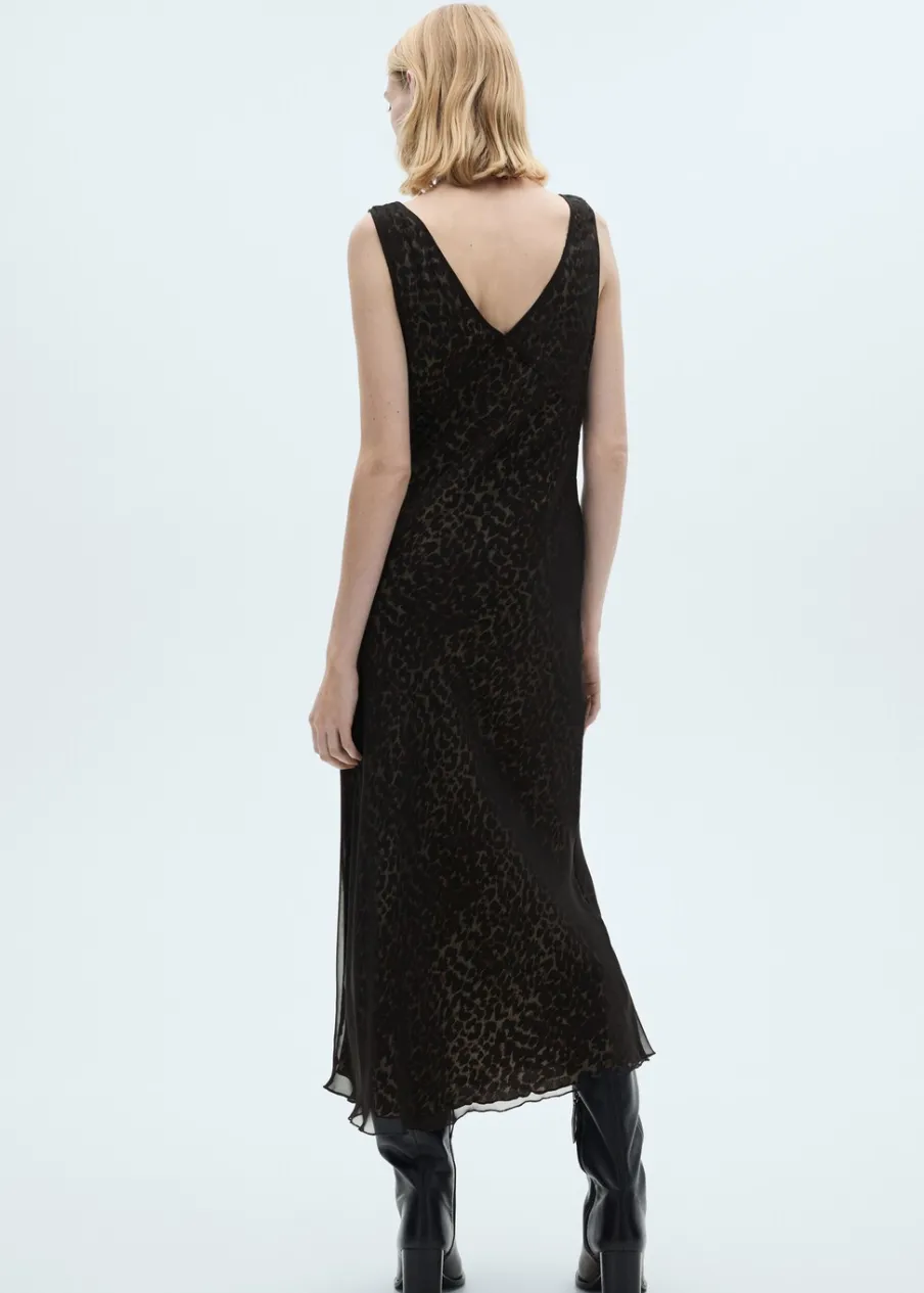 Cienka tkanina. Szyfonowa tkanina. Model evasé. Slim-fit. Dekolt V. Model długi. Zwierzęcy wzór. Wzór w lamparcie cętki. Bez rękawów. Bez zapięcia. Półprzezroczysty szyfon. Tylko podszewka.
