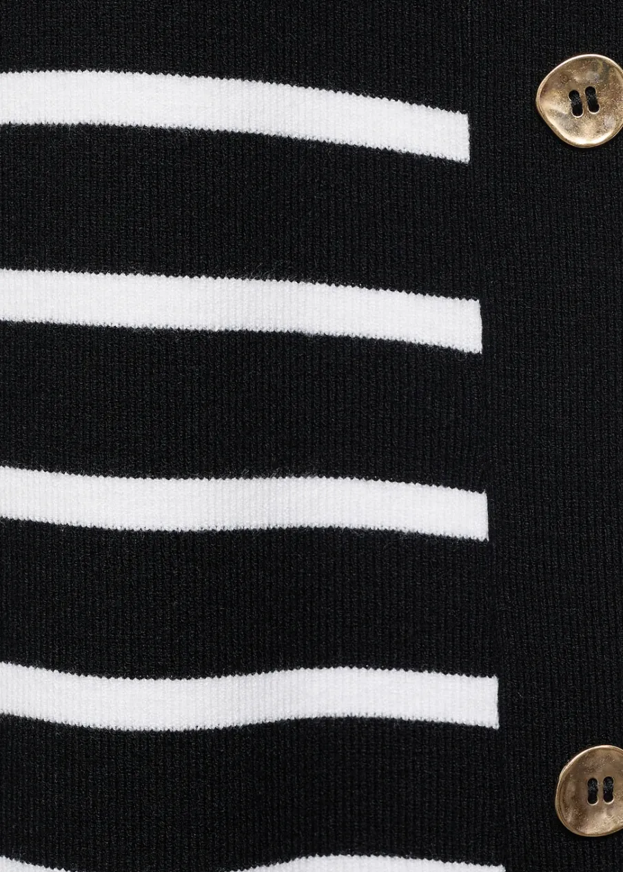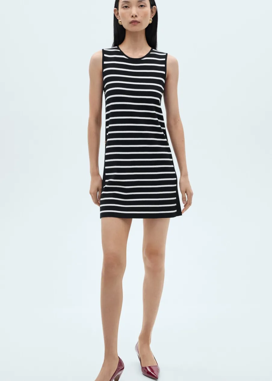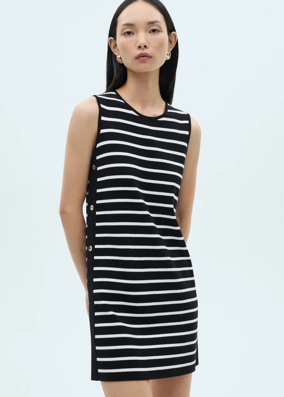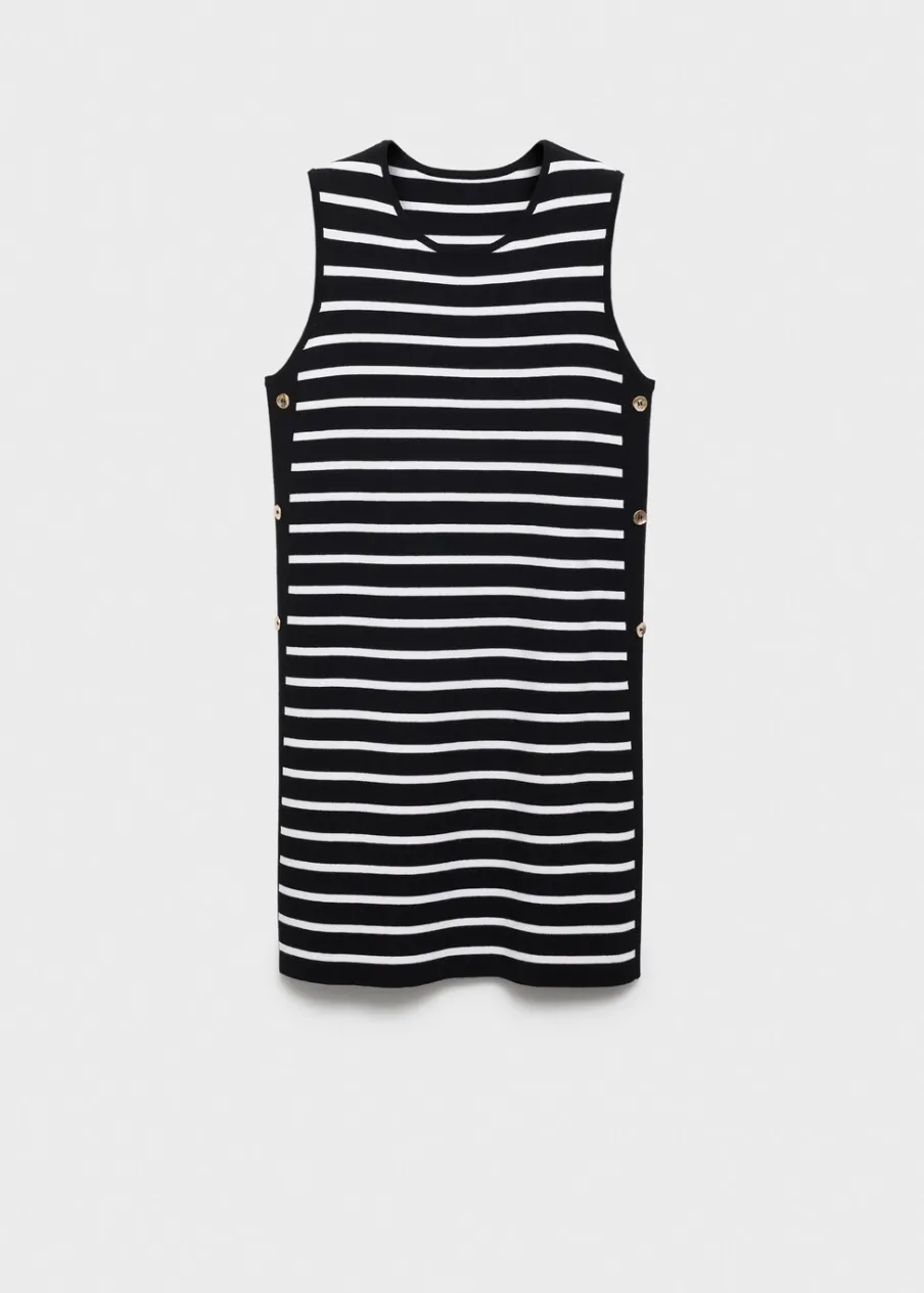 Tkanina z cienkiej dzianiny. Krótki krój. Model prosty. Wzór w pasy. Okrągły dekolt. Szerokie ramiączka. Bez zapięcia. Metalowe guziki po bokach.