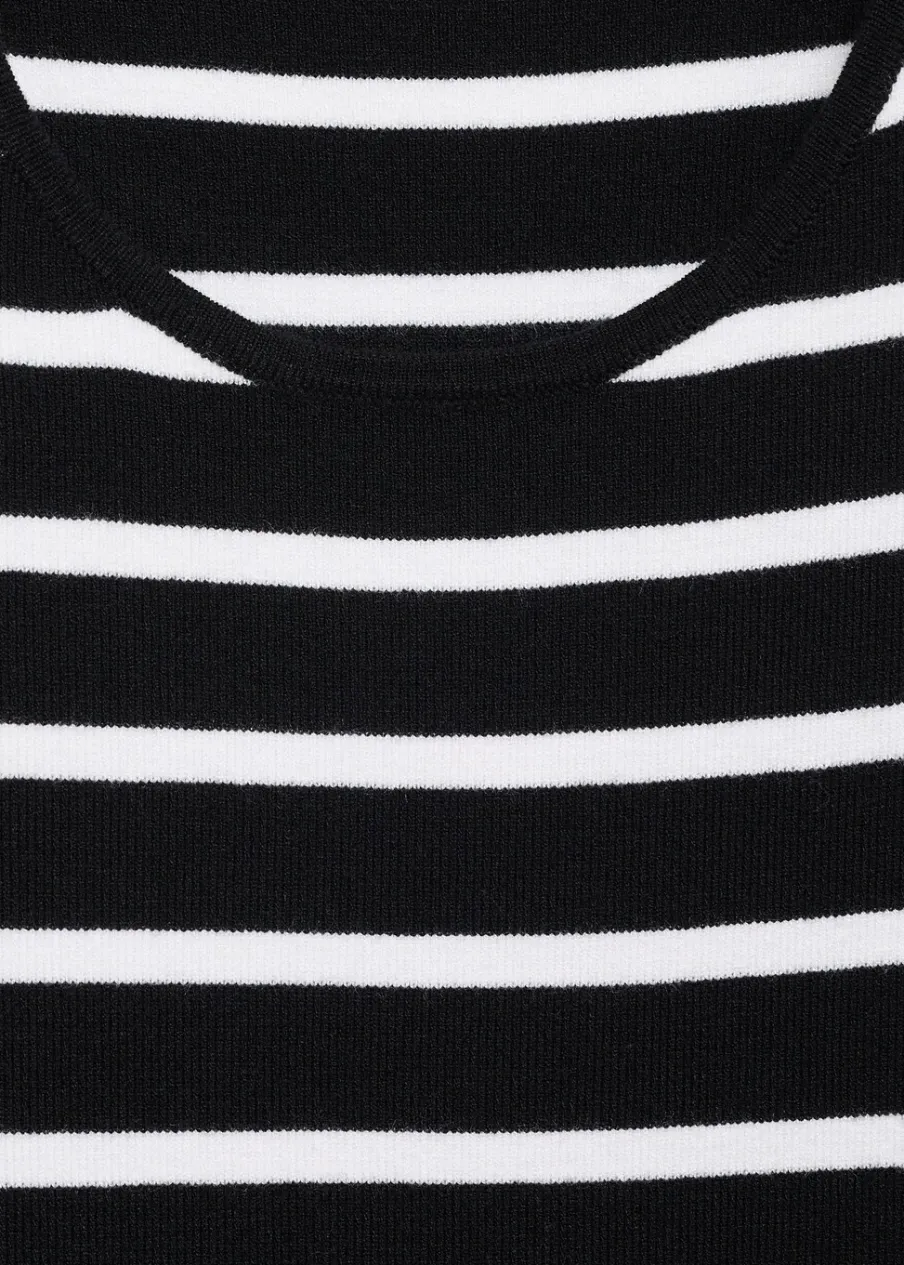 OpisTkanina z cienkiej dzianiny. Krótki krój. Model prosty. Wzór w pasy. Okrągły dekolt. Szerokie ramiączka. Bez z…