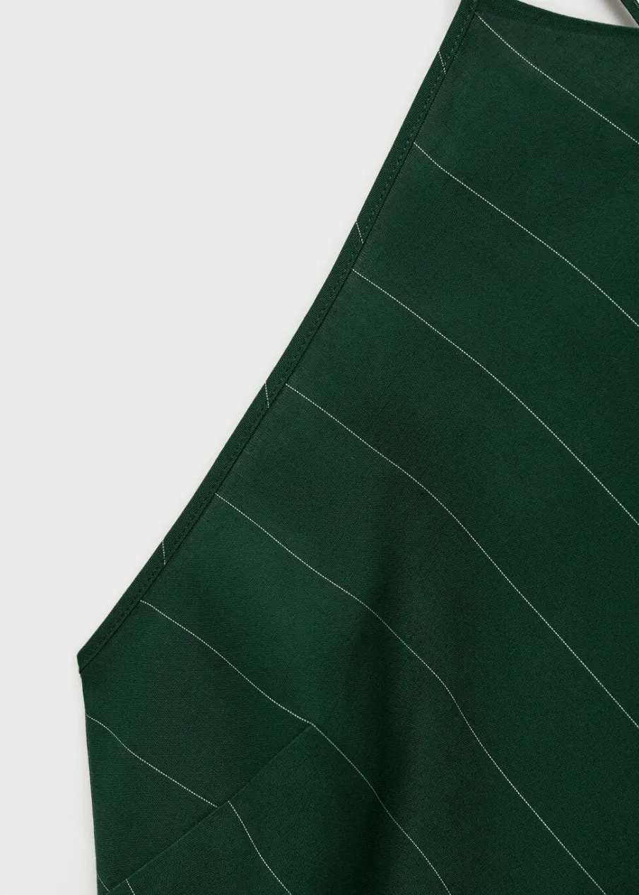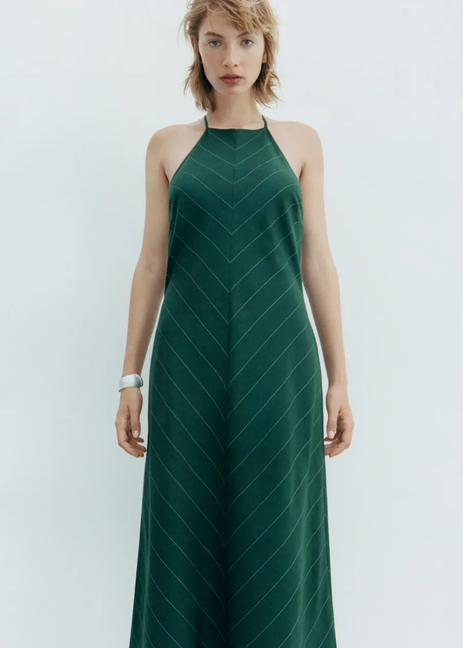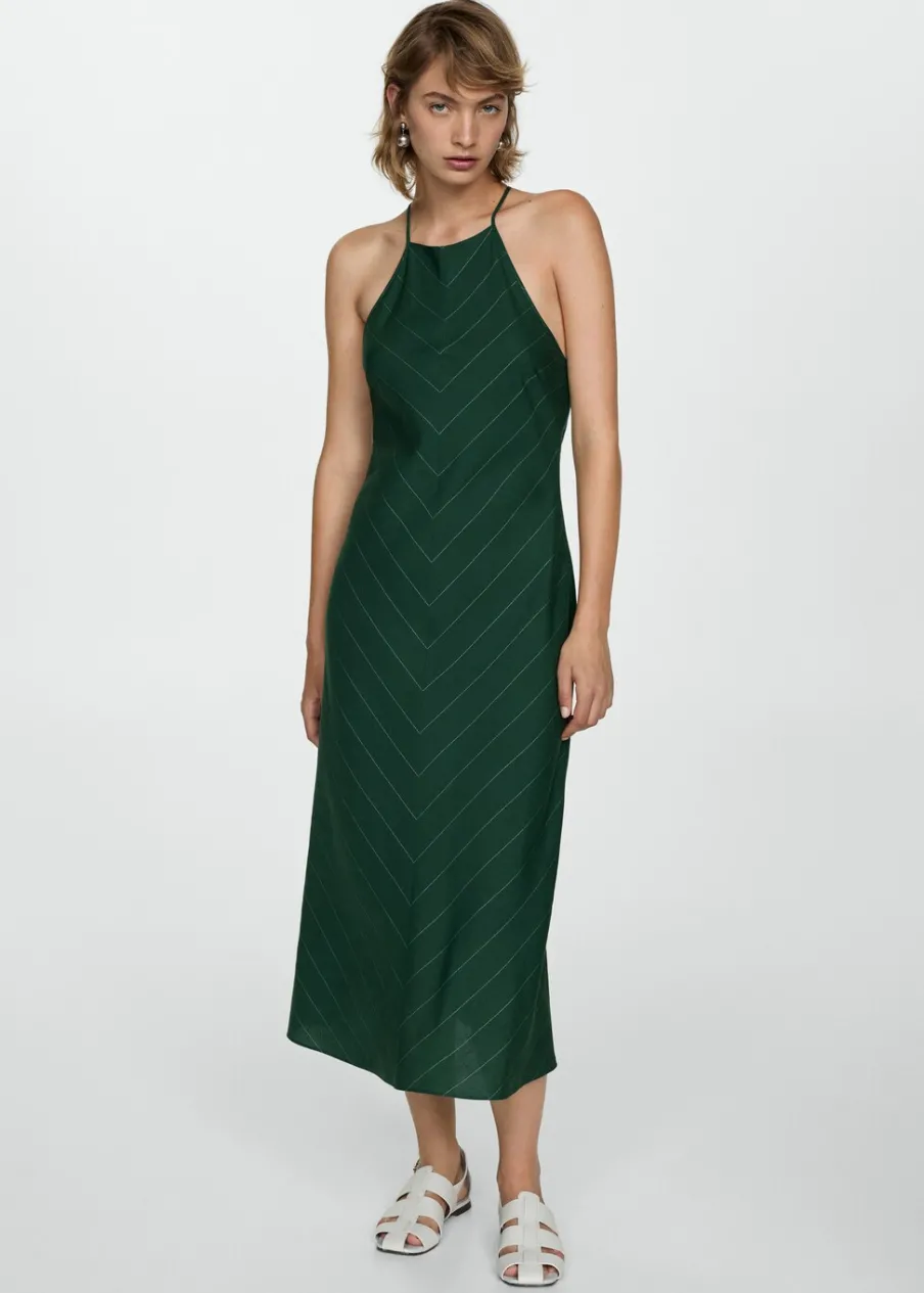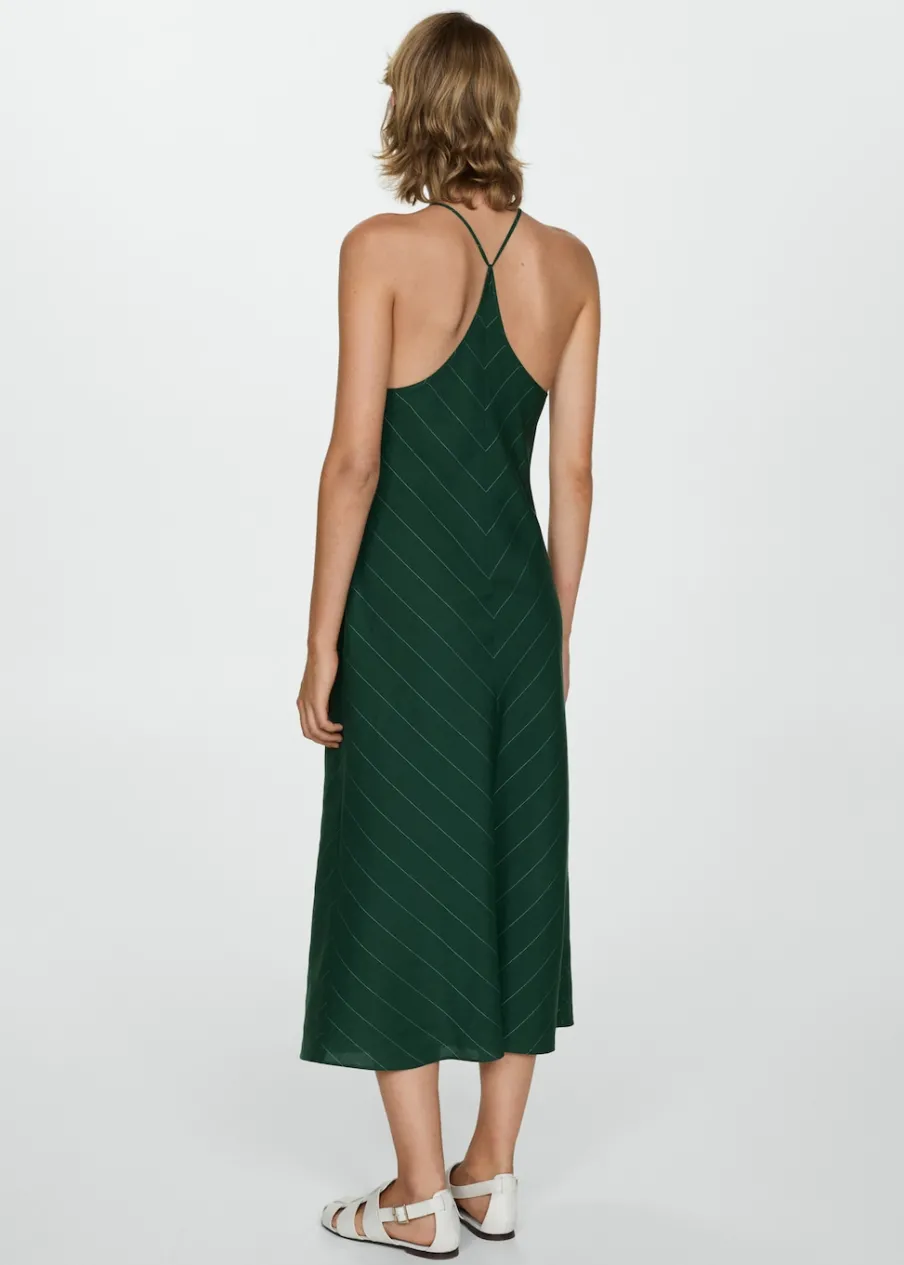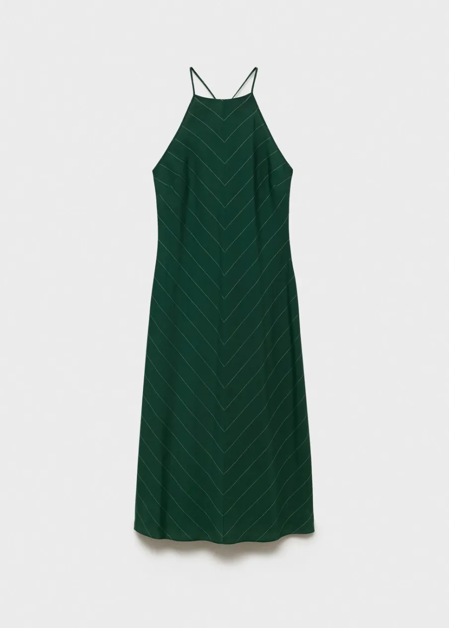 OpisLejąca tkanina. Model długi. Wzór w prążki. Dekolt w stylu halter. Ramiączka. Bez rękawów. Model wcięty.