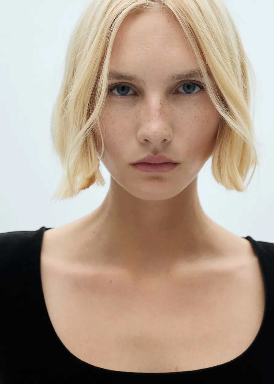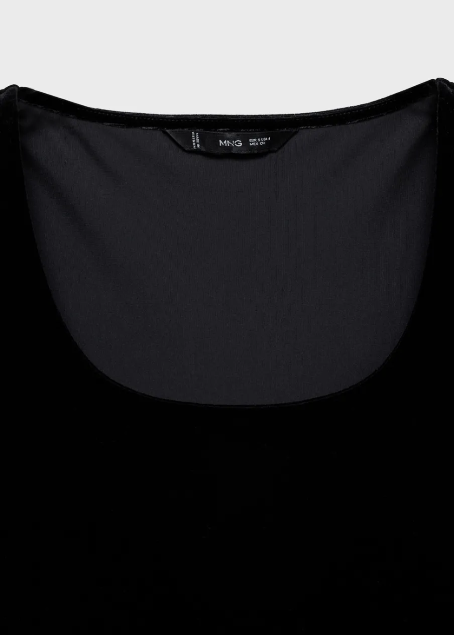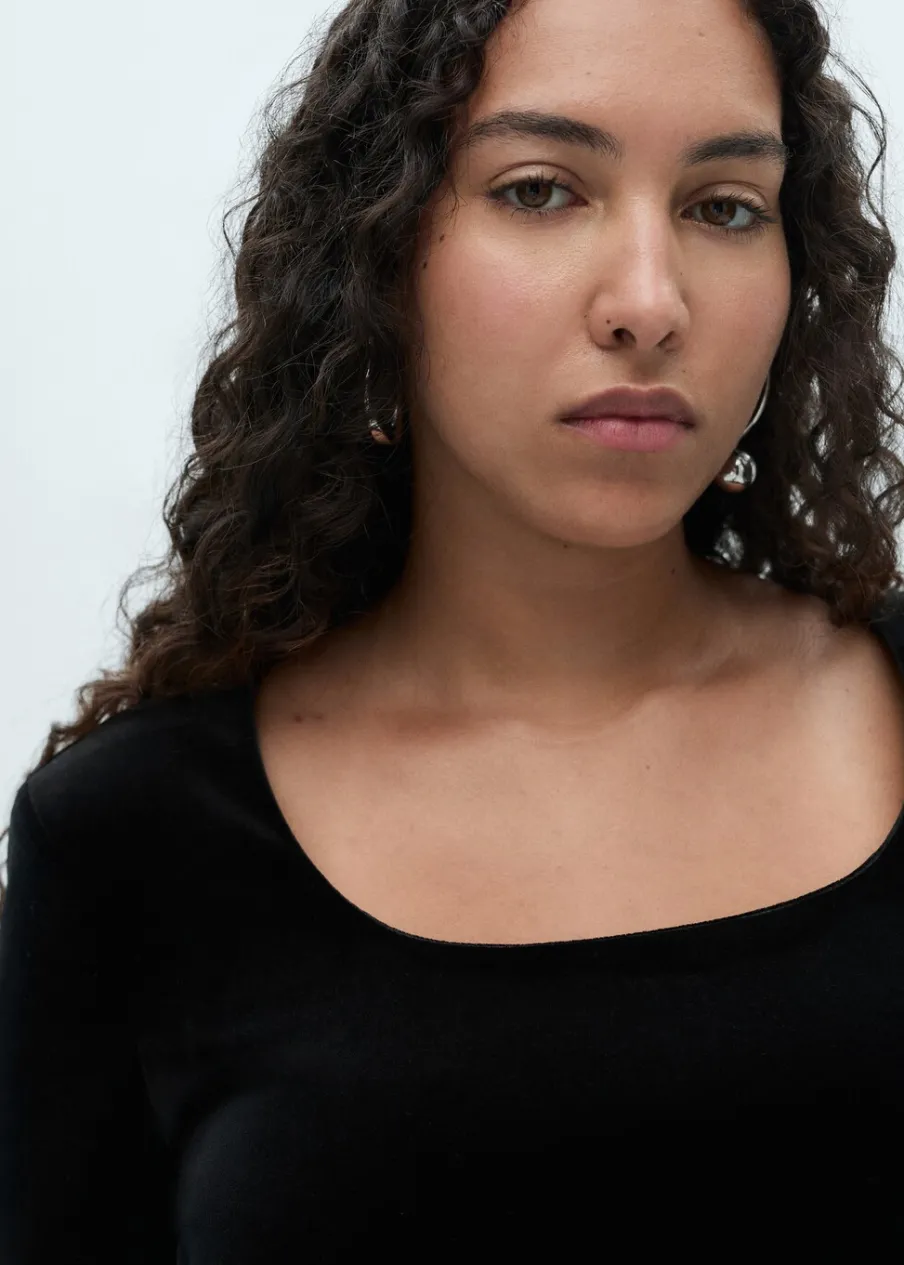 Aksamitna tkanina. Model wcięty. Krótki krój. Dekolt. Długi rękaw. Bez zapięcia. Dostępne w Plus Size. Kolekcja wizytowa. Modelka ma 178 cm wzrostu i nosi rozmiar S/36.