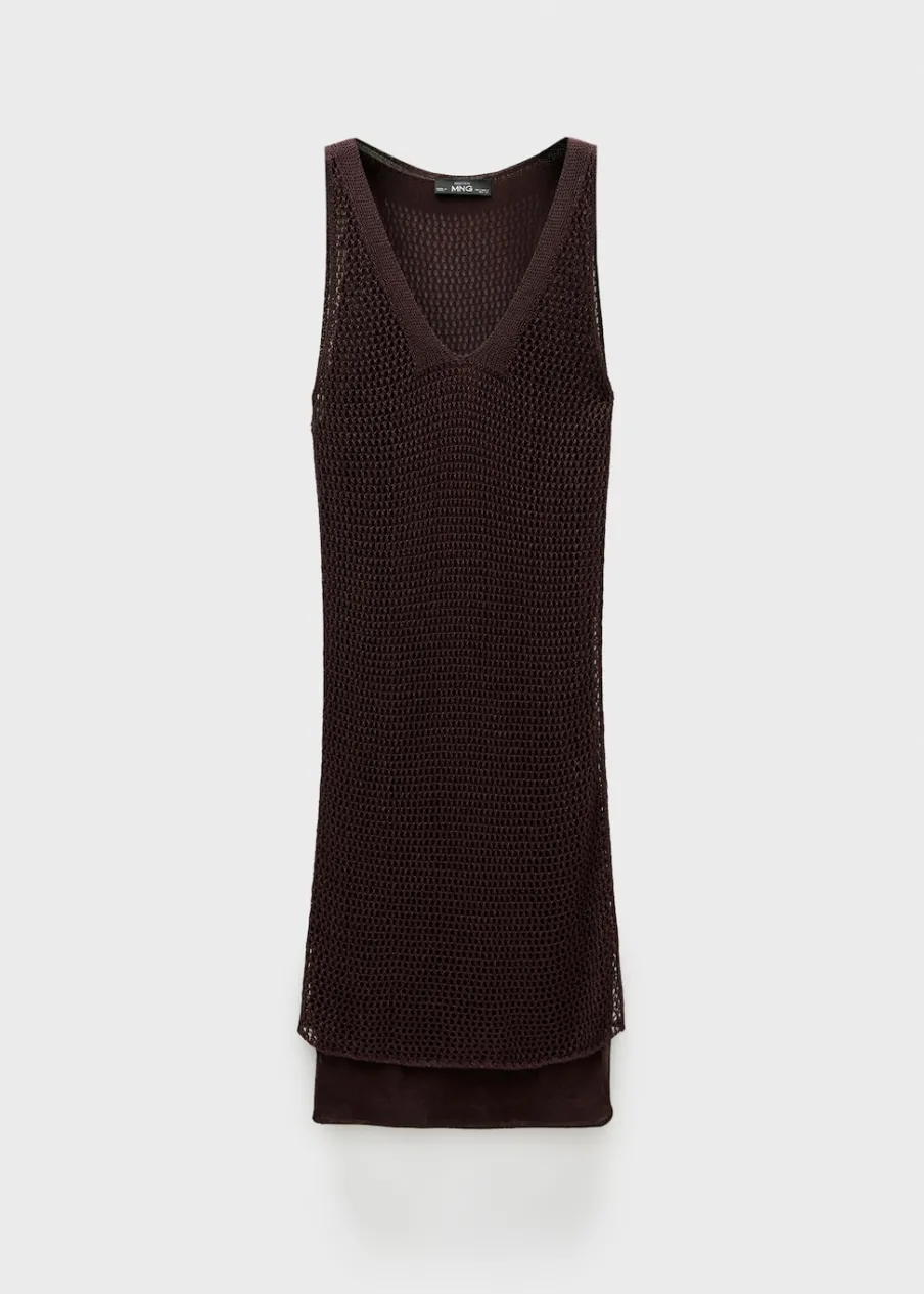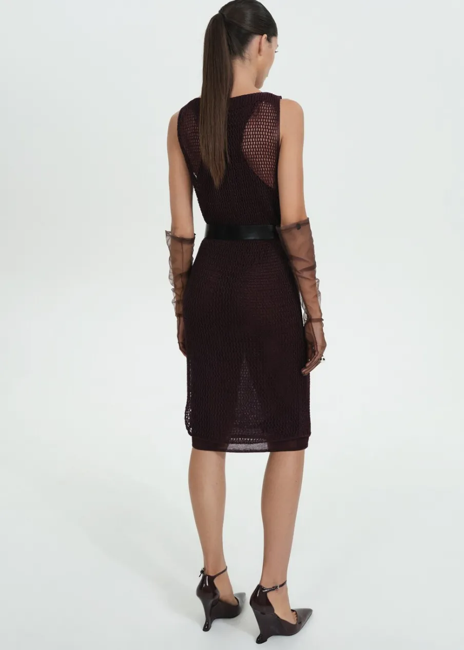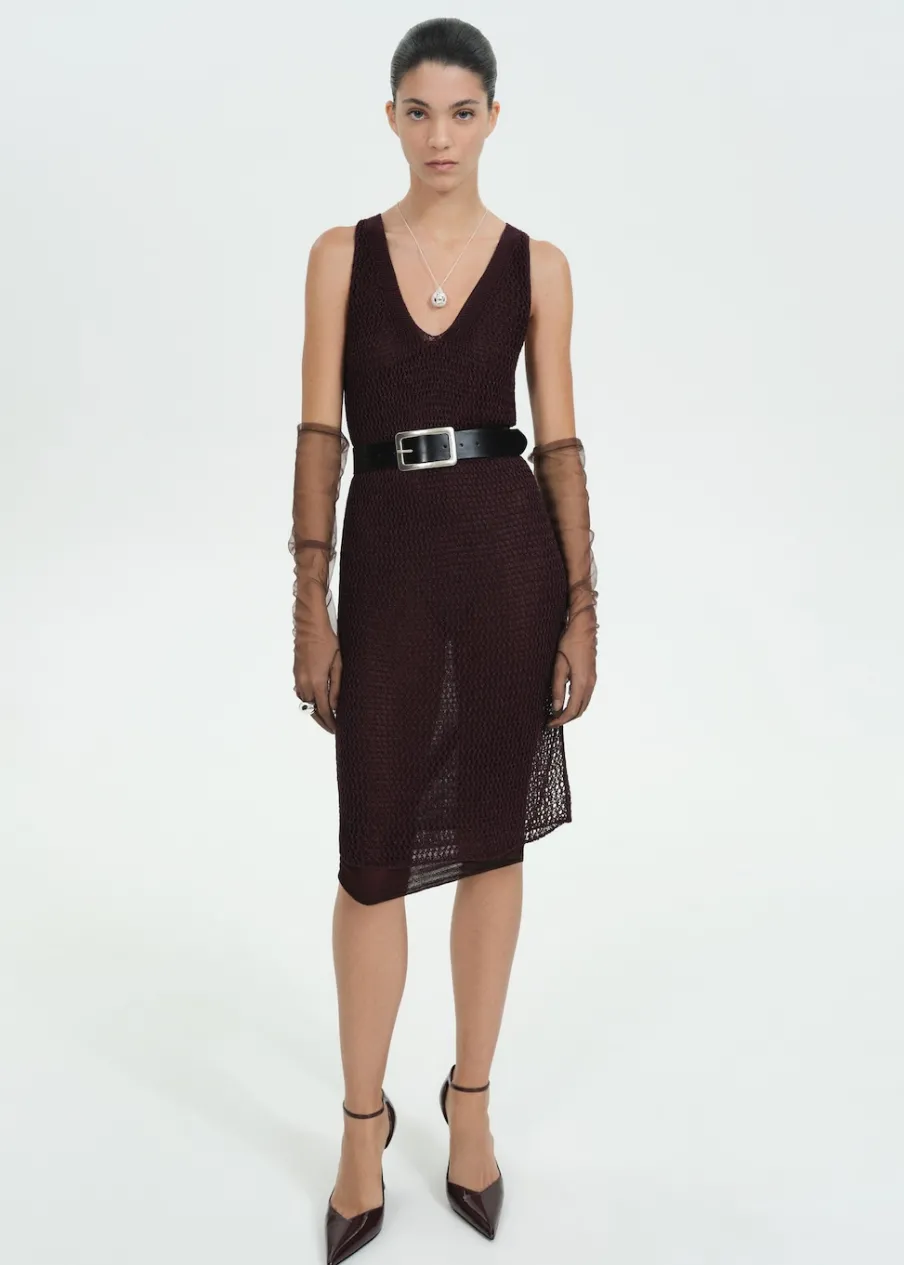 Finom kötésű anyag, Áttört szövet, lurex szövet, midi design, egyenes kialakítás, széles pántok, v-nyakkivágás, a ruhánál hosszabb belső bélés, parti és ünnepi kollekció, selection kollekció, a modell 1,77 cm magas és S/36 méretet visel.
