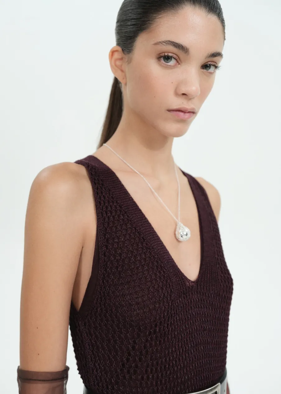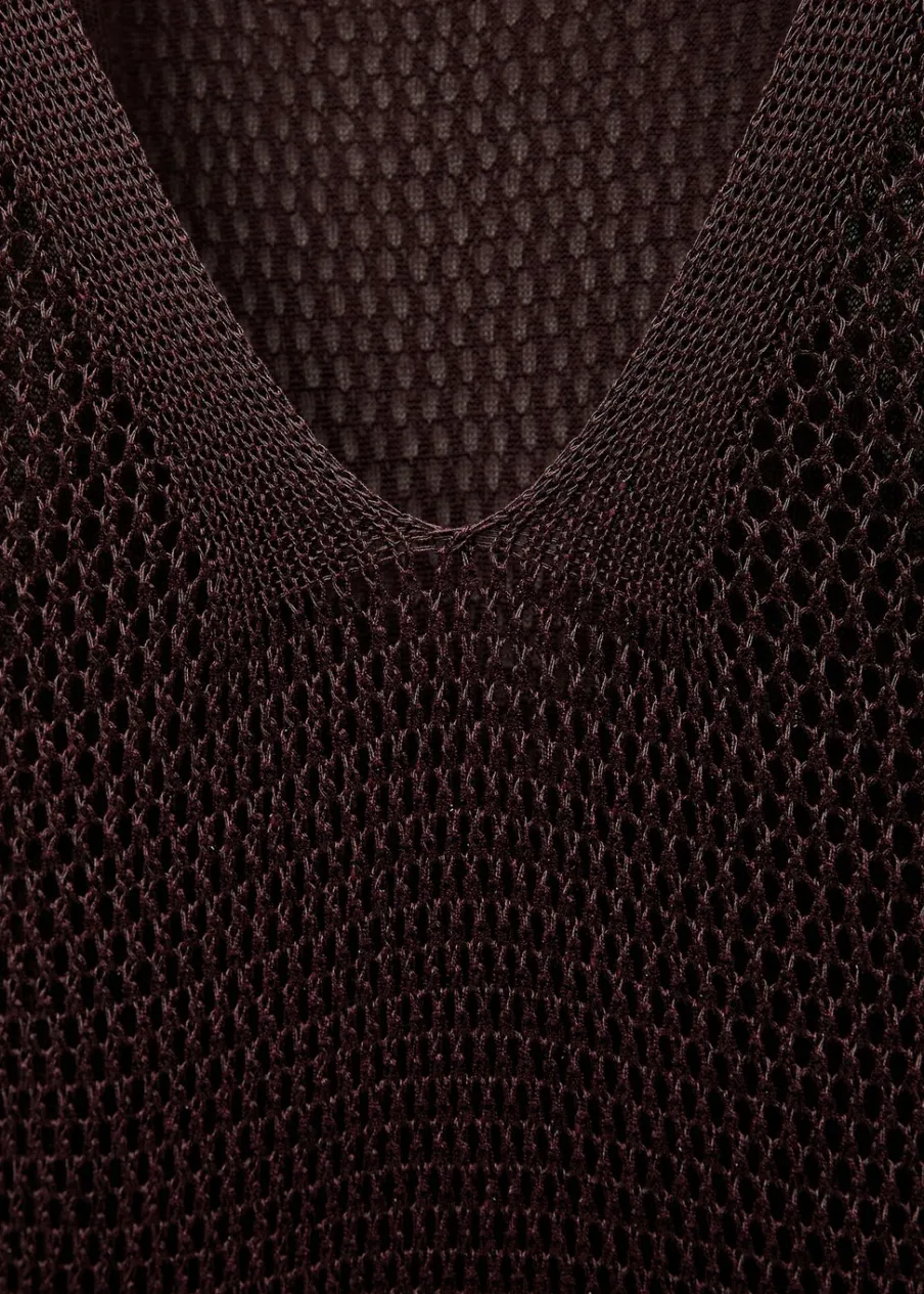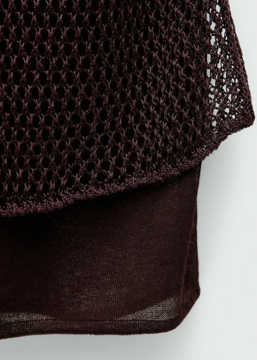 Finom kötésű anyag, Áttört szövet, lurex szövet, midi design, egyenes kialakítás, széles pántok, v-nyakkivágás, a ruhánál hosszabb belső bélés, parti és ünnepi kollekció, selection kollekció, a modell 1,77 cm magas és S/36 méretet visel.