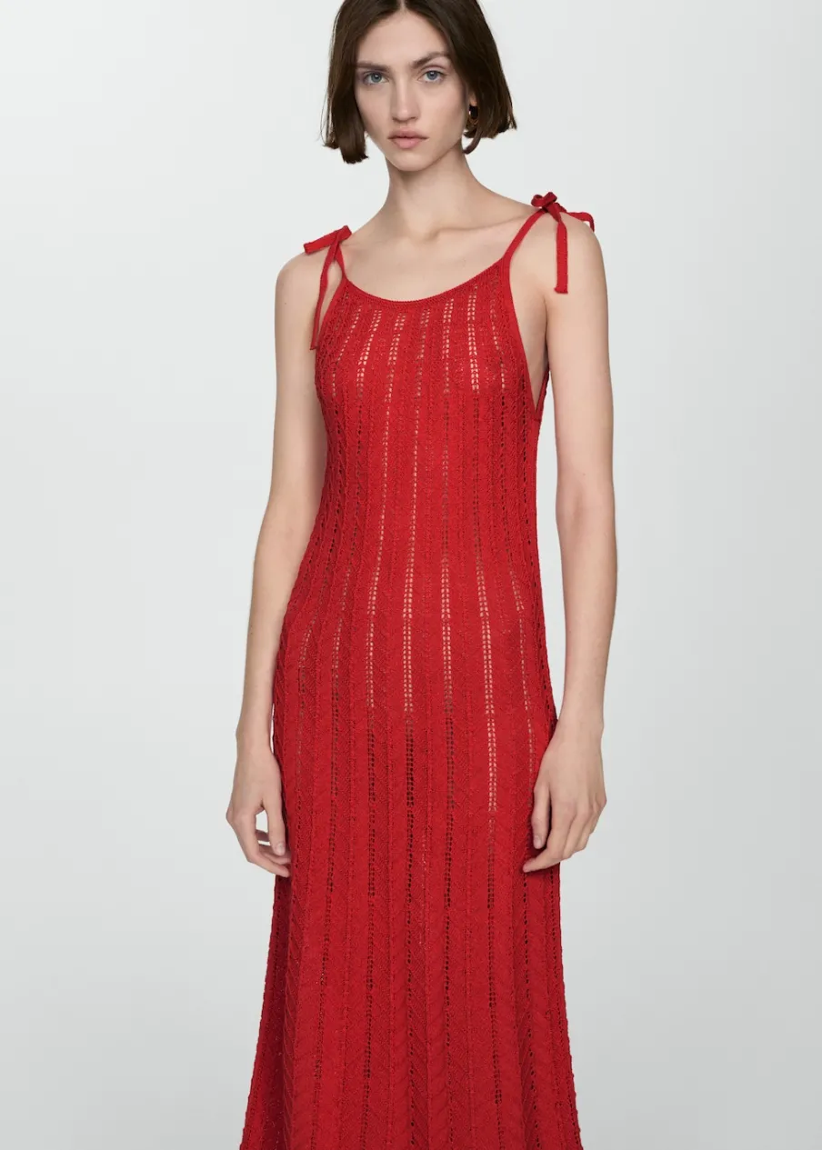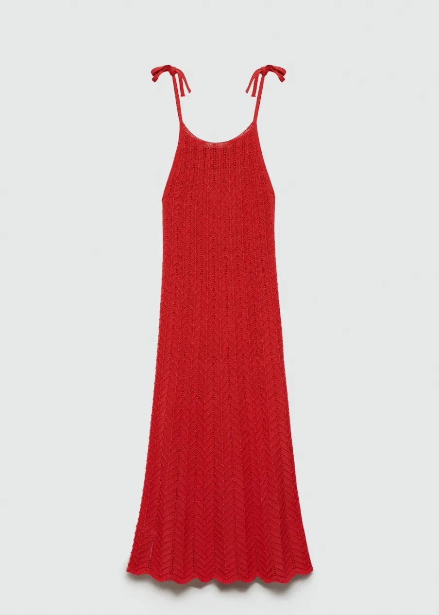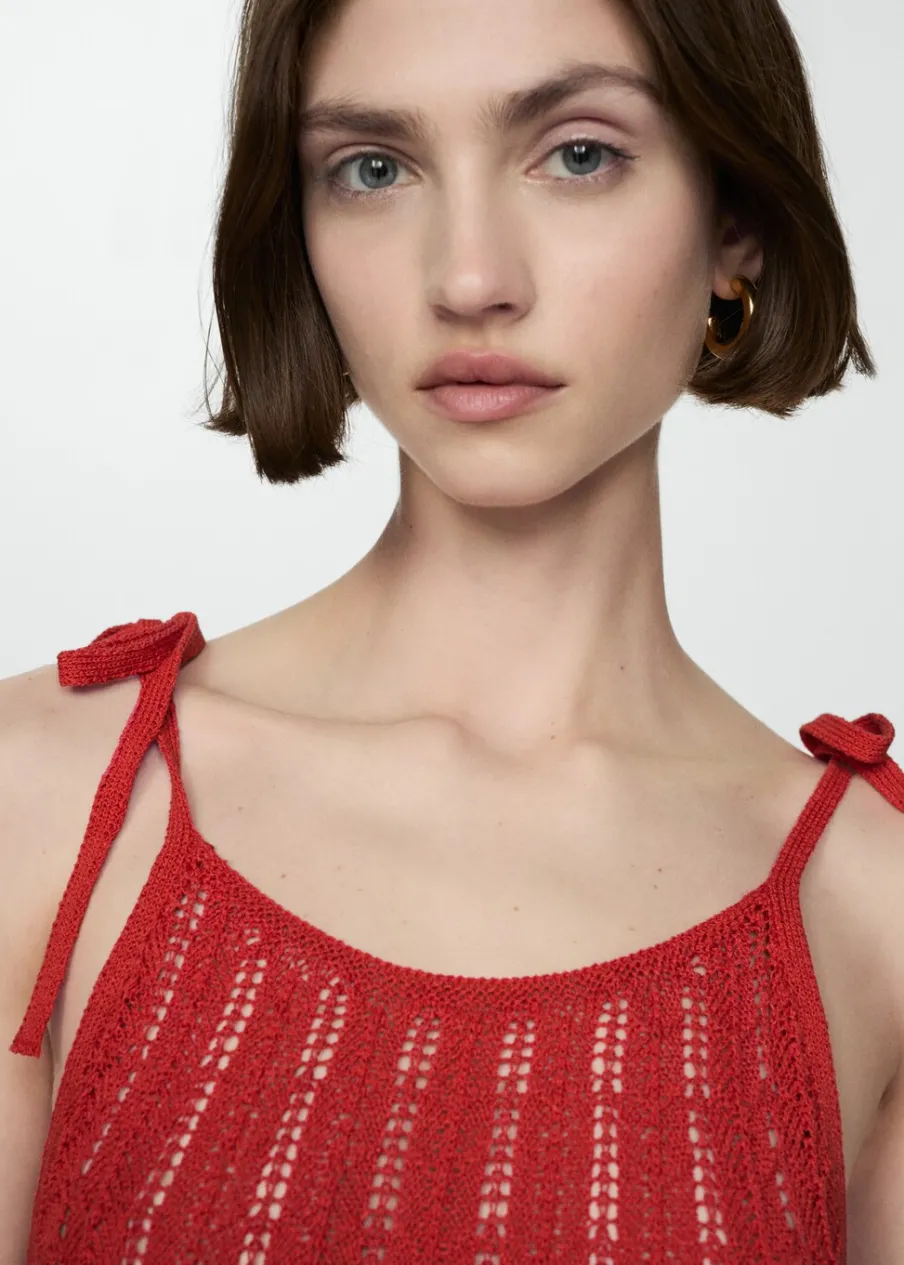 Tkanina mieszanka bawełny. Ażurowa dzianina. Dzianina średniej grubości. Krój do kolan. Model evasé. Okrągły dekolt. Bez rękawów. Cienkie ramiączka. Ramiączka wiązane na kokardki. Bez podszewki.