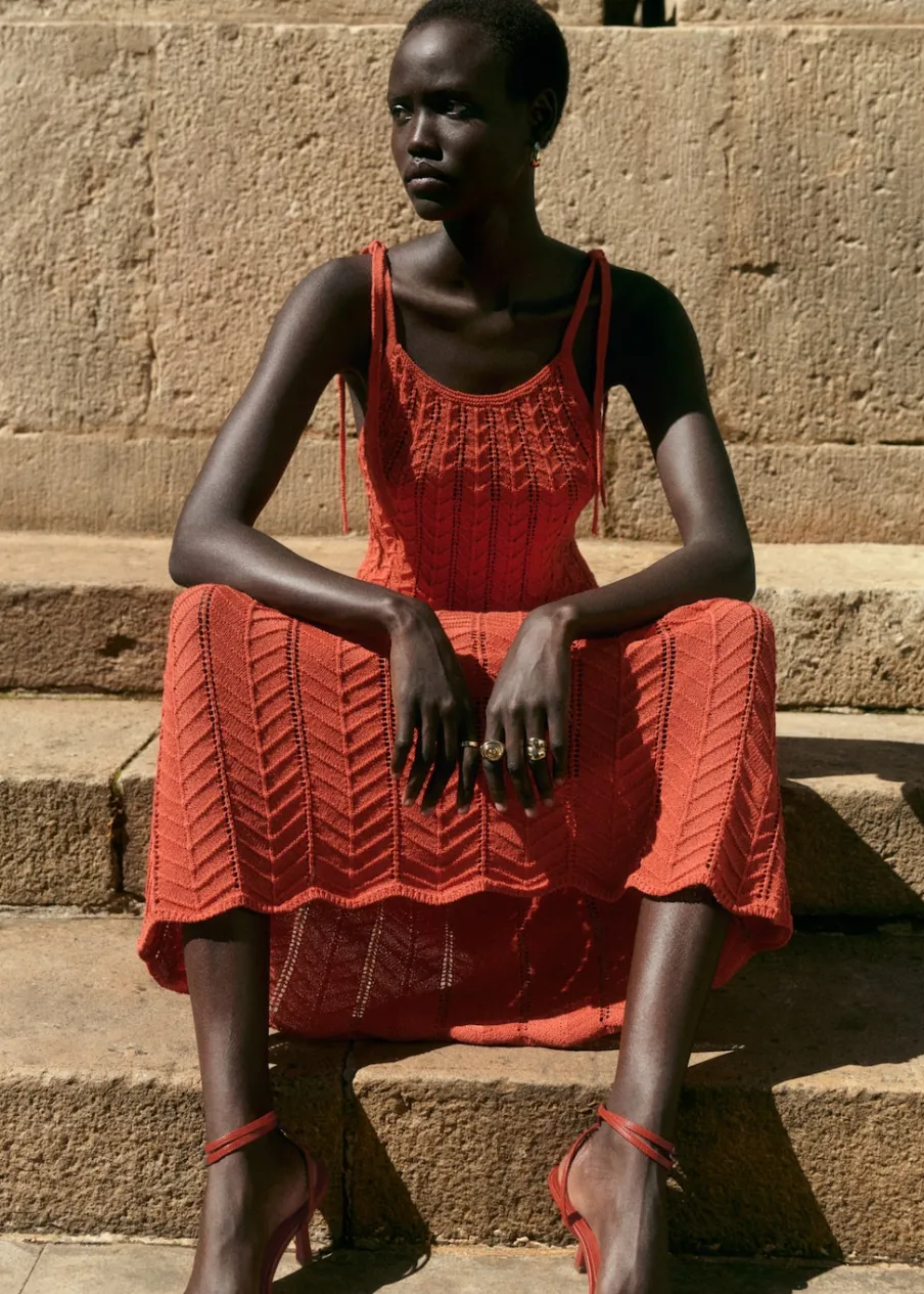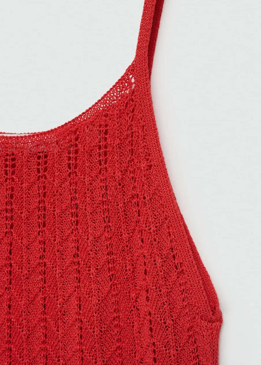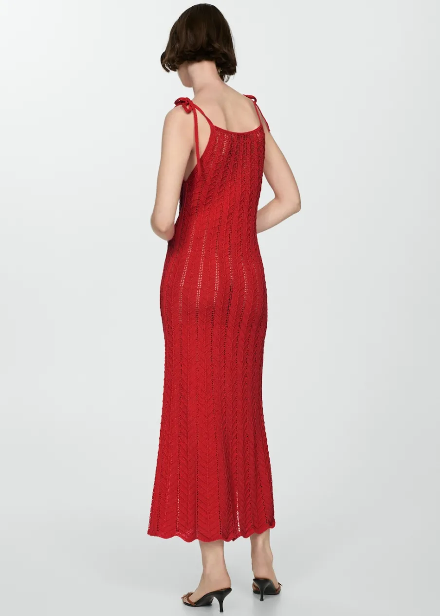 Tkanina mieszanka bawełny. Ażurowa dzianina. Dzianina średniej grubości. Krój do kolan. Model evasé. Okrągły dekolt. Bez rękawów. Cienkie ramiączka. Ramiączka wiązane na kokardki. Bez podszewki.