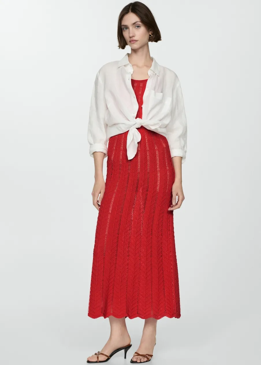 OpisTkanina mieszanka bawełny. Ażurowa dzianina. Dzianina średniej grubości. Krój do kolan. Model evasé. Okrągły…
