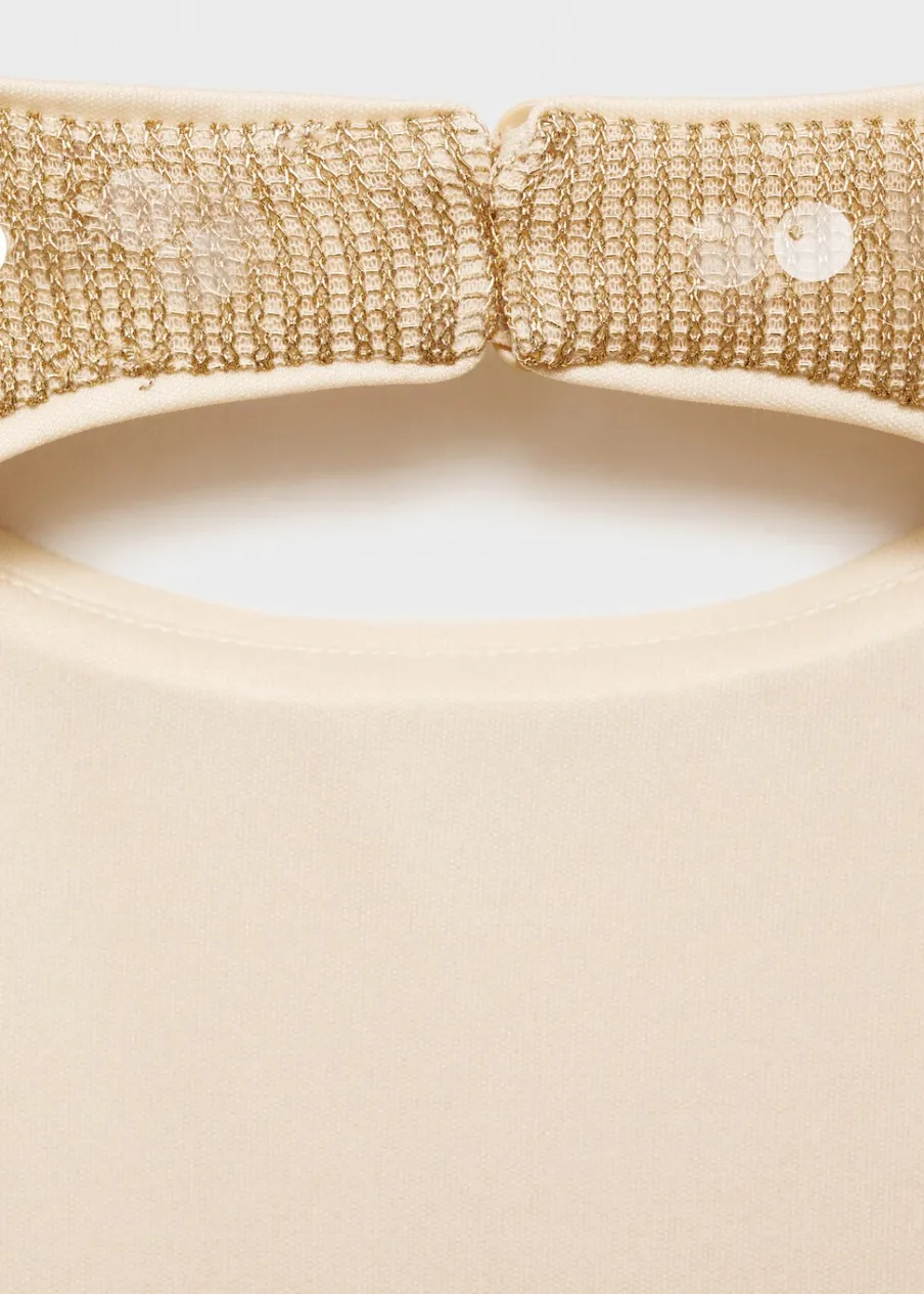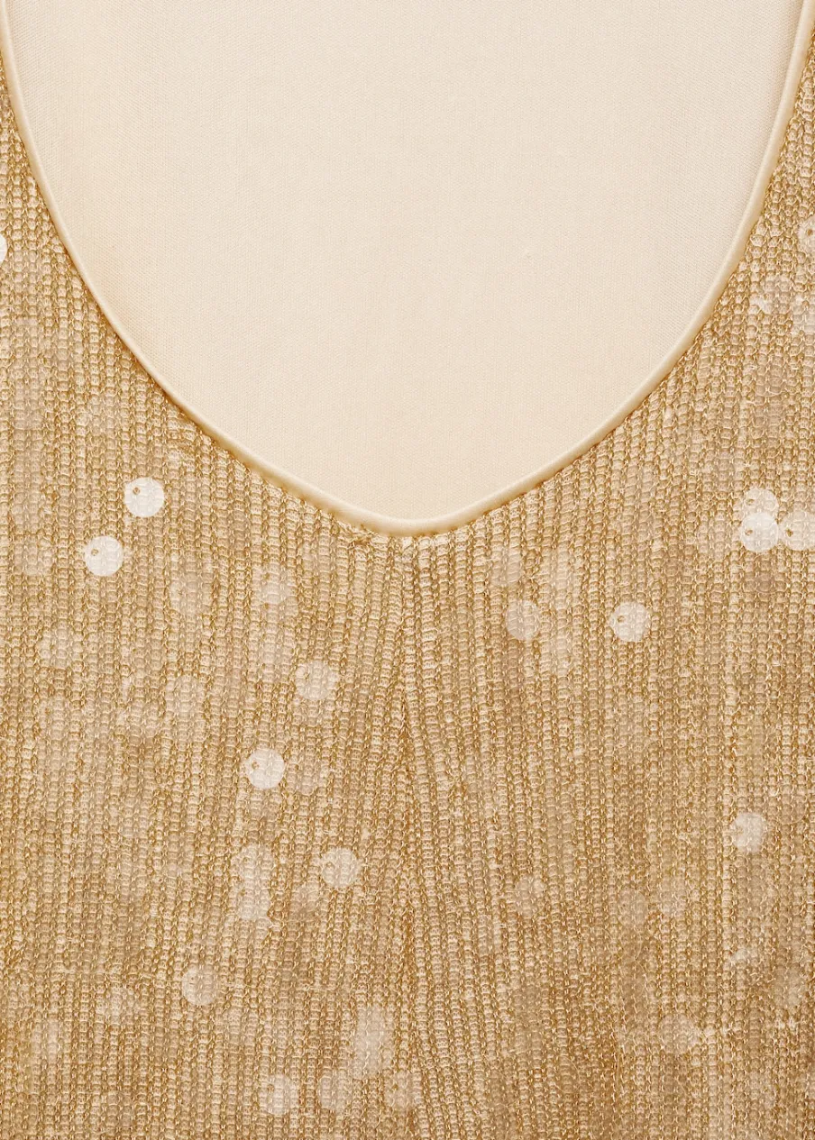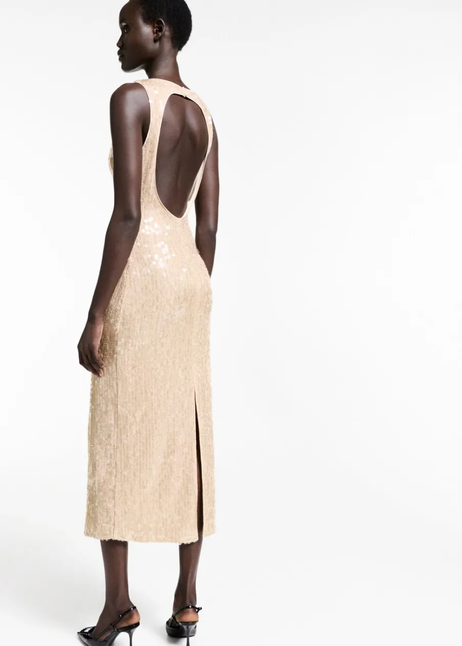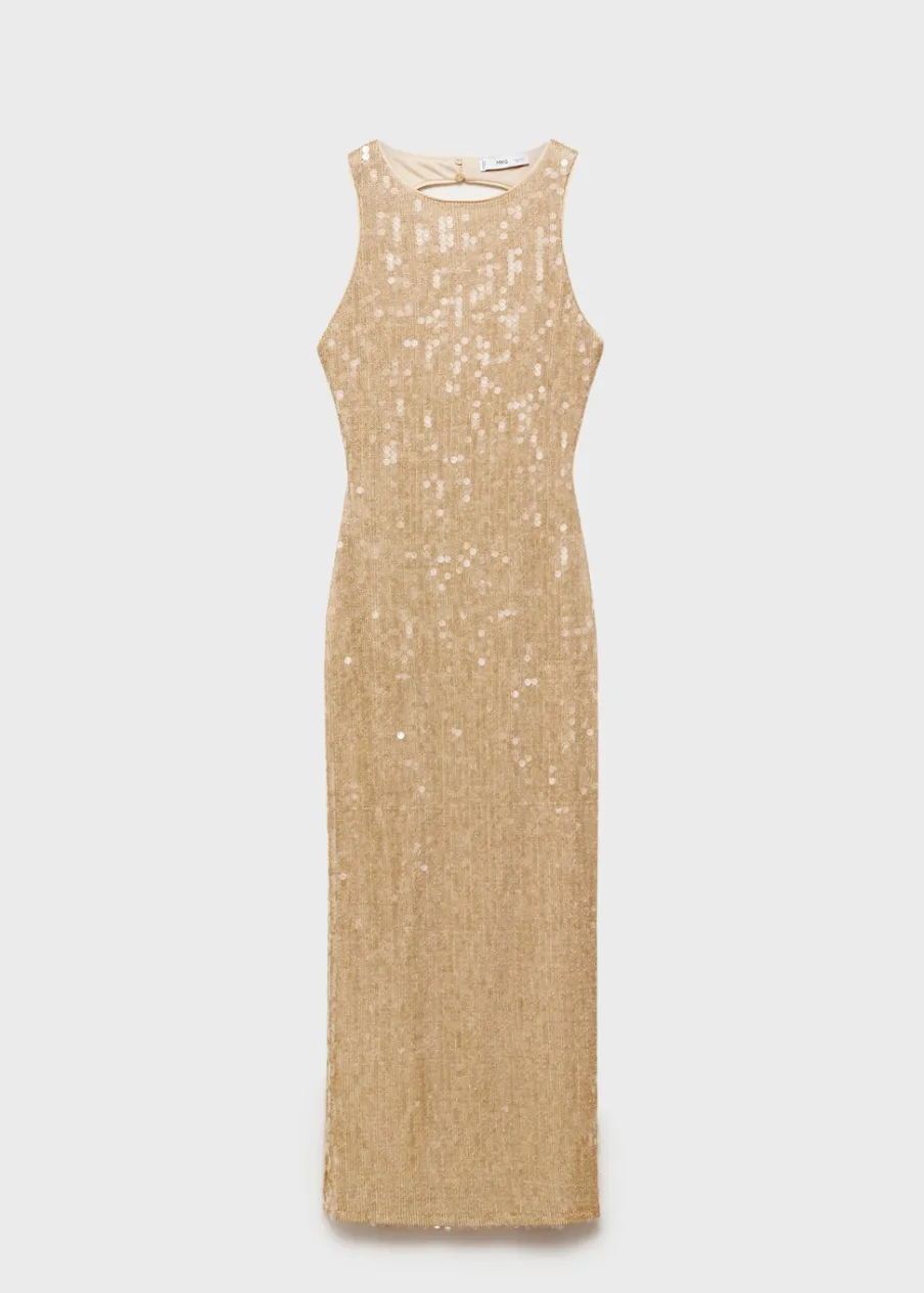 Tkanina z cekinami. Model prosty. Model długi. Dekolt w stylu halter. Szerokie ramiączka. Bez rękawów. Plecy z wycięciem. Zapięcie na guziki przy szyi. Wewnętrzna podszewka. Modelka ma 178 cm wzrostu i nosi rozmiar S/36. Kolekcja wizytowa.