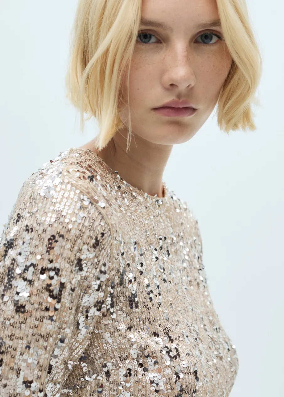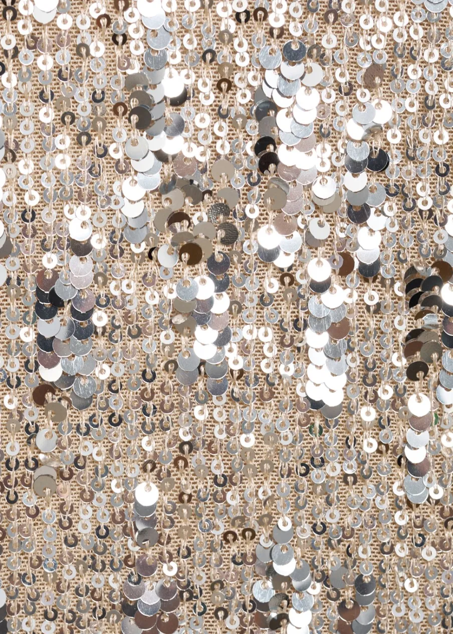 OpisCekinowa tkanina. Krótki krój. Model wcięty. Okrągły dekolt. Długi rękaw. Zapięcie z tyłu na kryty suwak. P…